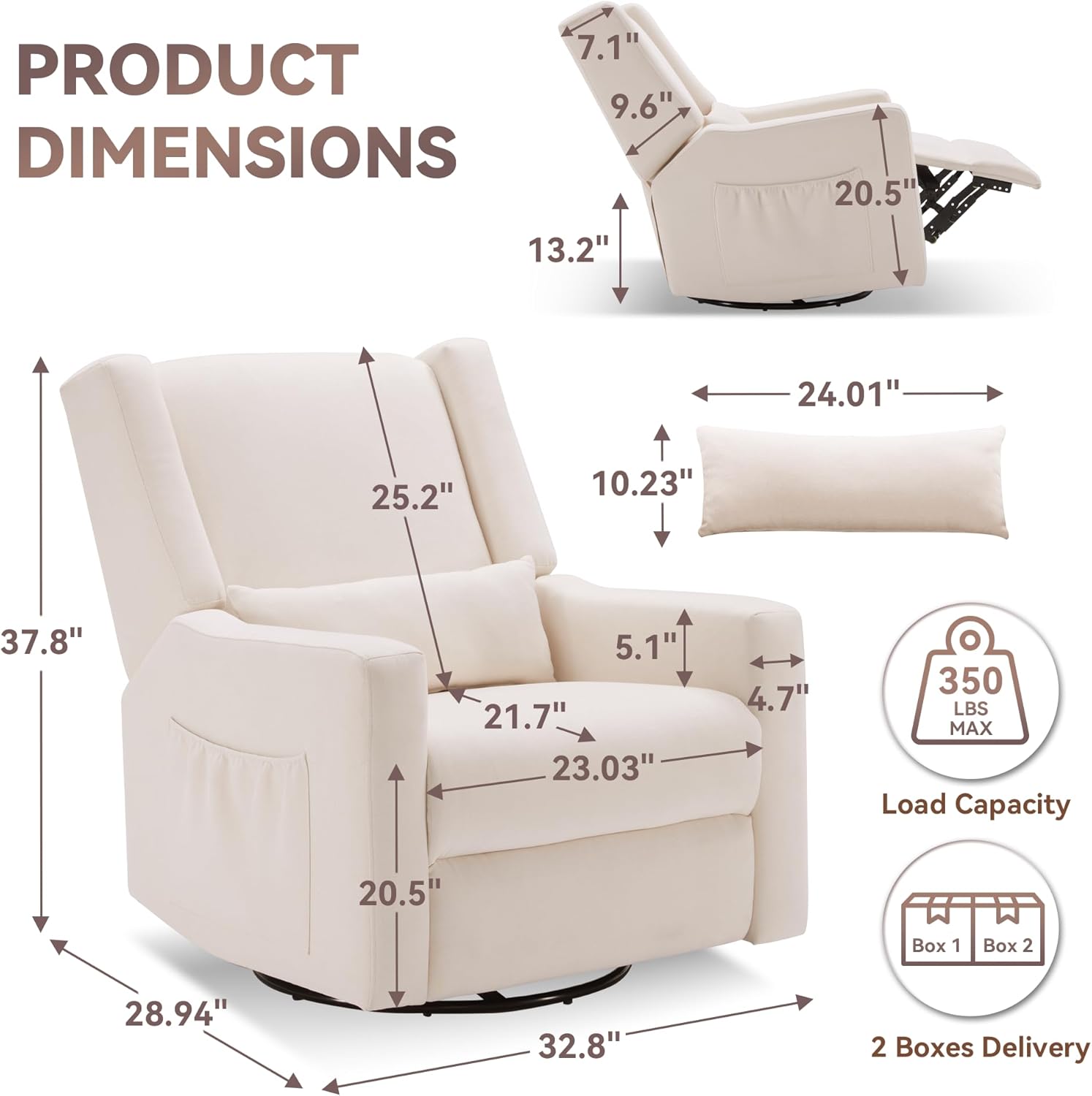 360 Swivel Recliner Chair,Nursery Rocking Chair with Lumbar Support for Bedroom, Comfy Upholstered Armchair with Pillows & Footrest for Living Room (Hidden Ring Handle, Beige)