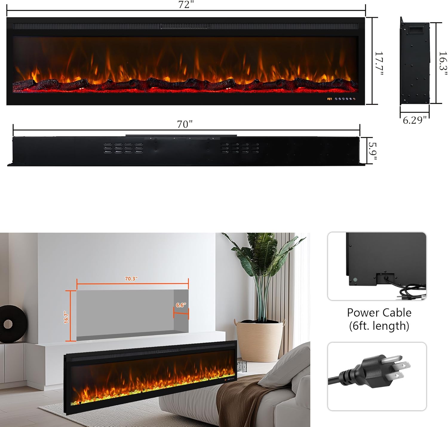 72inch Electric Fireplace in Wall Recessed and Wall Mounted Fireplace Electric, 13 Flame Colors, Realistic Logs & Crystals Fuel Bed, Adjustable Temperature and Timer, 750W/1500W, Black