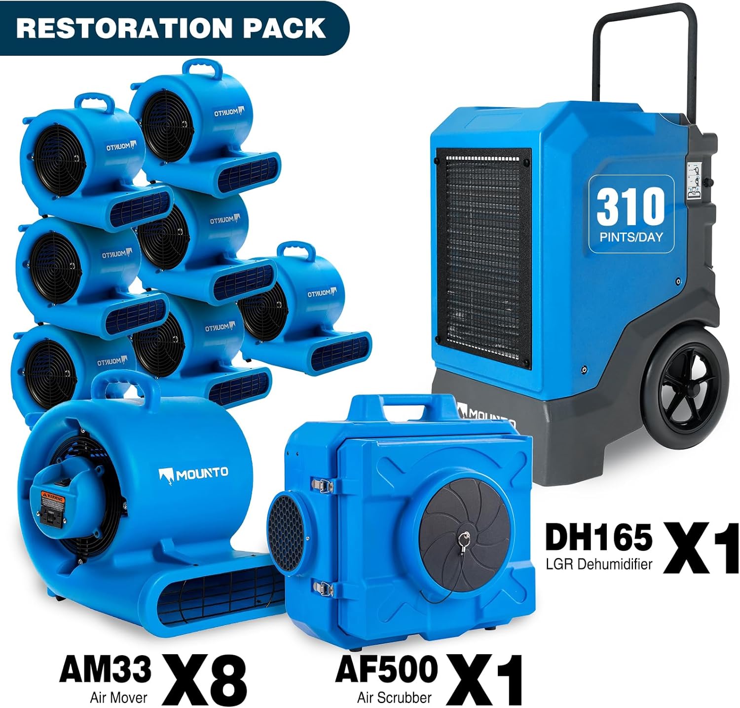 Pro Restoration Bundle 8 AM33 Air Movers, 1 DH165 Industrial LGR Dehumidifier, 1 HEPA 500 Air Scrubber Complete Drying & Air Filtration Package