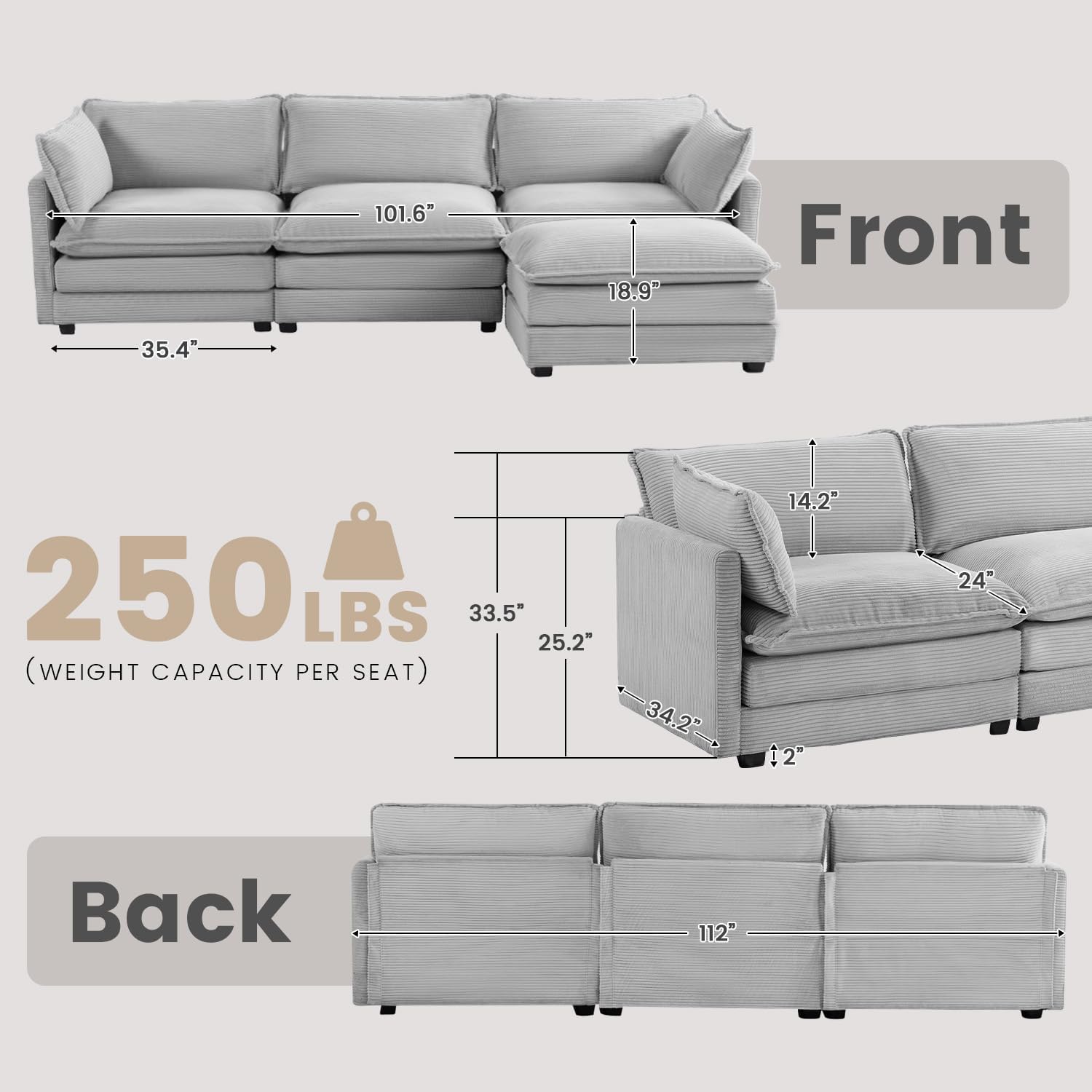 Oversized Modular Sectional Sofa with Movable Ottoman, 112 Inch 4 Seat Modern Corduroy Sofa Set, Convertible L Shaped Couch for Living Room and Office, Light Grey