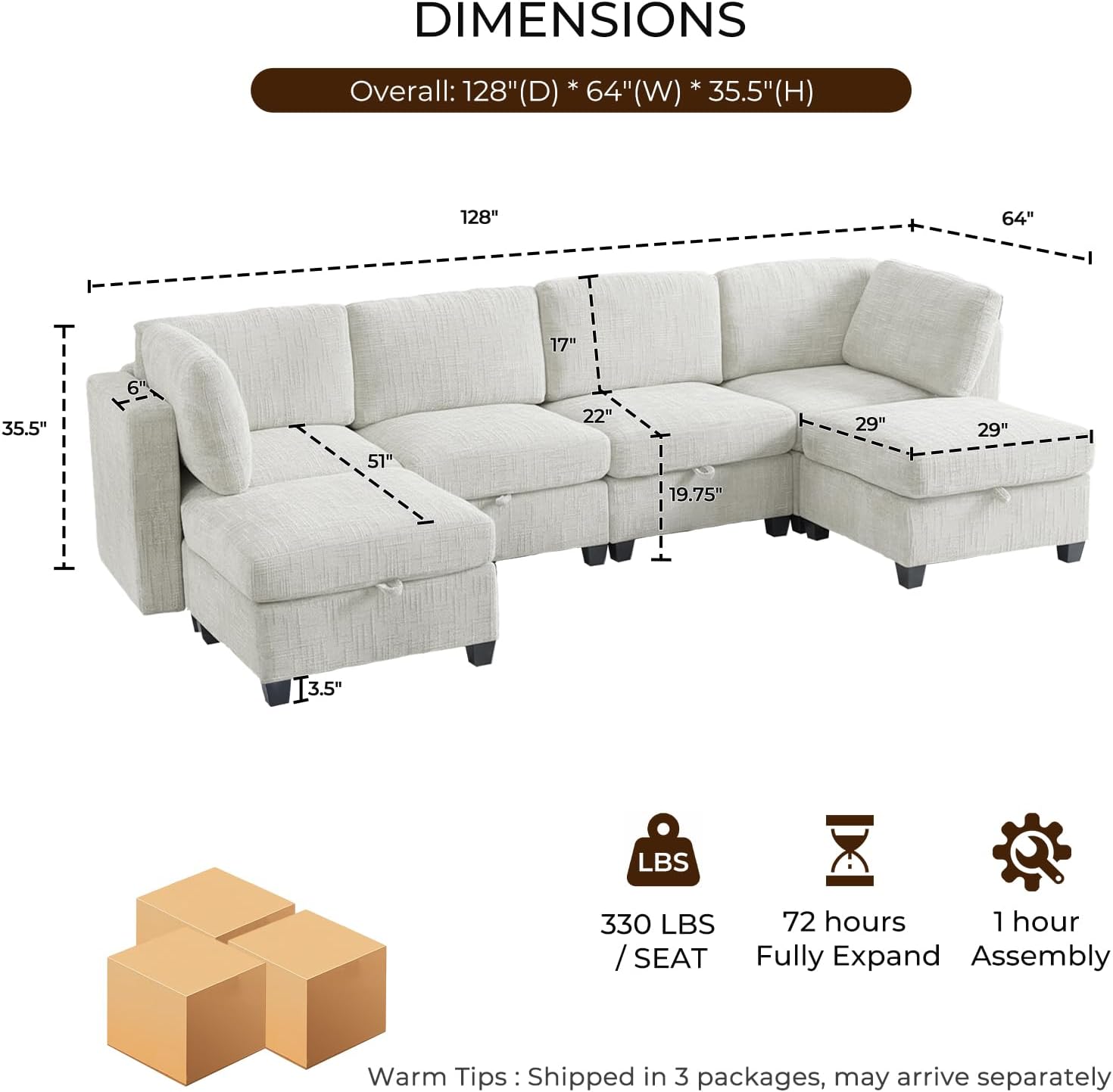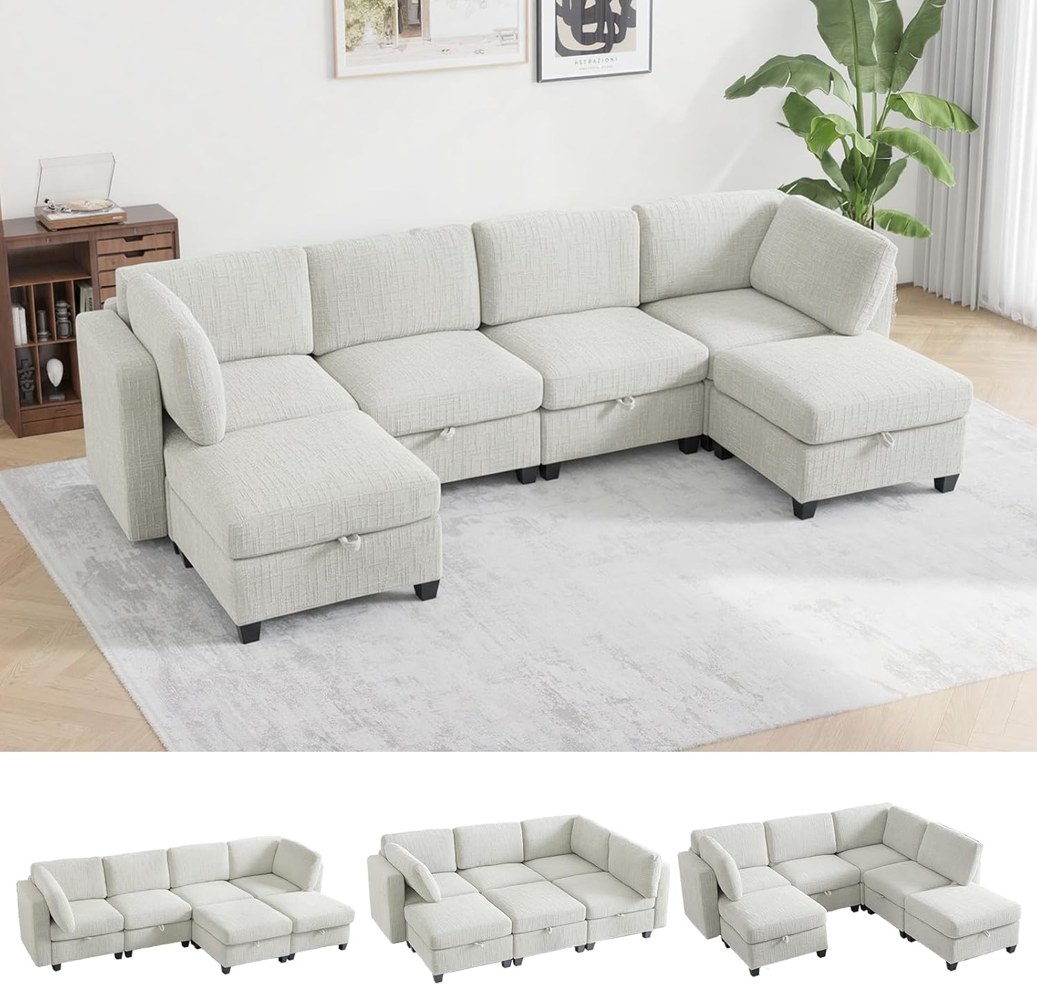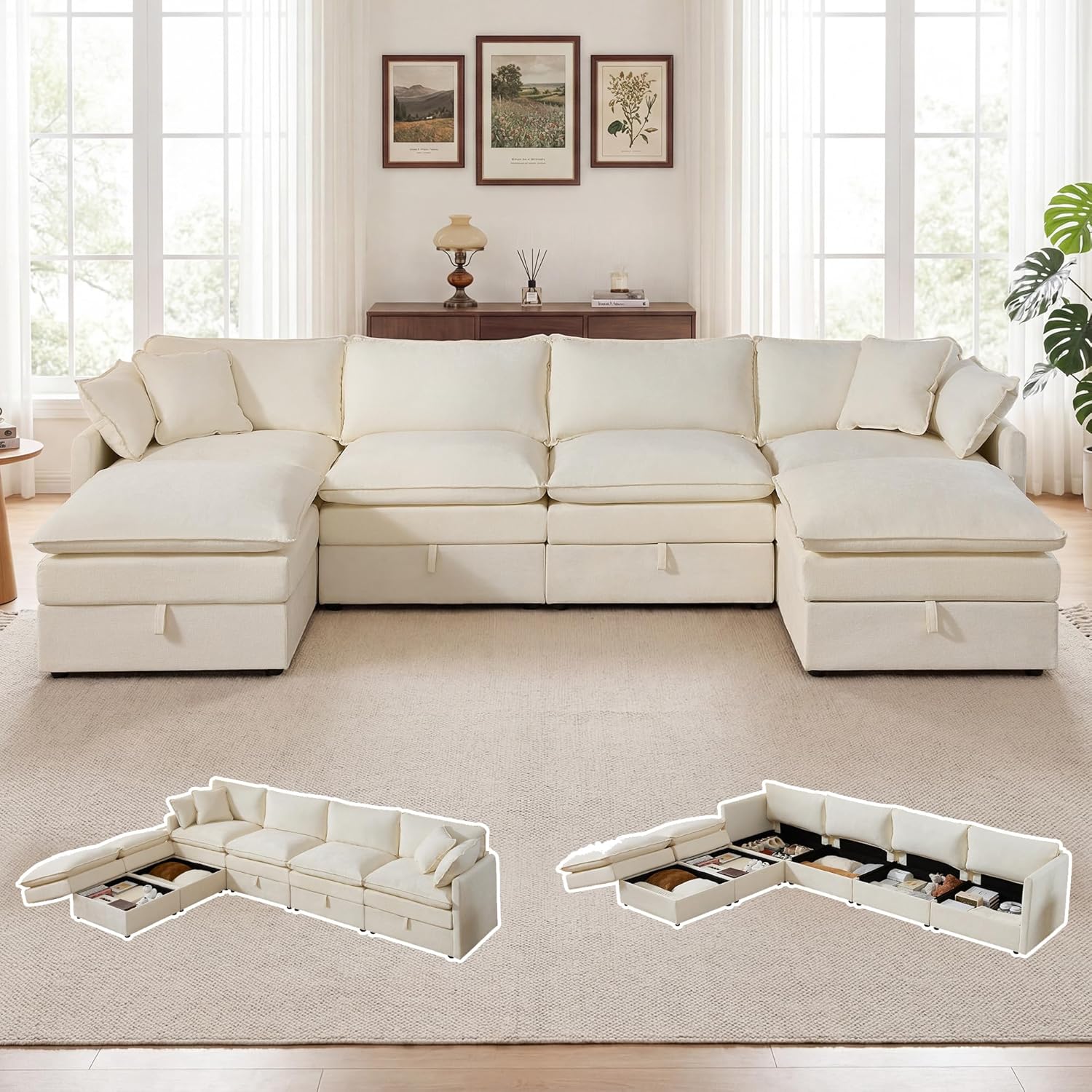 Modular Sofa with Storage, 135" U Shape Sectional Cloud Couch, Comfy Fabric Couch with Movable Ottoman, 6 Seat Modern Deep Seat Sofa for Living Room (Beige Chenille)
