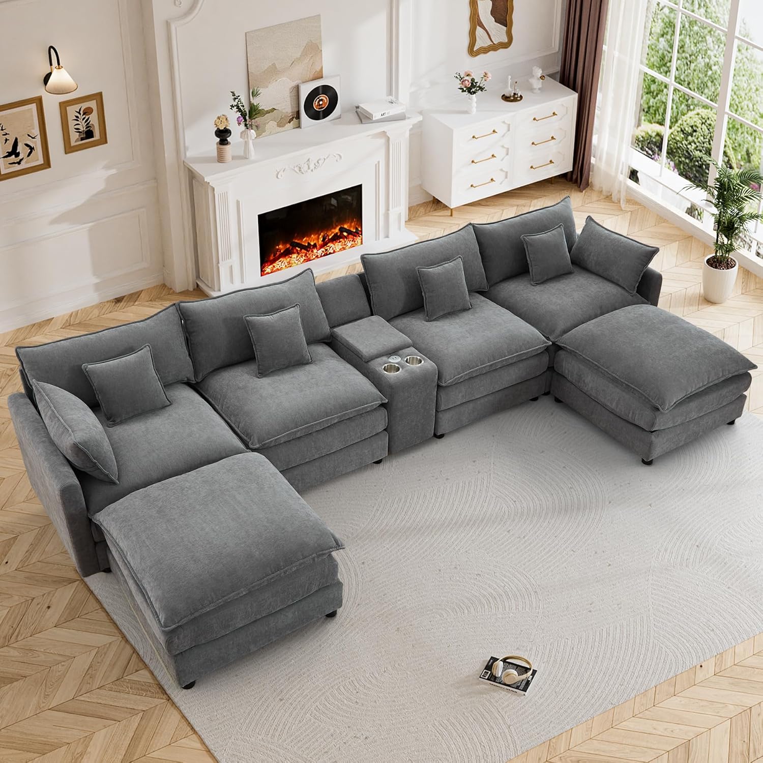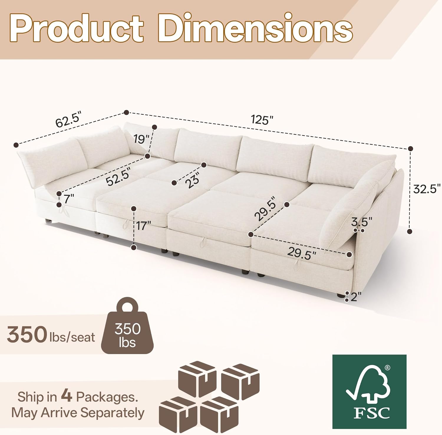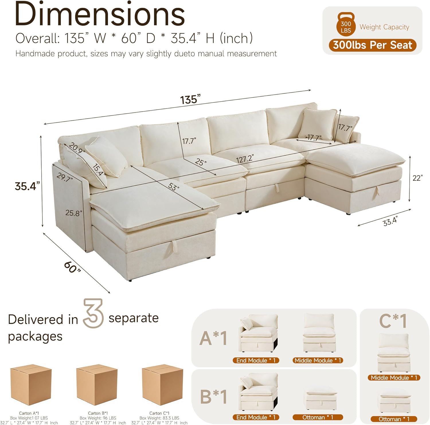 Modular Sofa with Storage, 135" U Shape Sectional Cloud Couch, Comfy Fabric Couch with Movable Ottoman, 6 Seat Modern Deep Seat Sofa for Living Room (Beige Chenille)