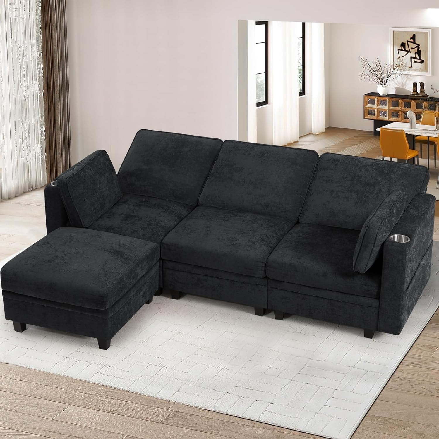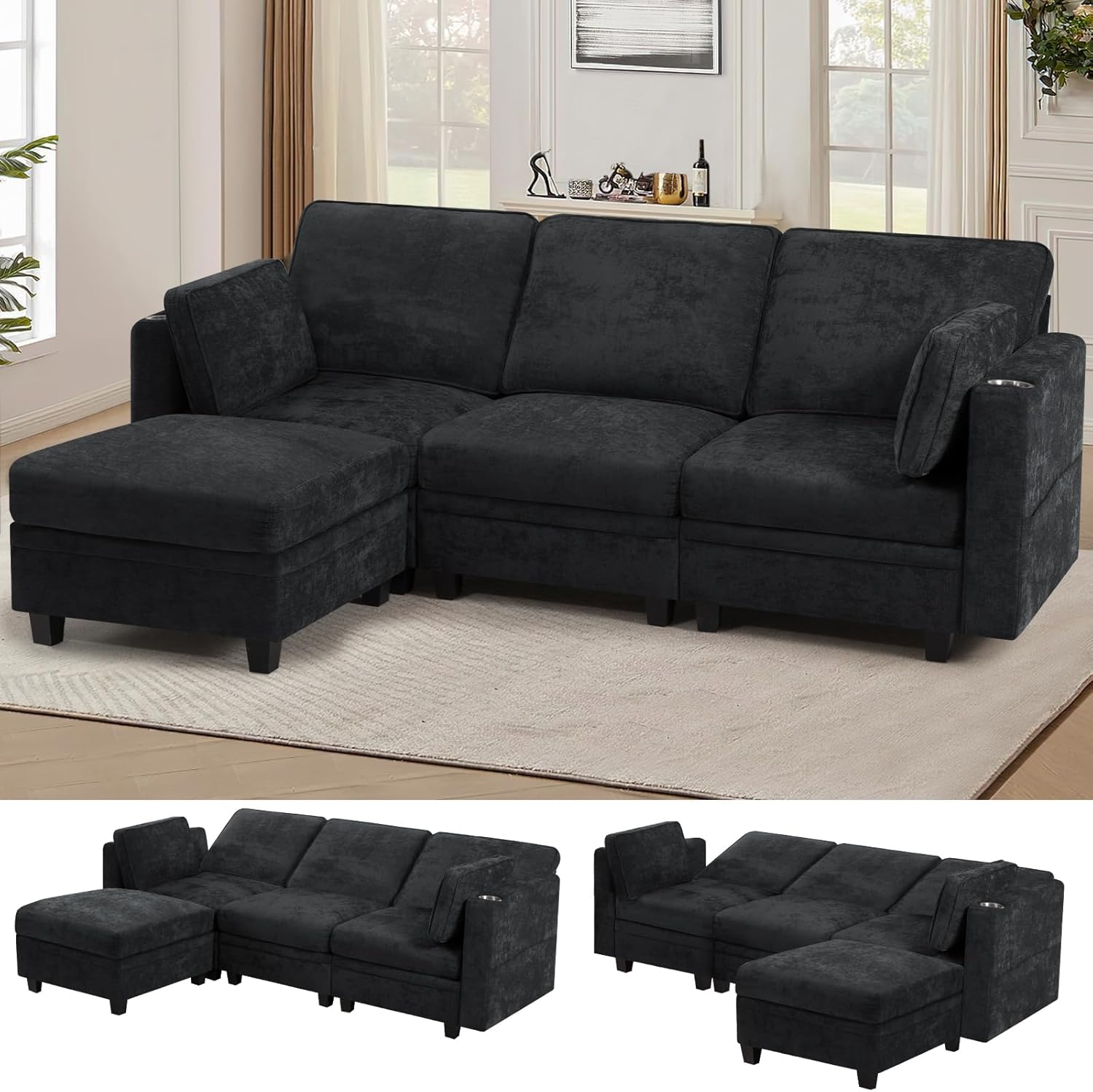 110 U-Shaped Pull Out Sofa Bed w/Storage Chaise & Adjustable Back, Chenille Sectional Sofa w/USB Port,Tufted Sleeper Couch w/Cup Holders for Living Room, Black