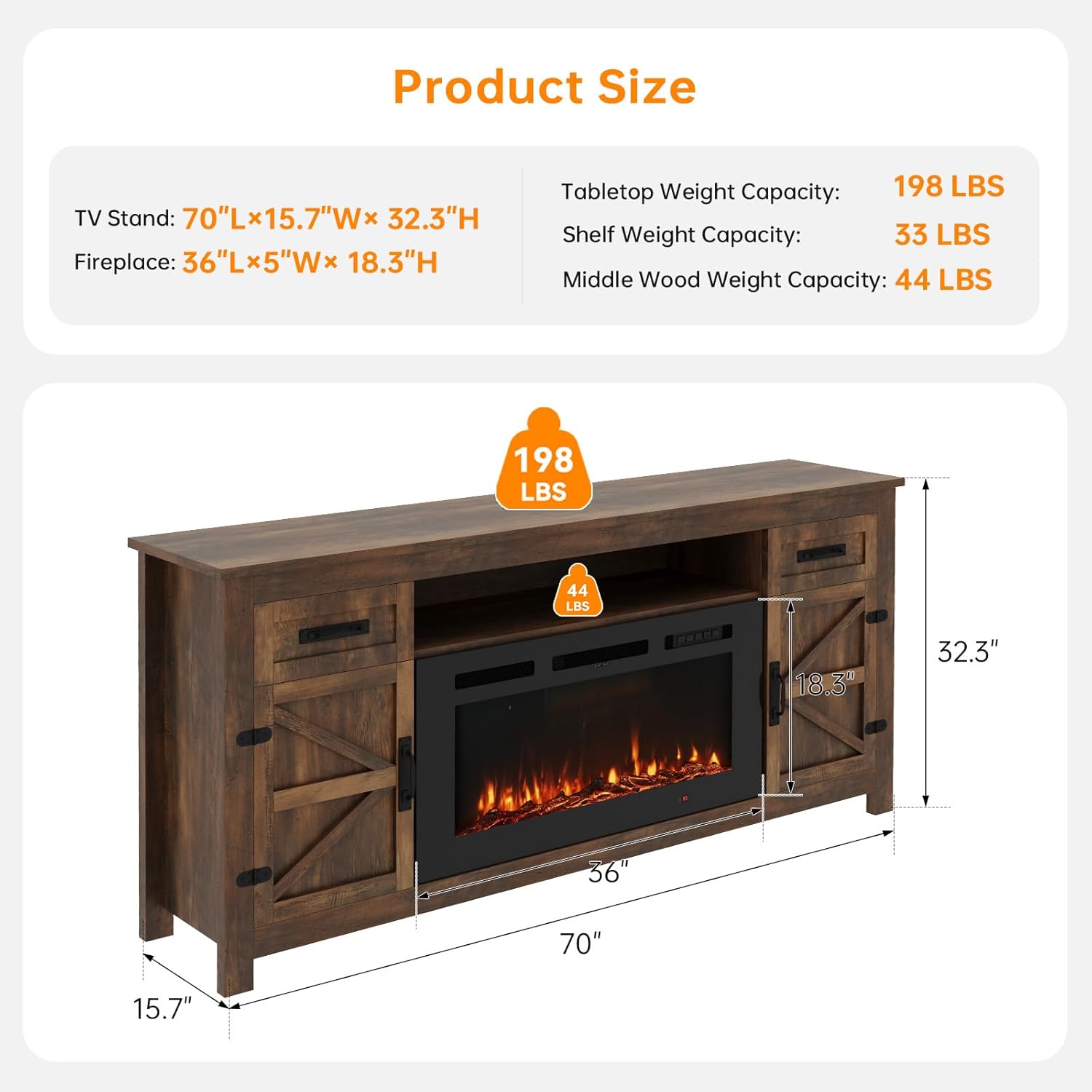 70"W x 15.5"D x 32"H (With Fireplace)