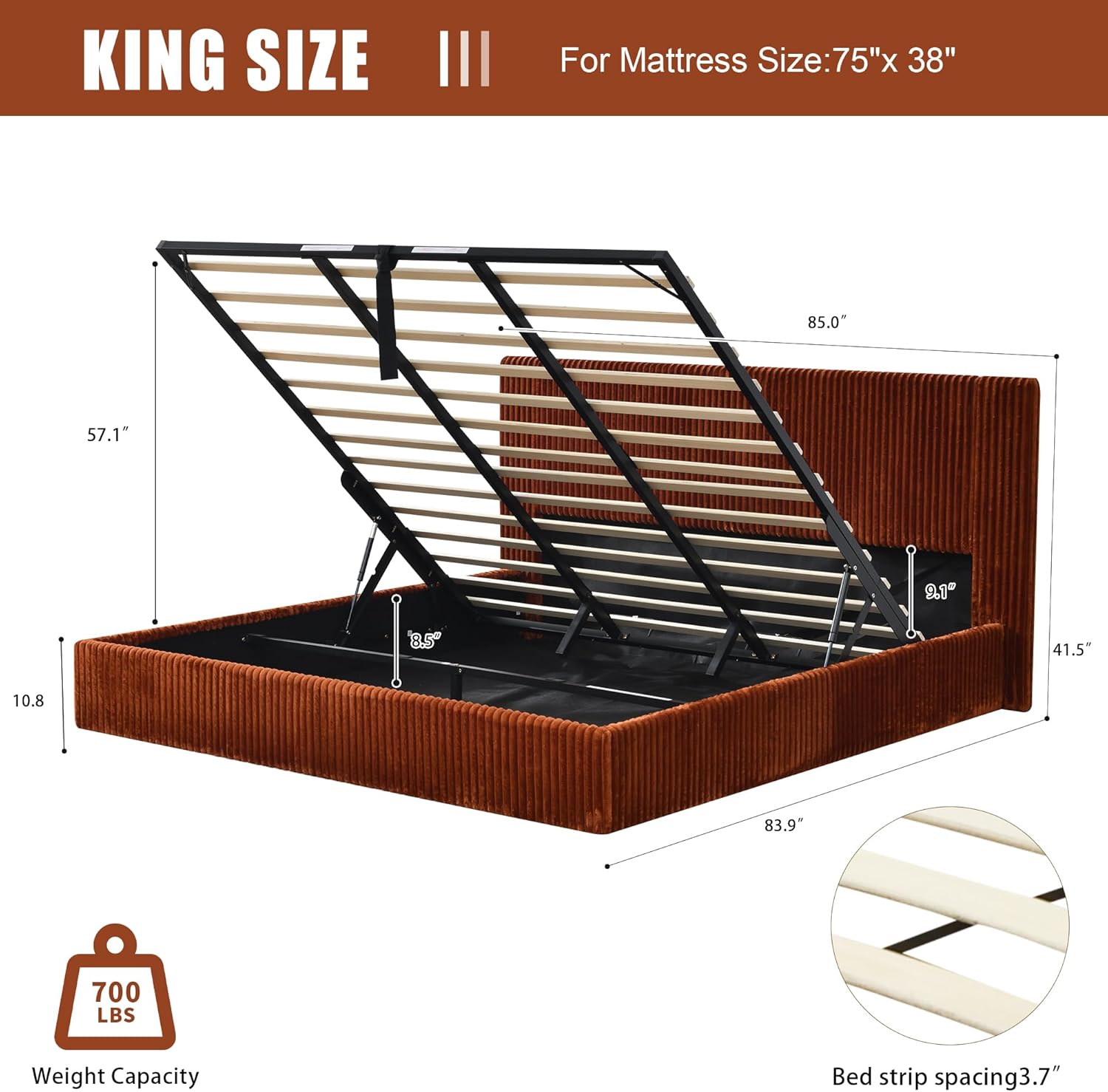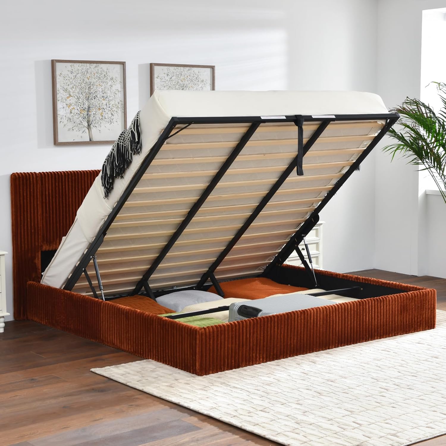 King Size Storage Bed Frame, Vertical Striped headboard with Delicate Velvet Fabric, Hydraulic Lift for Storage, no Box Spring Needed, no Noise (OCHER, King (U.S. Standard))