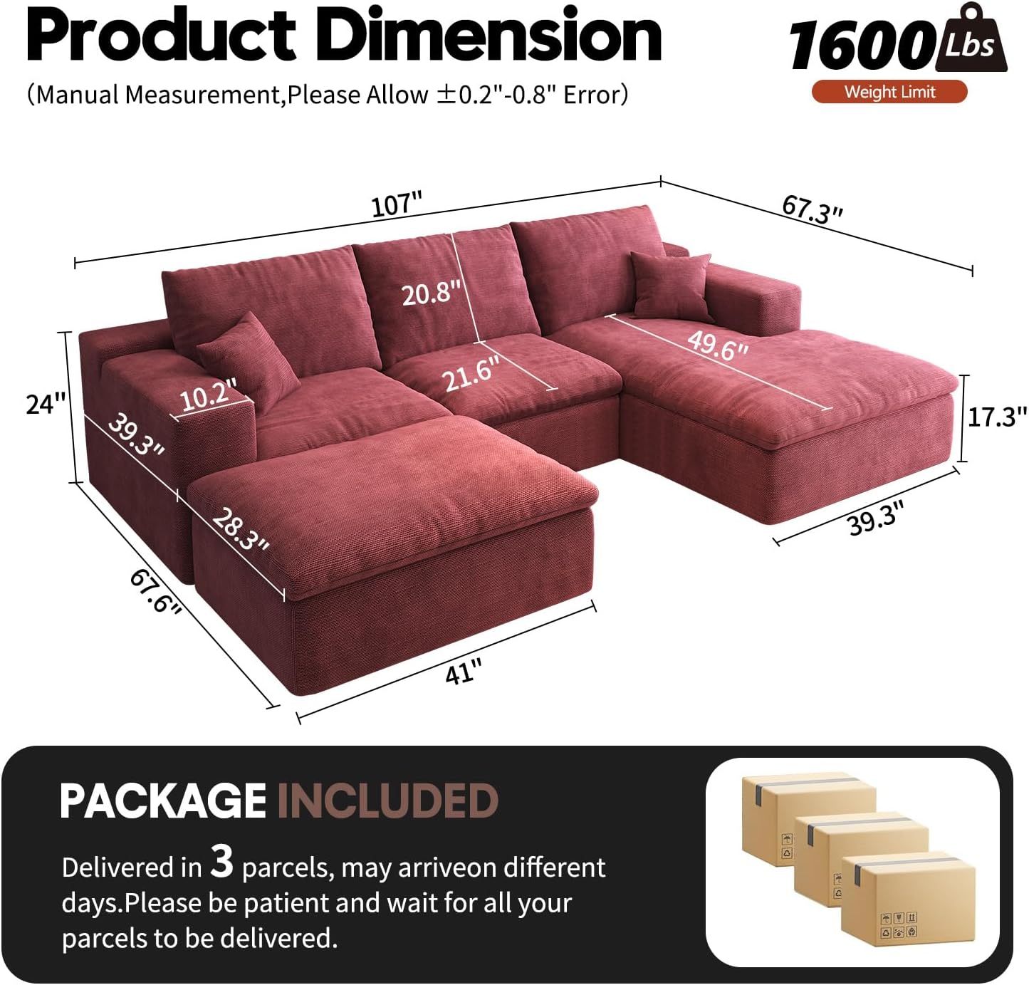 Comfy Cloud Couch Sectional Sofa with Lumbar Pillows, Modern U-Shaped Cloud Sofa with Double Chaise & Deep Seat 4 Seat Sectional Couch for Living Room, or Office, Easy Assembly, Dark Coffee