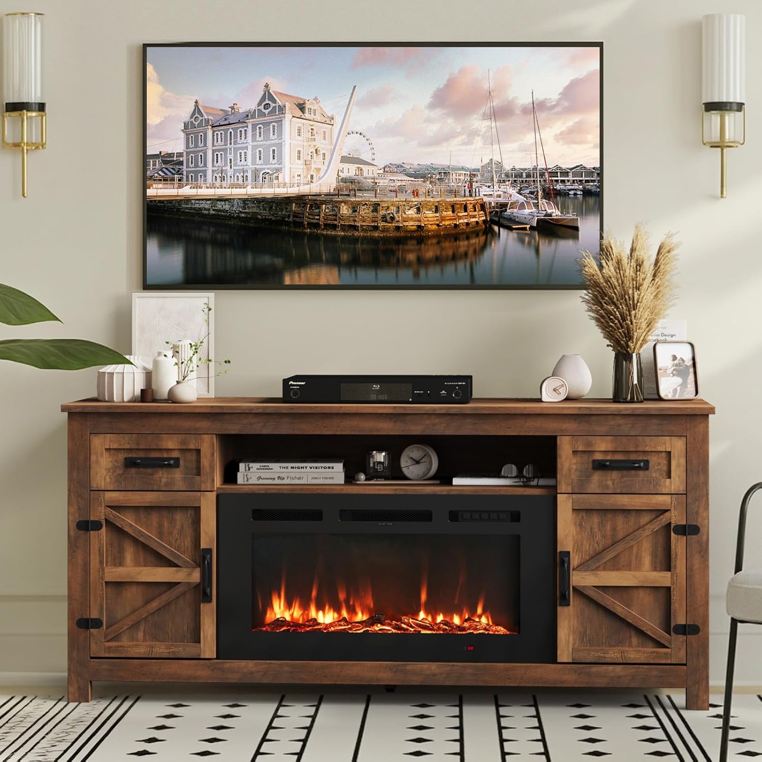 Farmhouse Fireplace TV Stand for 70 Inch TV, 34" Tall Highboy Entertainment Center with 23" Electric Fireplace, Rustic Media Console w/Sliding Arched Door for Living Room,Reclaimed Barnwood