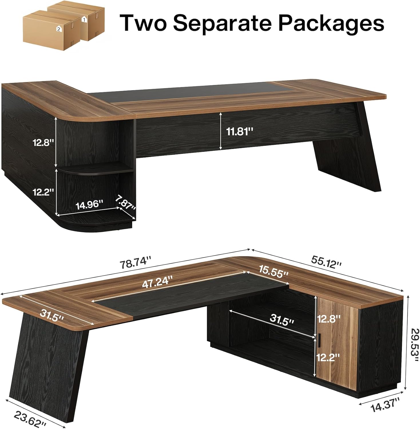 79-Inch Executive Desk, Large Office Desk with Cabinet, L-Shaped Compter Desk with Storage Shelves, Writing Table for Home Office, Brown and Black