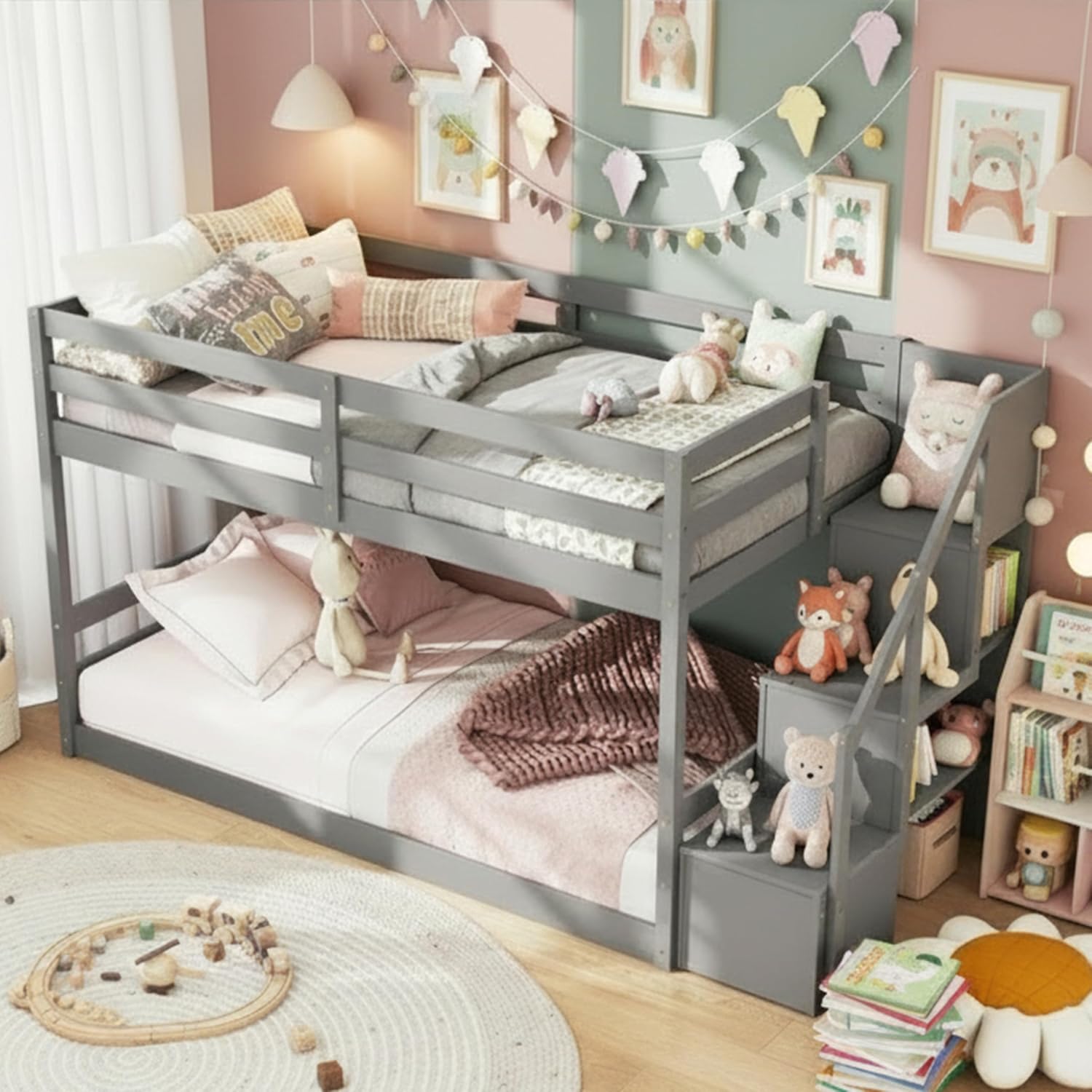 Wood Twin Over Twin Low Bunk Bed with Storage Staircase, Wooden Bunk Bed Frame with Full-Length Guardrails, Low Profile Kids Bed with Slats Support, No Box Spring Needed (Grey)