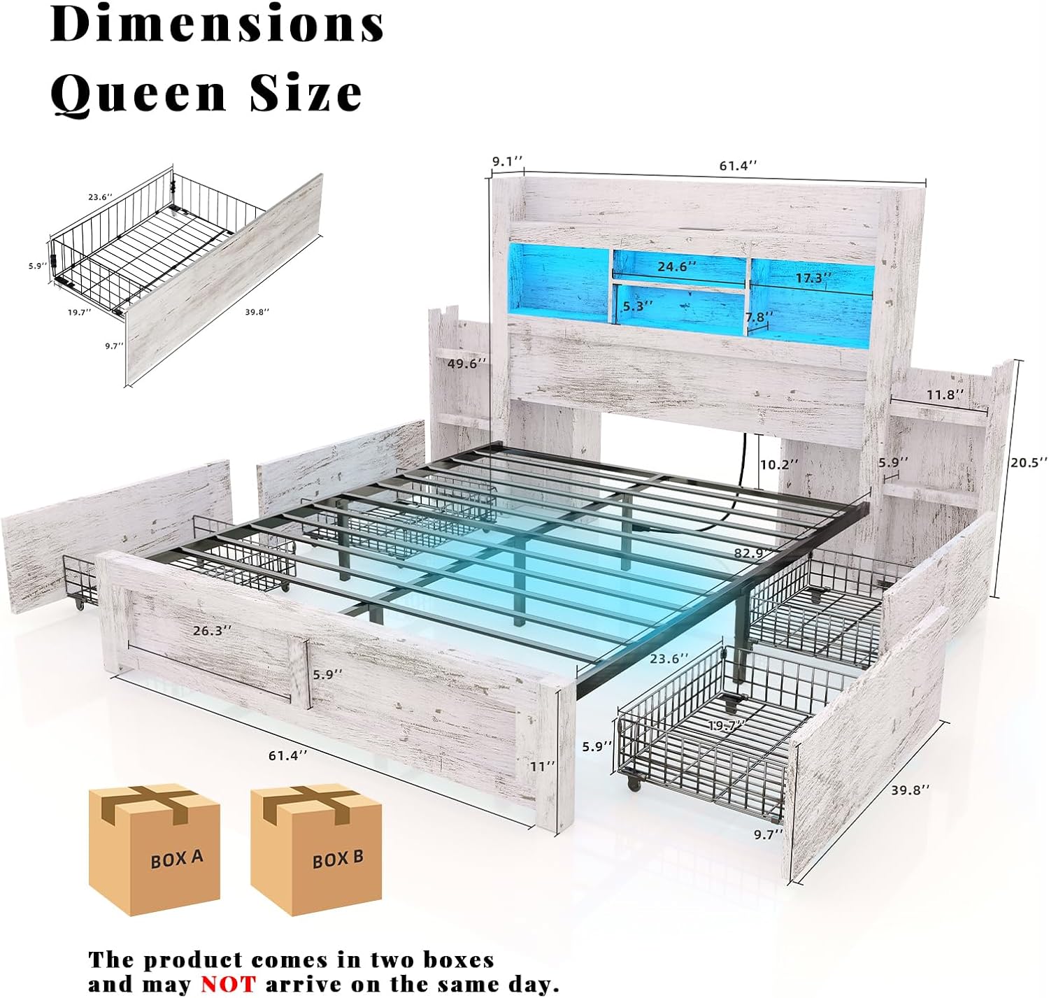 Queen Bed Frame with 49.6" Bookcase Headboard & 4 Drawers & 2 Detachable Bedside Stoage Racks, Farmhouse Wood Bed Frame with RGB LED & Charging Station, No Box Spring Needed, Distressed White