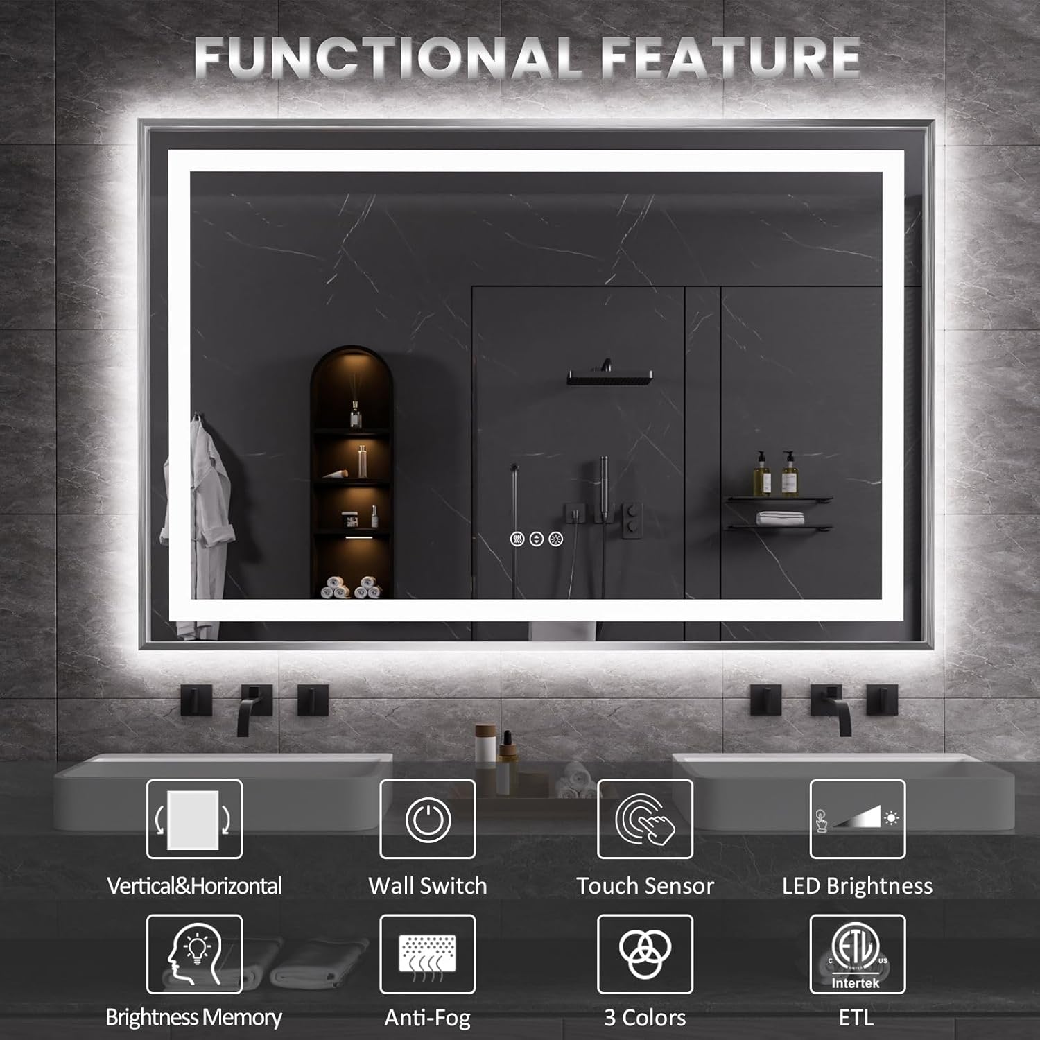 60" X40" LED Bathroom Mirror, Brushed Nickel Framed Mirror with Front Light and Backlit, Stepless Dimmable, Anti-Fog, Shatter-Proof, Memory, 3 Colors