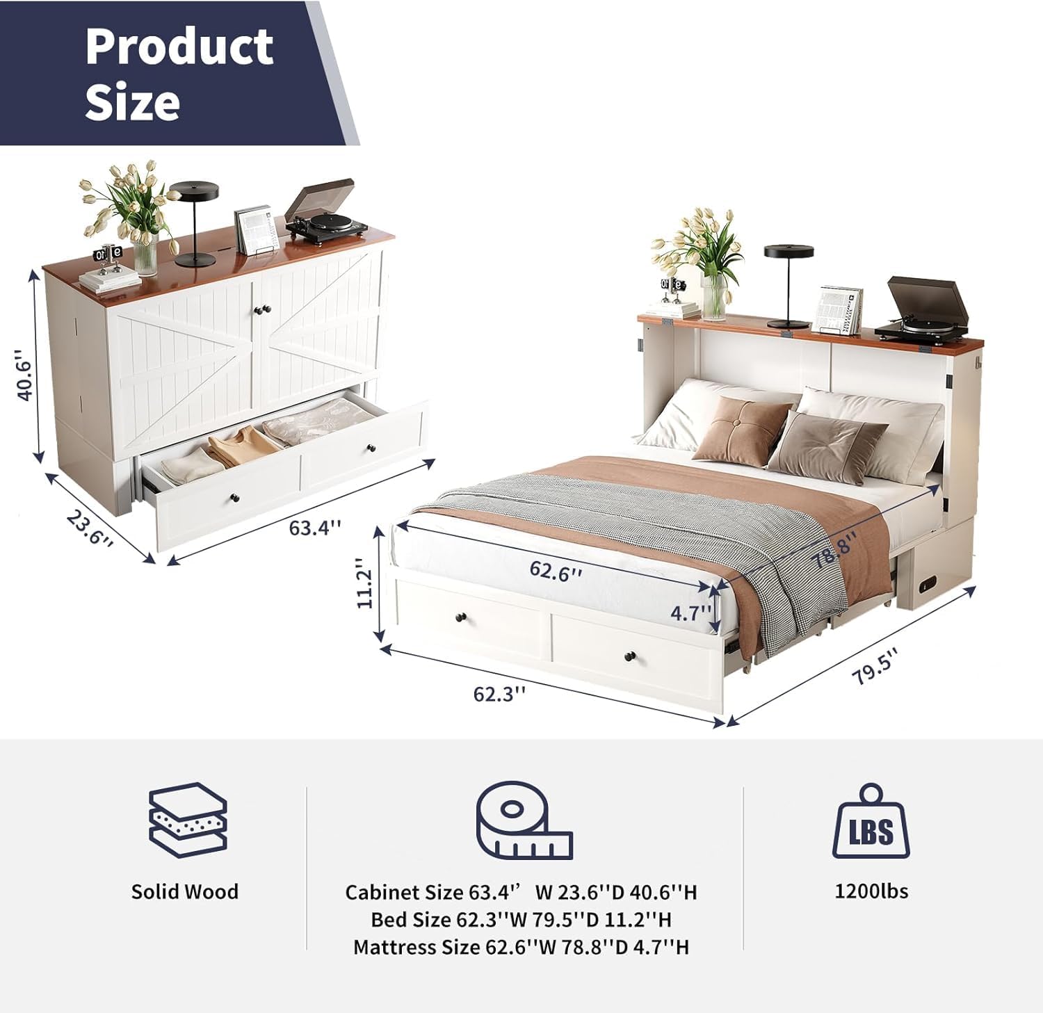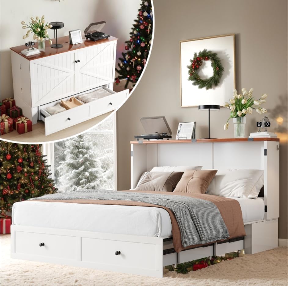 Queen Murphy Bed with Mattress Included, Farmhouse Cabinet Bed with Storage Drawer & Charging Station, Foldable Space-Saving Murphy Beds for Guest Bedroom, Living Room (White & Brown)