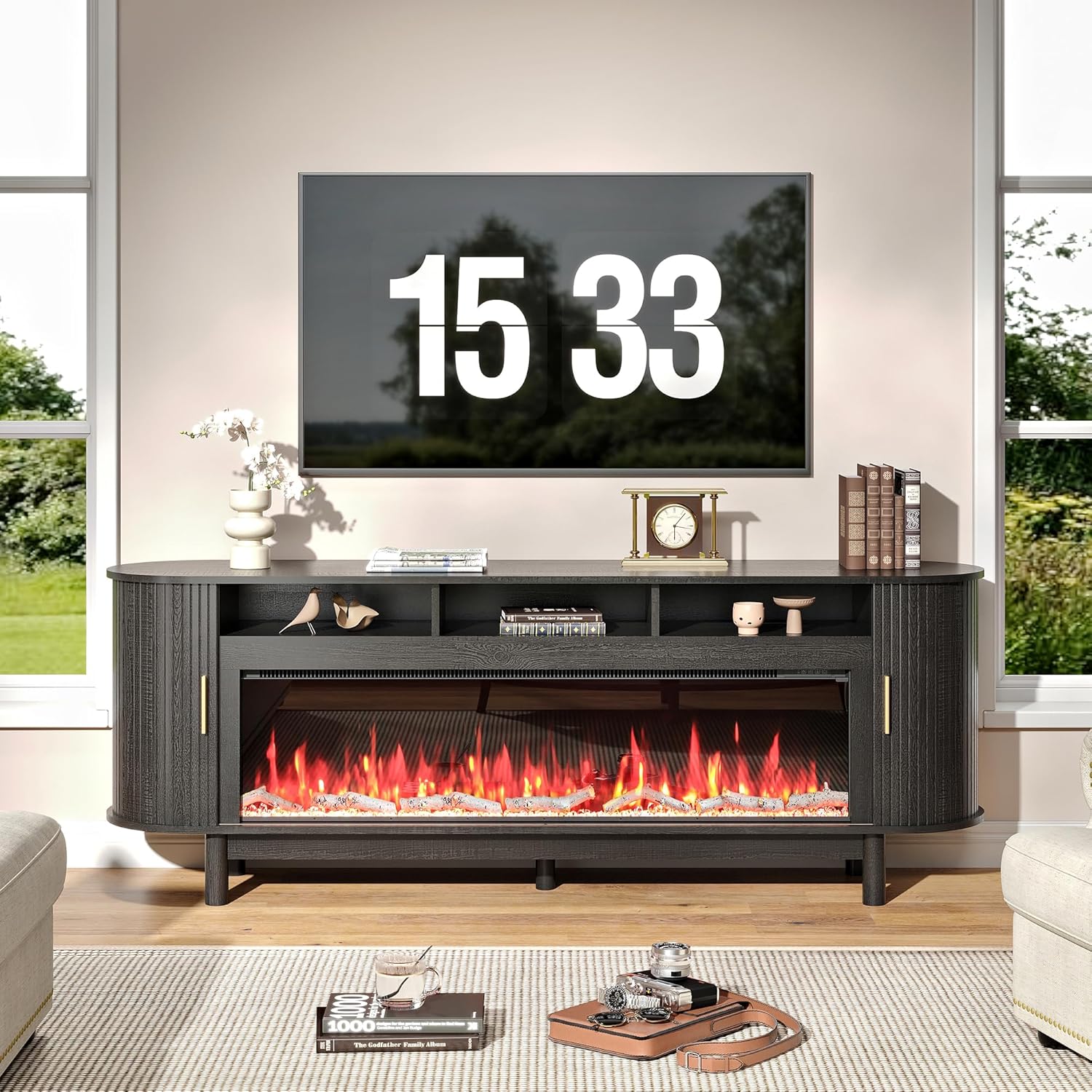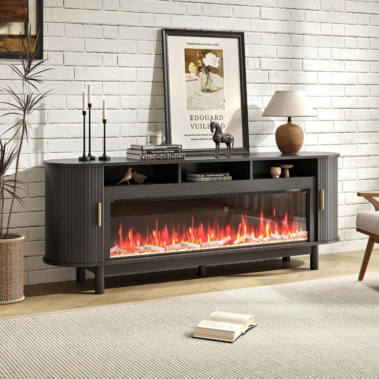 70 Inch Modern Fireplace TV Stand for TVs up to 80 inches, Mid Century TV Console with Solid Wood Legs, Sliding Doors & Curved Design,Media Console for Living Room, Black