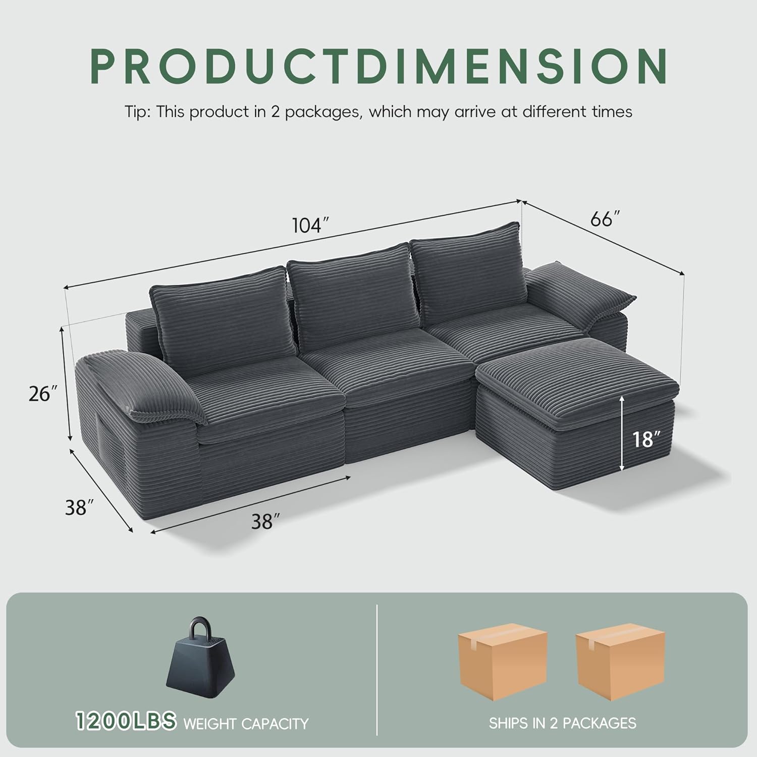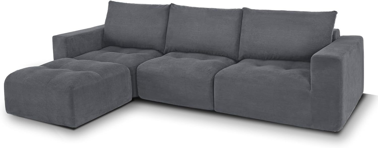 121" Modular Sofa Couch, No Assembly Required, L Shaped Compressed Sectional Sofa with Ottoman, Deep Seat Upholstered Boneless Couch for Living Room, SS378 (Dark Grey)