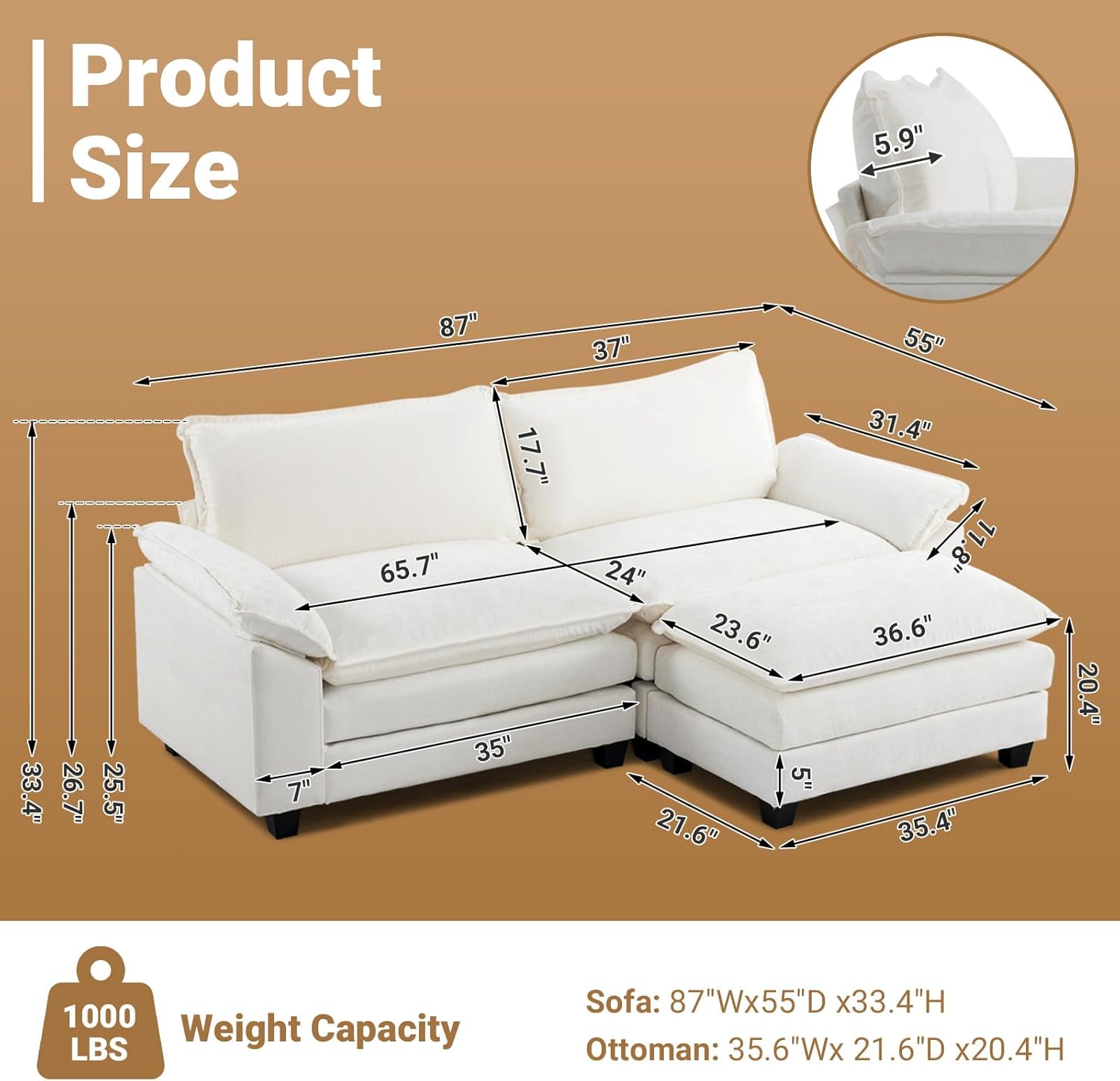 87" Convertible Sectional Sofa,L-Shaped Deep Seat Sofa Couch for Living Room,Modern 2-Seat Loveseat Sofa with Ottoman for Small Space(Creamy White, 87")