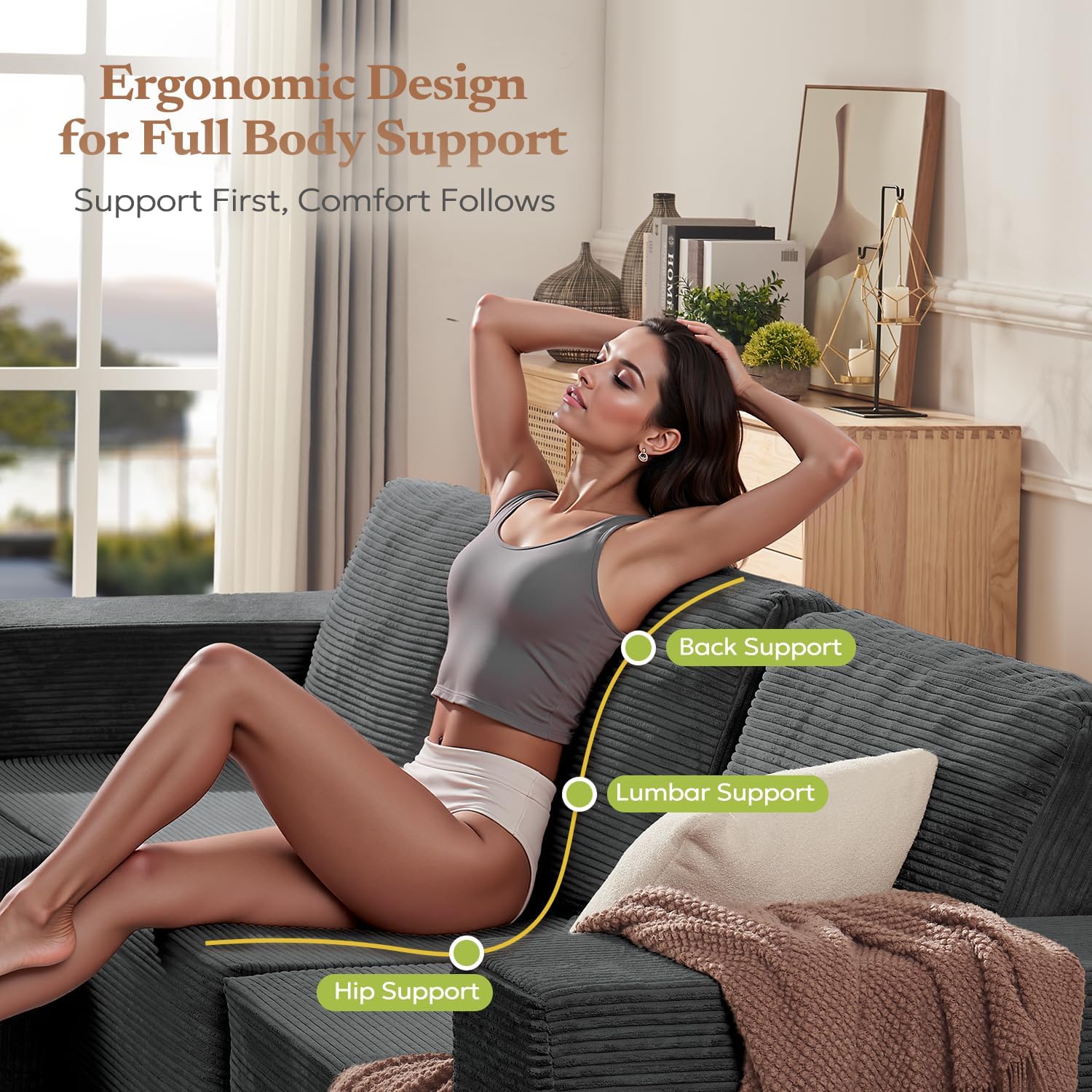 No Assembly Required: Enjoy effortless setup with our modular sofa that arrives ready to use. Simply unbox the compact modules (shipped in 3 packages for easy handling), gently fluff the cushions to restore their springiness, and let them expand in a well-ventilated and dry space. While full plumpness develops naturally within 24-72 hours, you can immediately enjoy cloud-like comfort