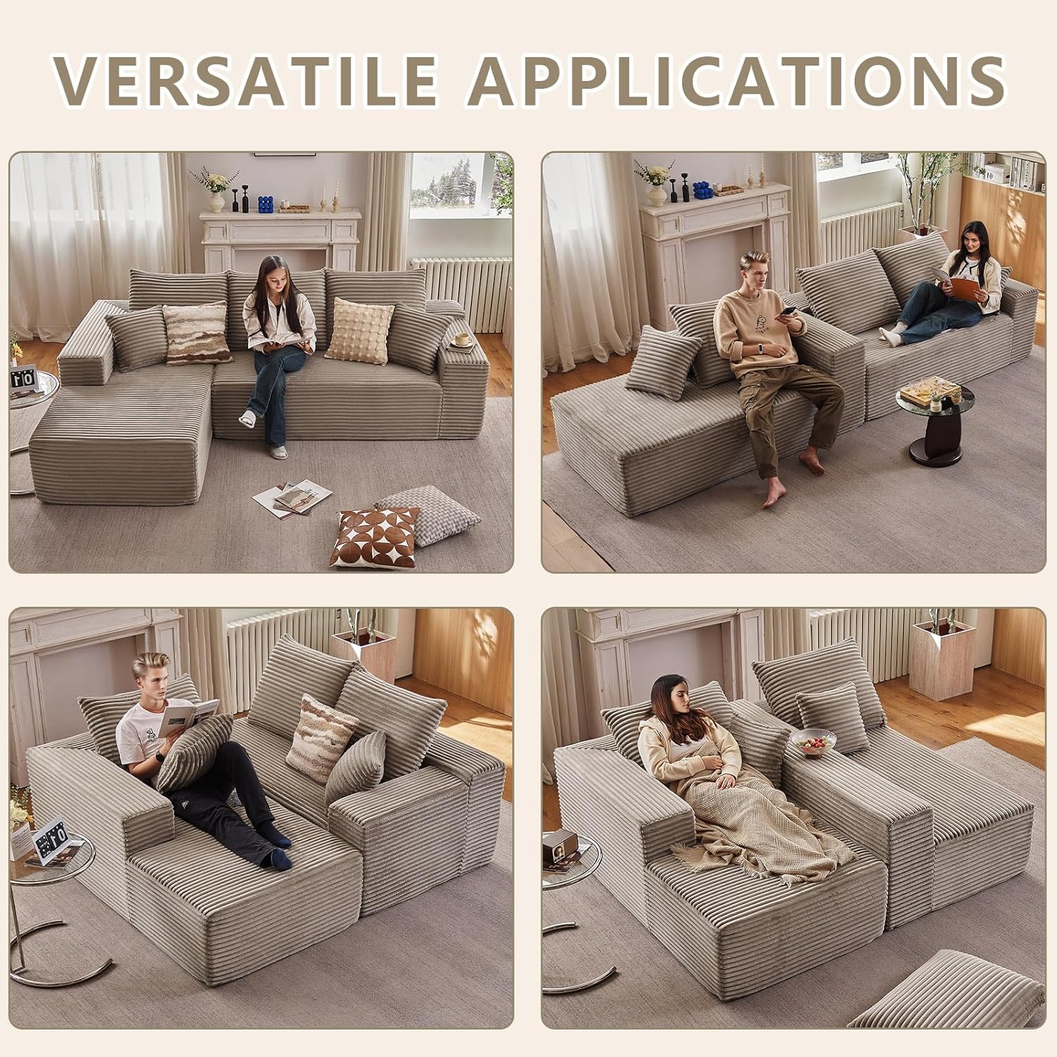 Multi-functional Flexible Modular Sofa: Our modular sofa features oversized L-shaped recliners, each designed with lightweight construction. This modular sofa offers four distinct usage modes that can be freely reconfigured to suit your needs, adding flexibility and personalized style to your living space.