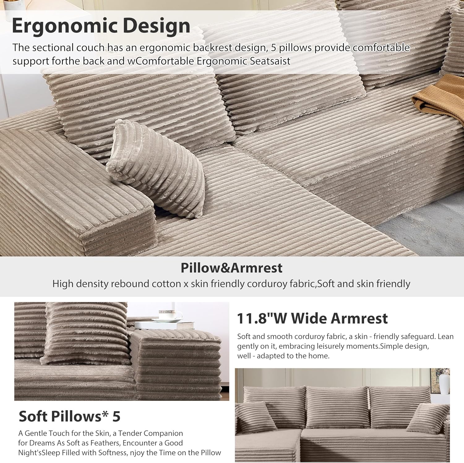 Comfortable Sectional Couch: The boneless couch is made of breathable fabric and high-resilience memory foam with removable back cushion and neck pillow, providing you with a super comfortable experience. The anti slip design at the bottom ensures the stability of the sofa. The comfy cloud sofa cover is machine washable and can be cleaned when dirty.
