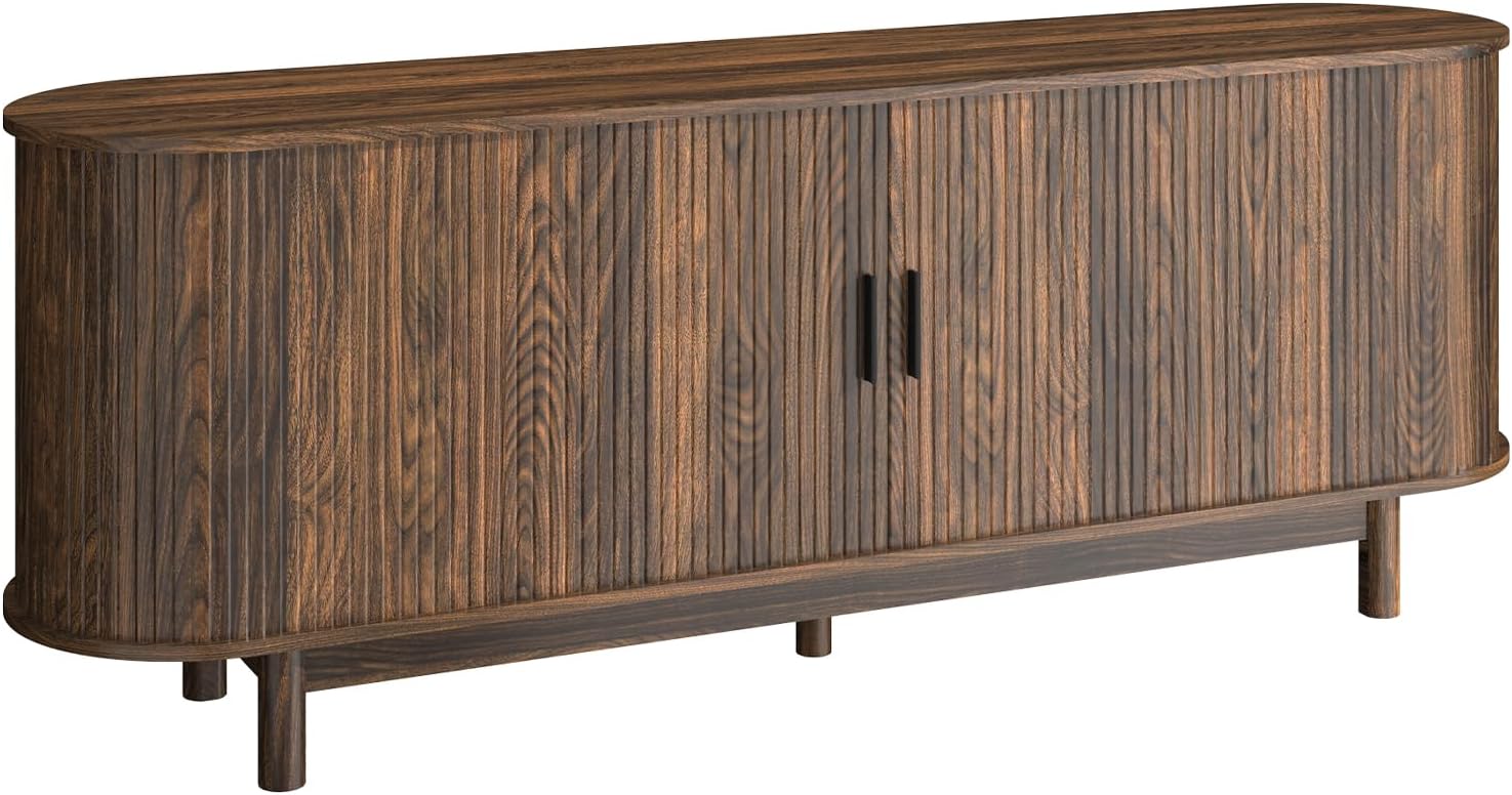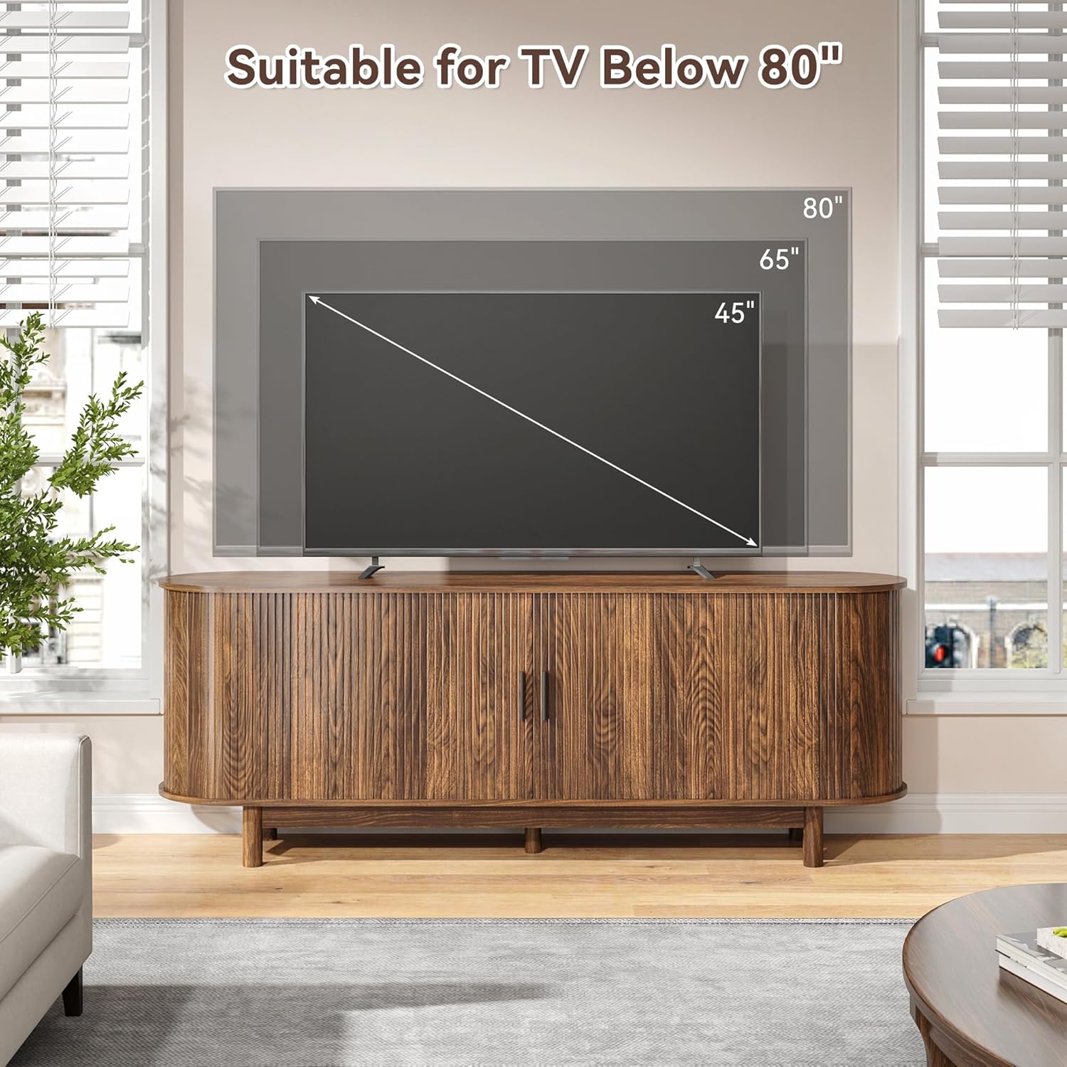 Large Capacity Storage: Our Mid Century TV Console features an spacious 71-inch surface along with 4 open shelves for easy access to everyday items, plus 2 hidden compartments with smooth sliding doors. It neatly organizes books and daily essentials, offering versatile storage for items of various sizesseamlessly blending style and functionality to keep your living space tidy.