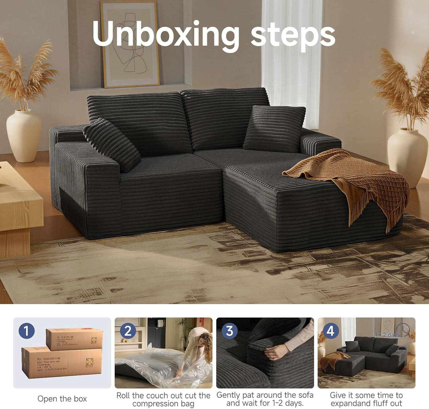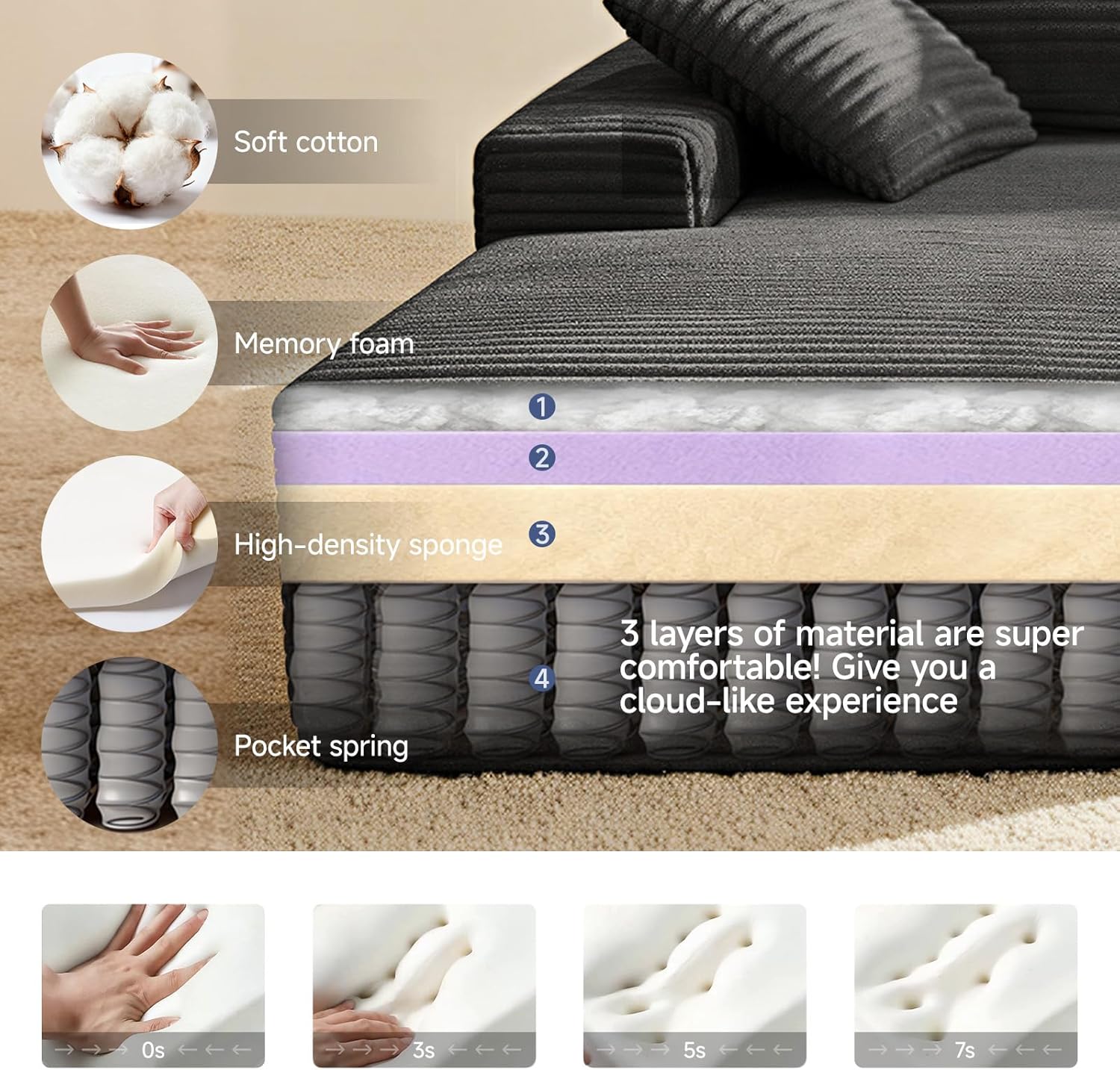 Premium Breathable Corduroy & Boneless Comfort: 2-piece right-facing L-shaped chaise crafted with soft, breathable corduroy. 3-layer cotton memory foam pocket spring construction creates cloud-like comfort for this boneless couch. Luxurious soft touch pampers skin, providing year-round warmth for all-day coziness in the living room.