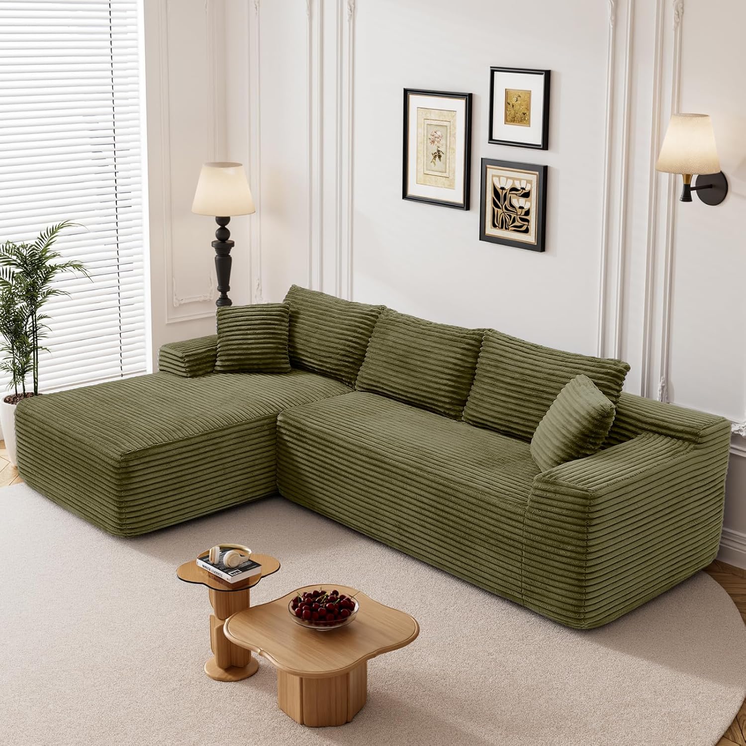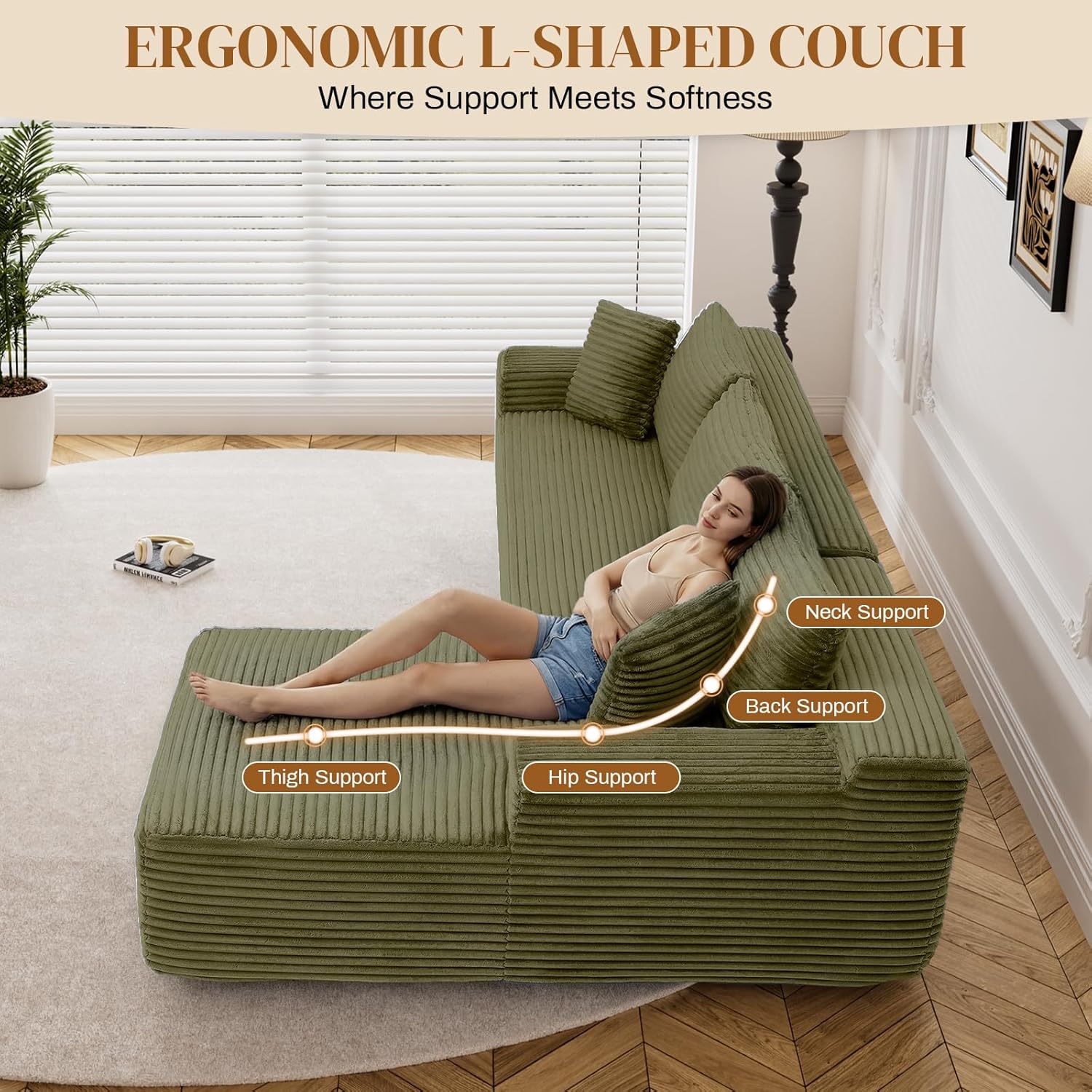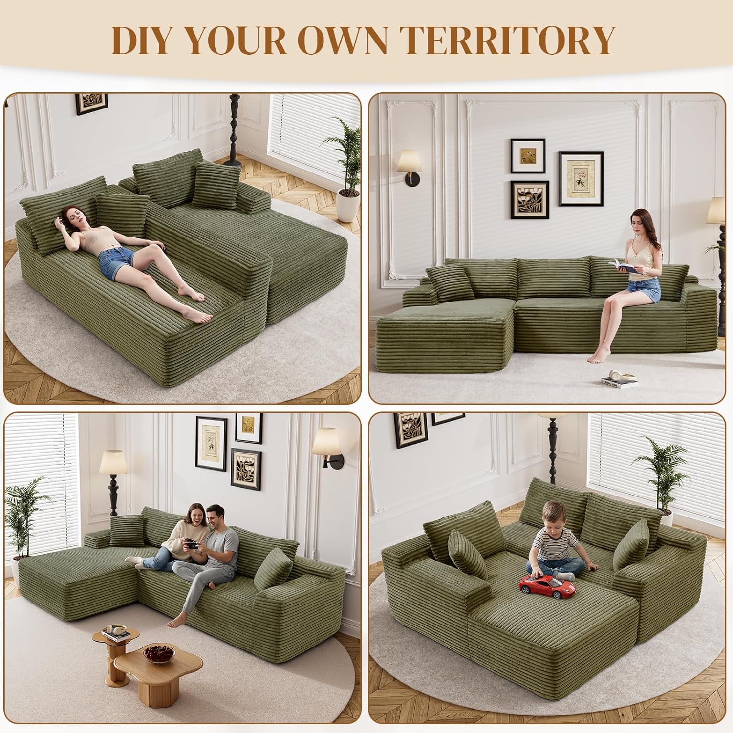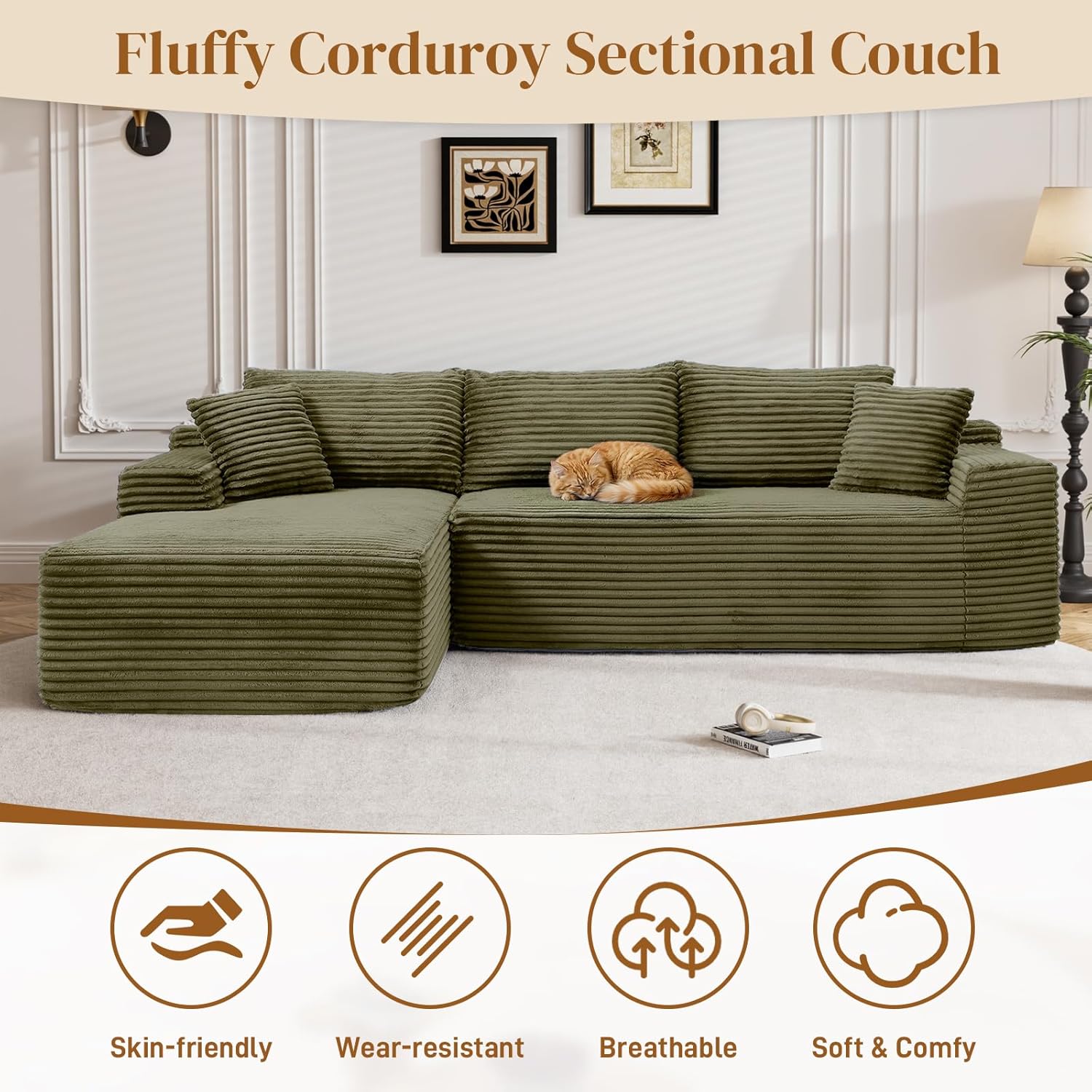 Plush Corduroy Couch Sectioanal: Our compressed sofa set is wrapped in premium corduroy, giving you unrivaled softness and warmth. The upgraded material offers better breathability and stain resistance, making the fluffy couch easy to care for and clean. The unique texture and soft sheen make it stand out, providing gentle pampering no matter the season
