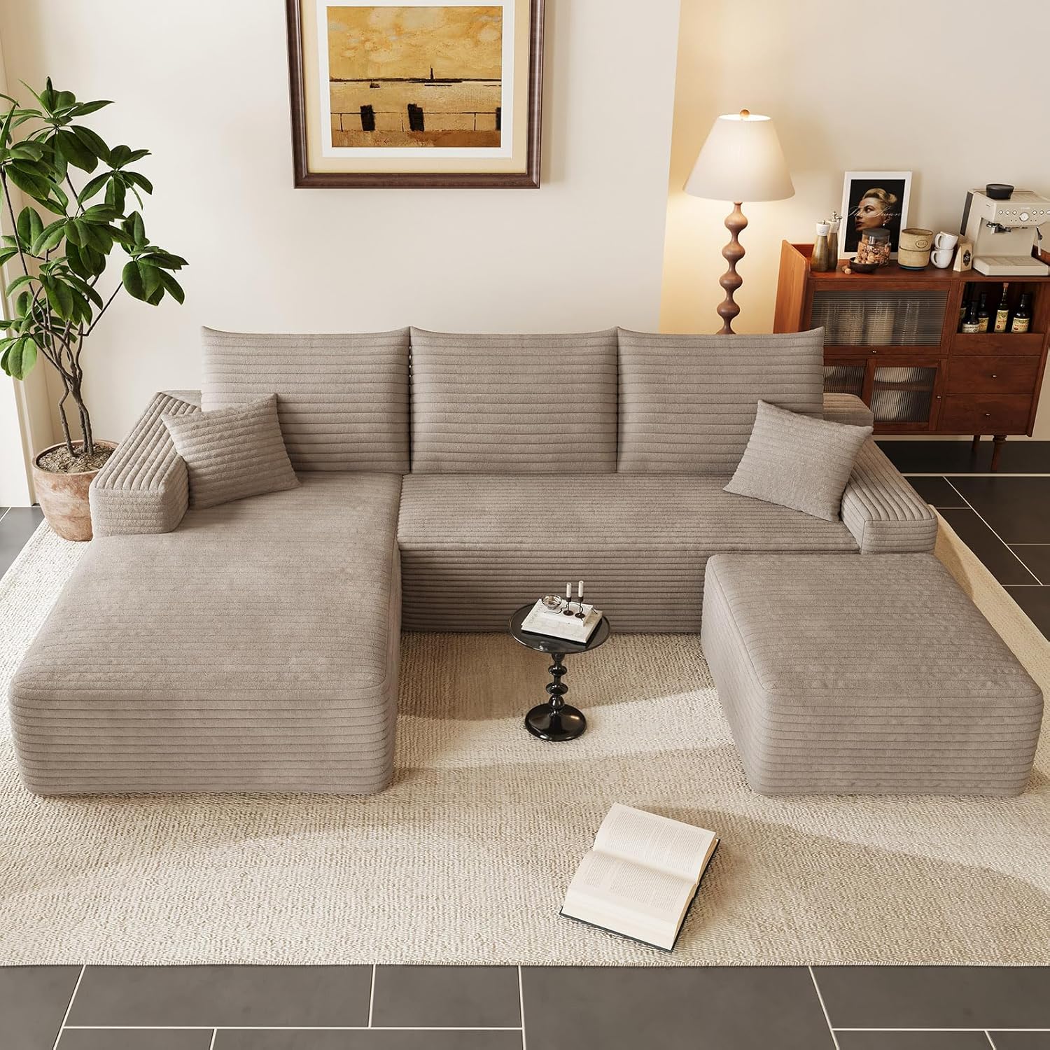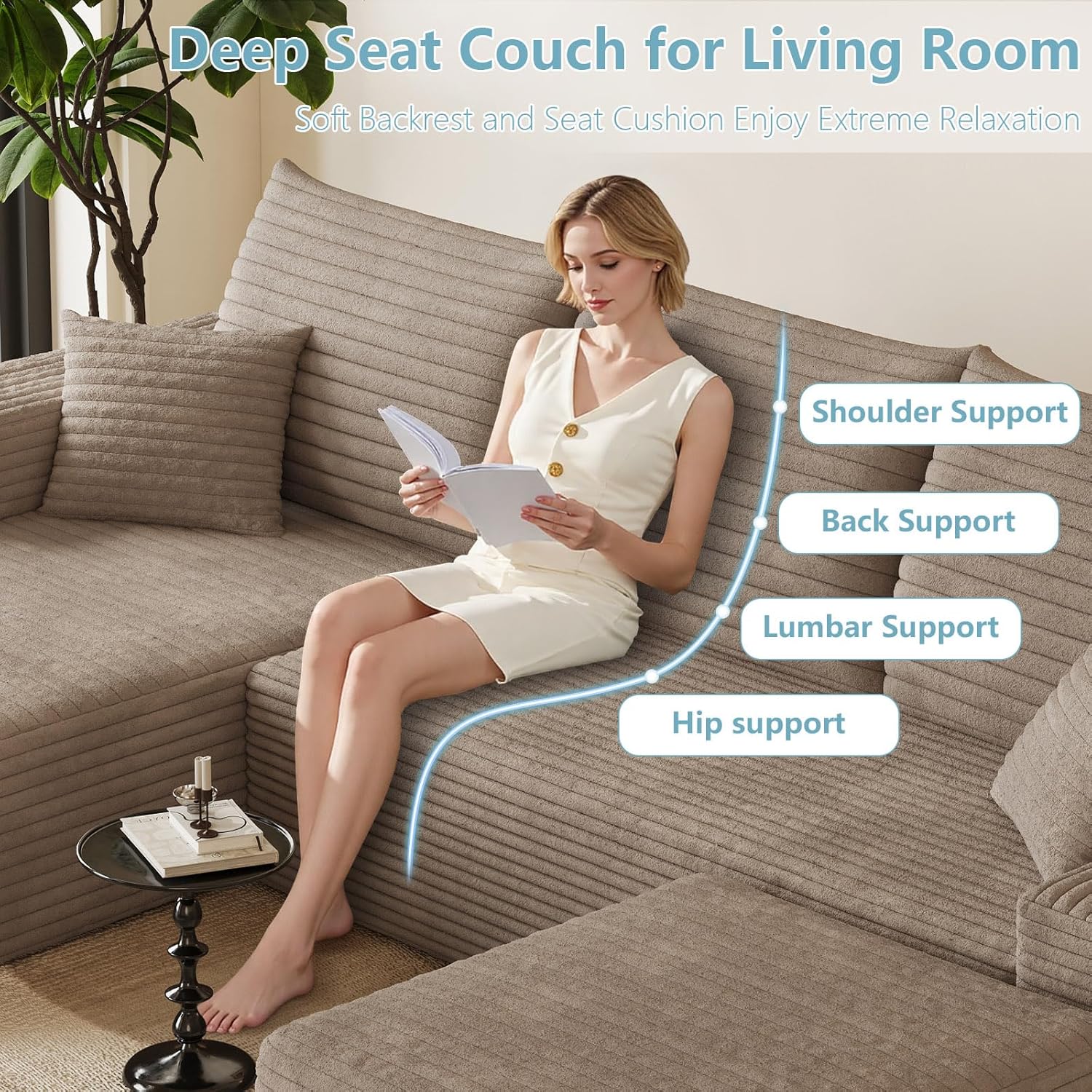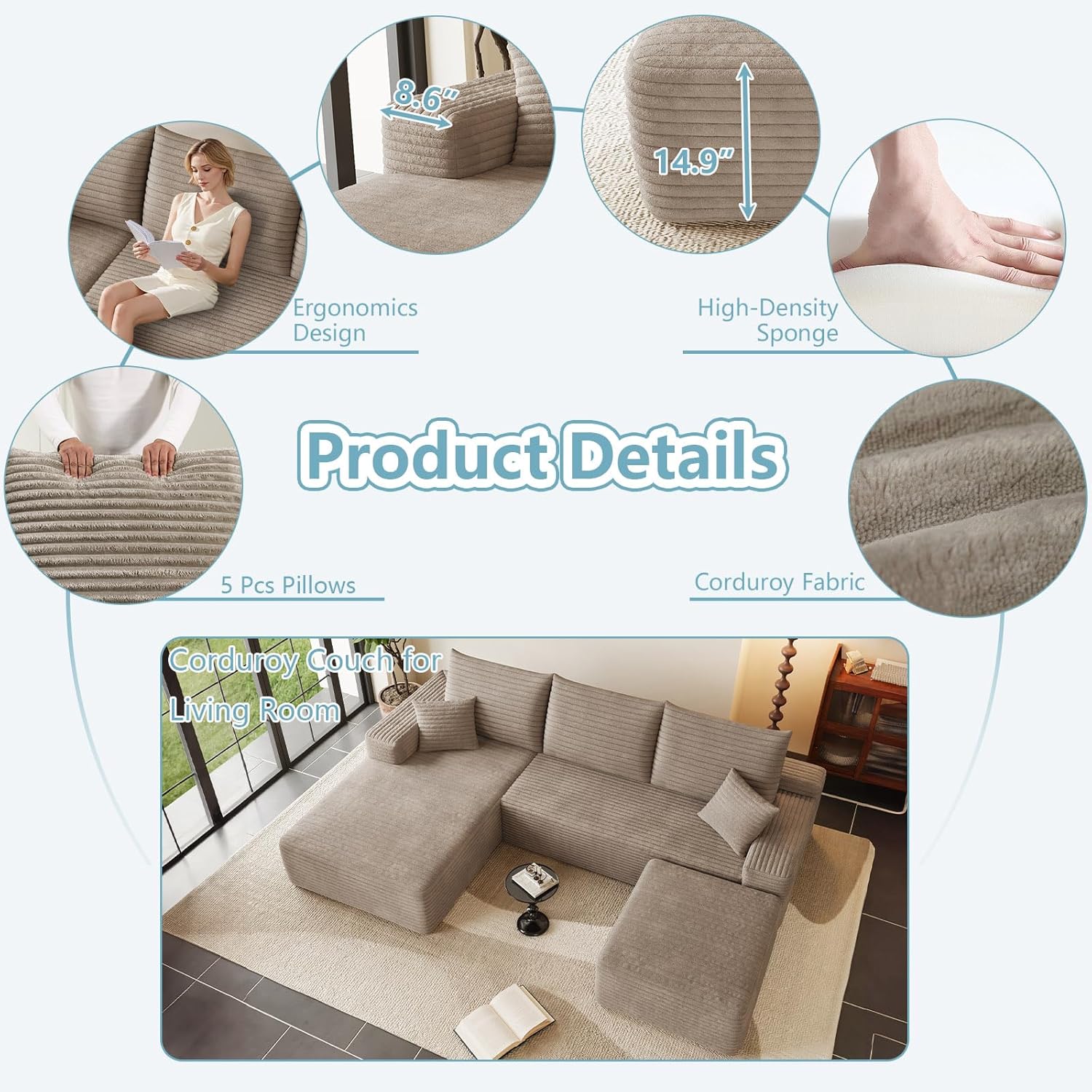 Luxurious Corduroy Upholstery: Sink into luxury with our high-quality corduroy fabric, designed to be soft, breathable, and durable. This skin-friendly material provides a comfortable seating experience while adding a sophisticated touch to your dcor. The sofa comes with 3 large cushions and 2 throw pillows, enhancing both comfort and longevity. It's a perfect combination of modern style and functional comfort for your home