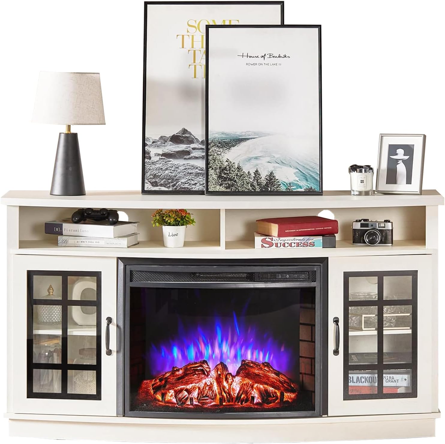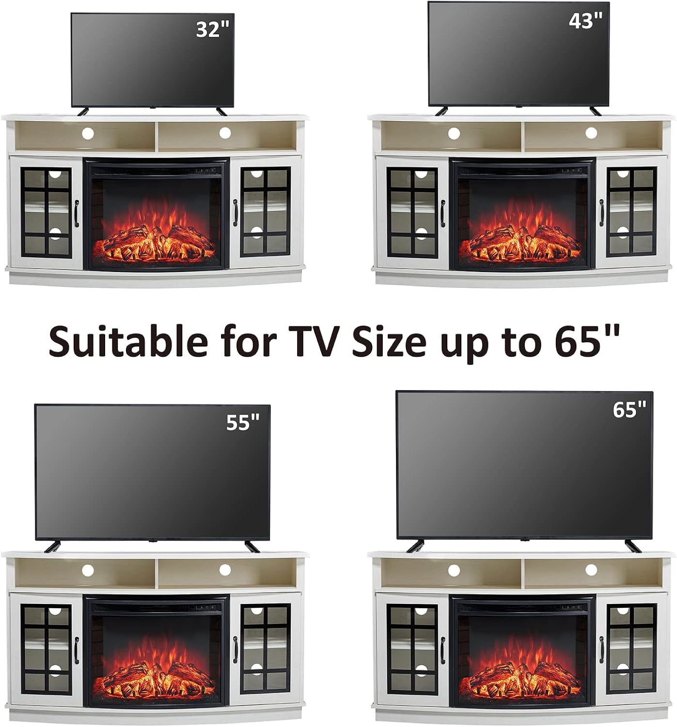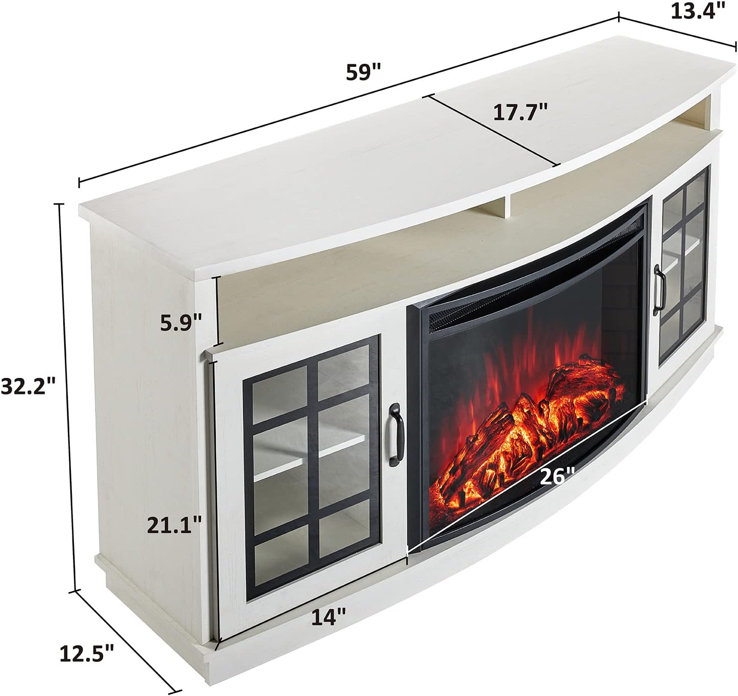 [Dimension] Overall Dimension: 59"(W) x 32.2"(H) x 17.7"(D). Perfectly accommodates flat&curved screen TVs in the market, up to 65 inches, 90lbs. Electric fireplace Dimension: 26 "(W) x 21.26"(H).