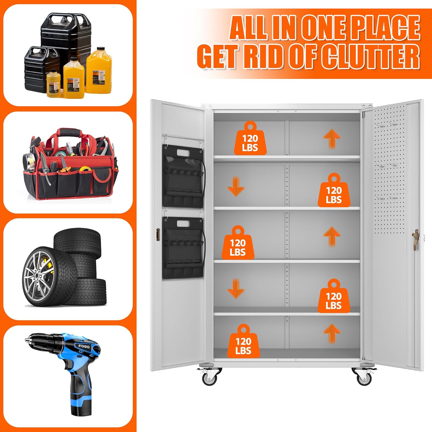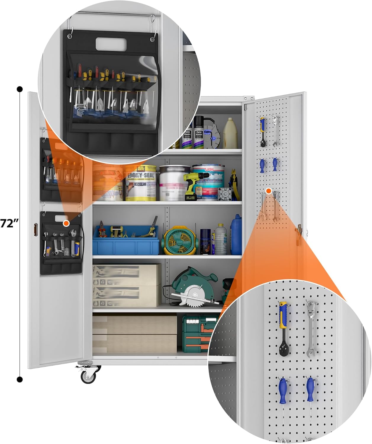 Excellent FeaturesMetal storage cabinet with wheels has 4 adjustable and removable shelves, which can offer you 80% space than other cabinet. Each shelf of the storage cabinet on wheels can hold up to 150lbs. You can add lighting by yourself on top of the cabinet if it was dark where you keep it