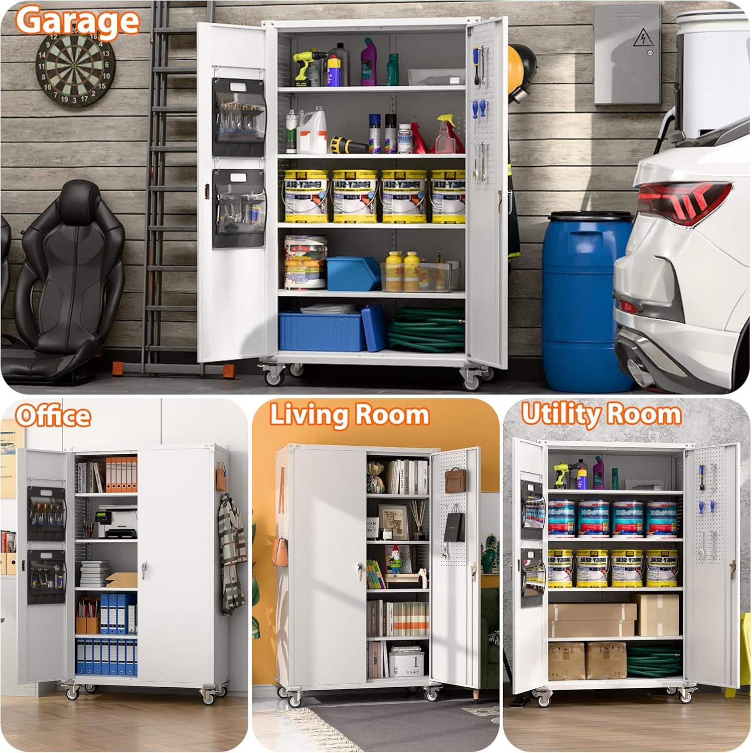 Detachable Casters: Metal Storage Cabinet with Wheels was designed with 4 detachable and lockable 360 rotating casters, you can easily move around this cabinet on wheels