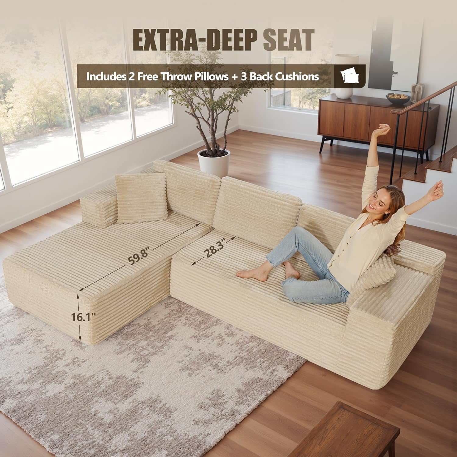 Spacious Seating & Versatile UseWith a generous 108-inch length and extra-deep 30-inch seats, this sectional sofa offers plenty of room to stretch out, lounge, or nap. Perfect for hosting family and guests during movie nights or casual gatheringscomfort and style combined