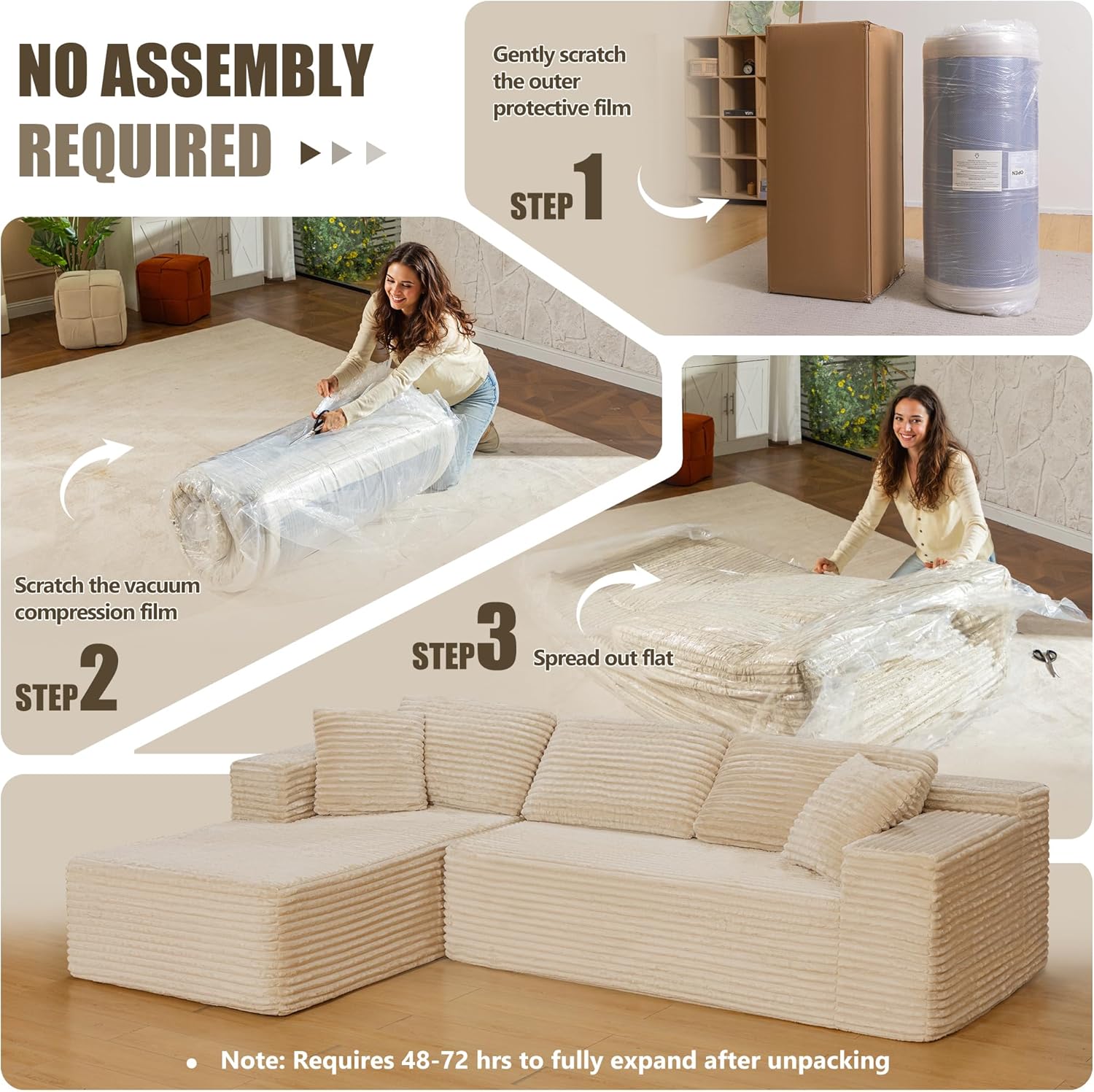 No assembly requiredNo assembly required! Each sofa module arrives vacuum-sealed for easy handlingeven one person can set it up effortlessly. Simply unbox, unroll, and watch as the high-elastic foam expands to its original form. Full restoration may take up to 72 hours