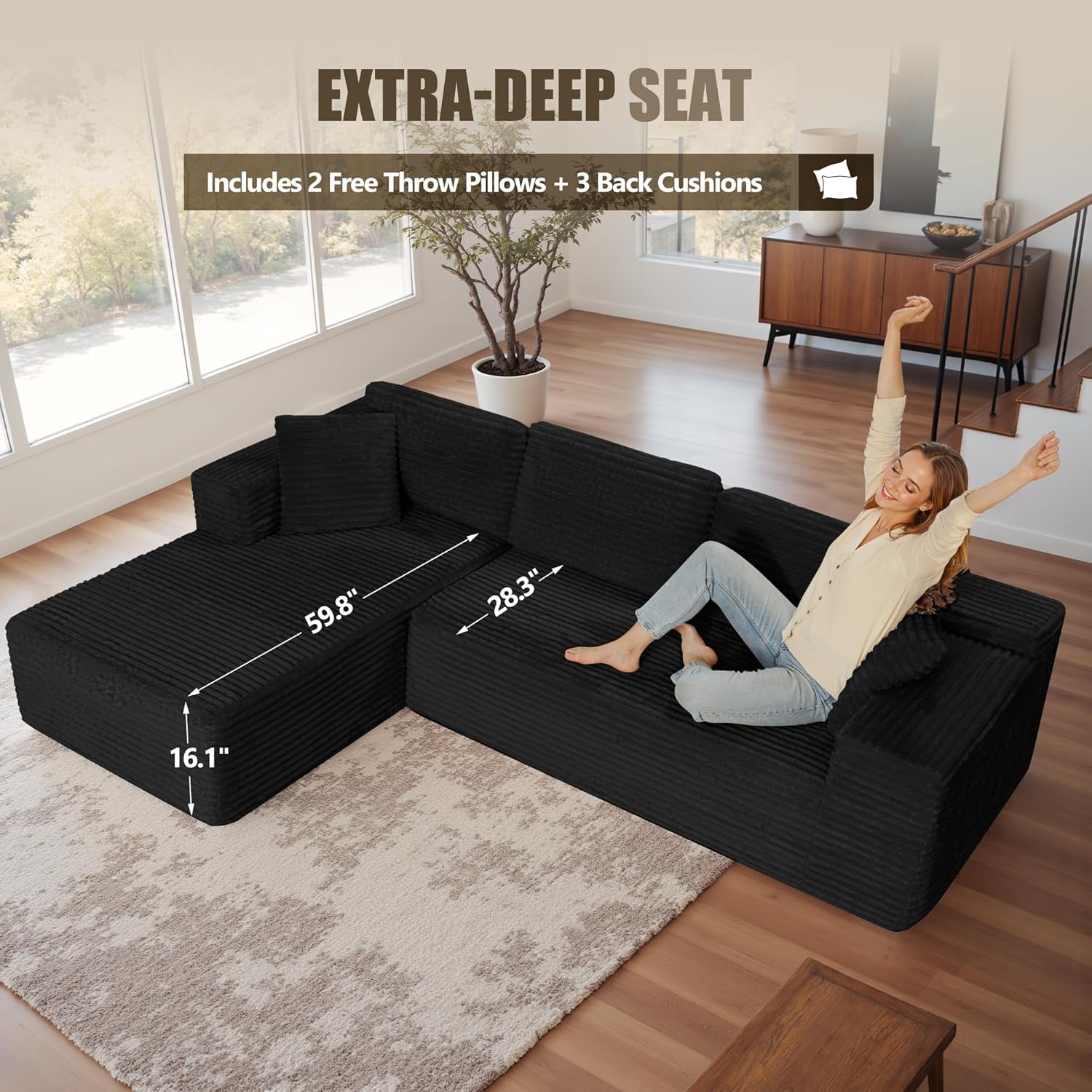 Spacious Seating & Versatile UseWith a generous 108-inch length and extra-deep 30-inch seats, this sectional sofa offers plenty of room to stretch out, lounge, or nap. Perfect for hosting family and guests during movie nights or casual gatheringscomfort and style combined