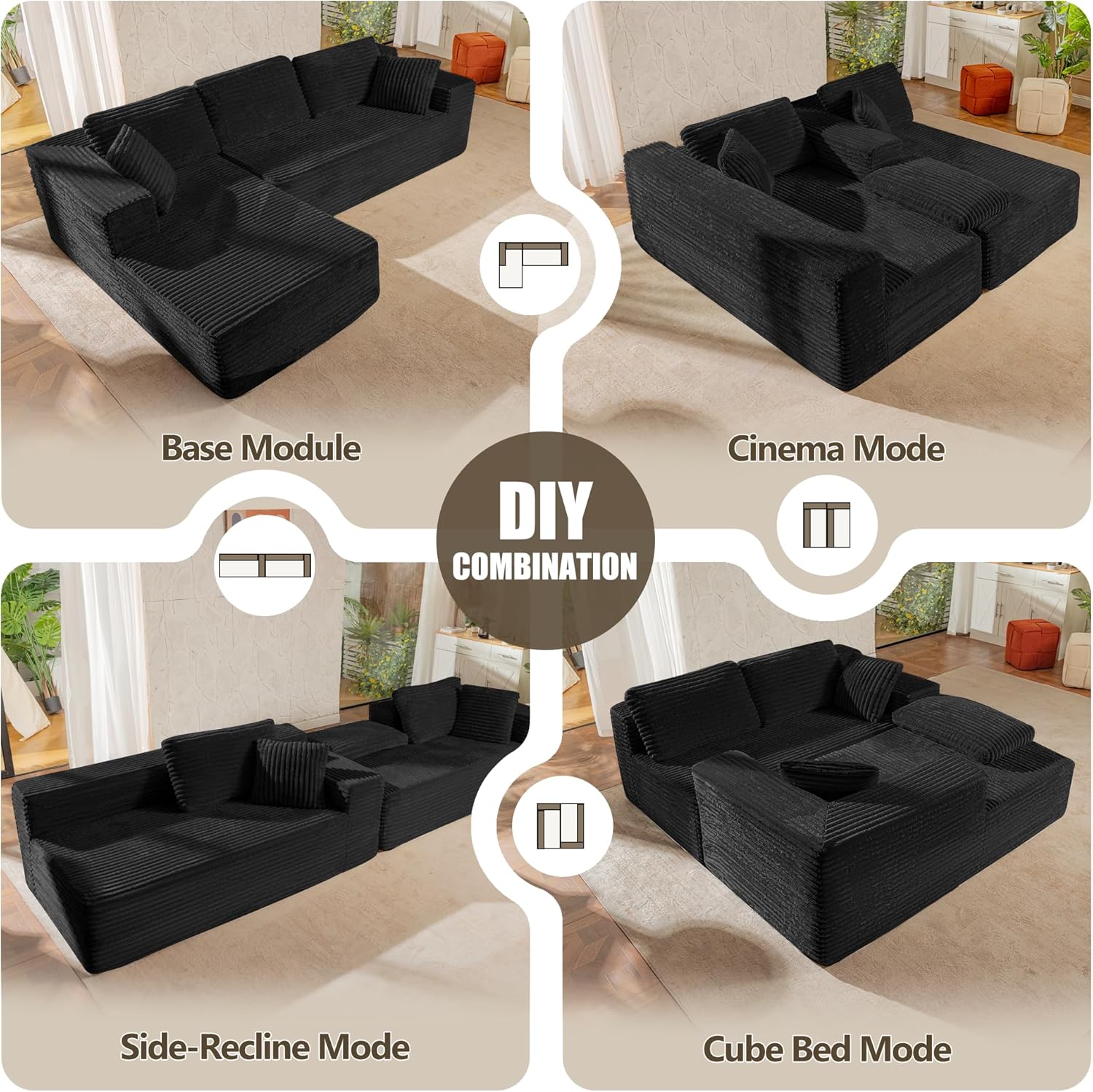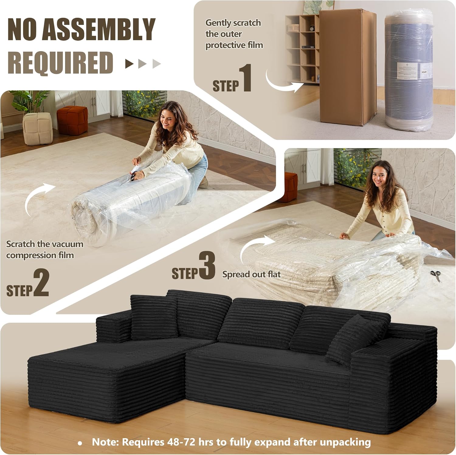 No assembly requiredNo assembly required! Each sofa module arrives vacuum-sealed for easy handlingeven one person can set it up effortlessly. Simply unbox, unroll, and watch as the high-elastic foam expands to its original form. Full restoration may take up to 72 hours