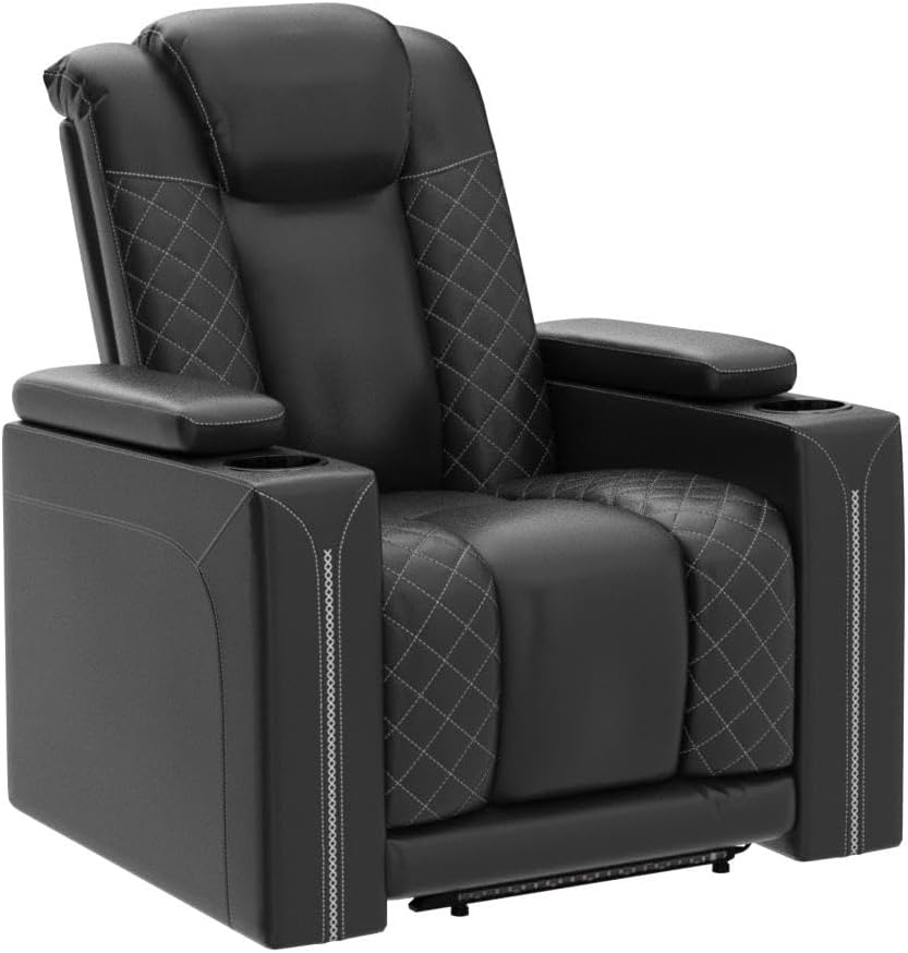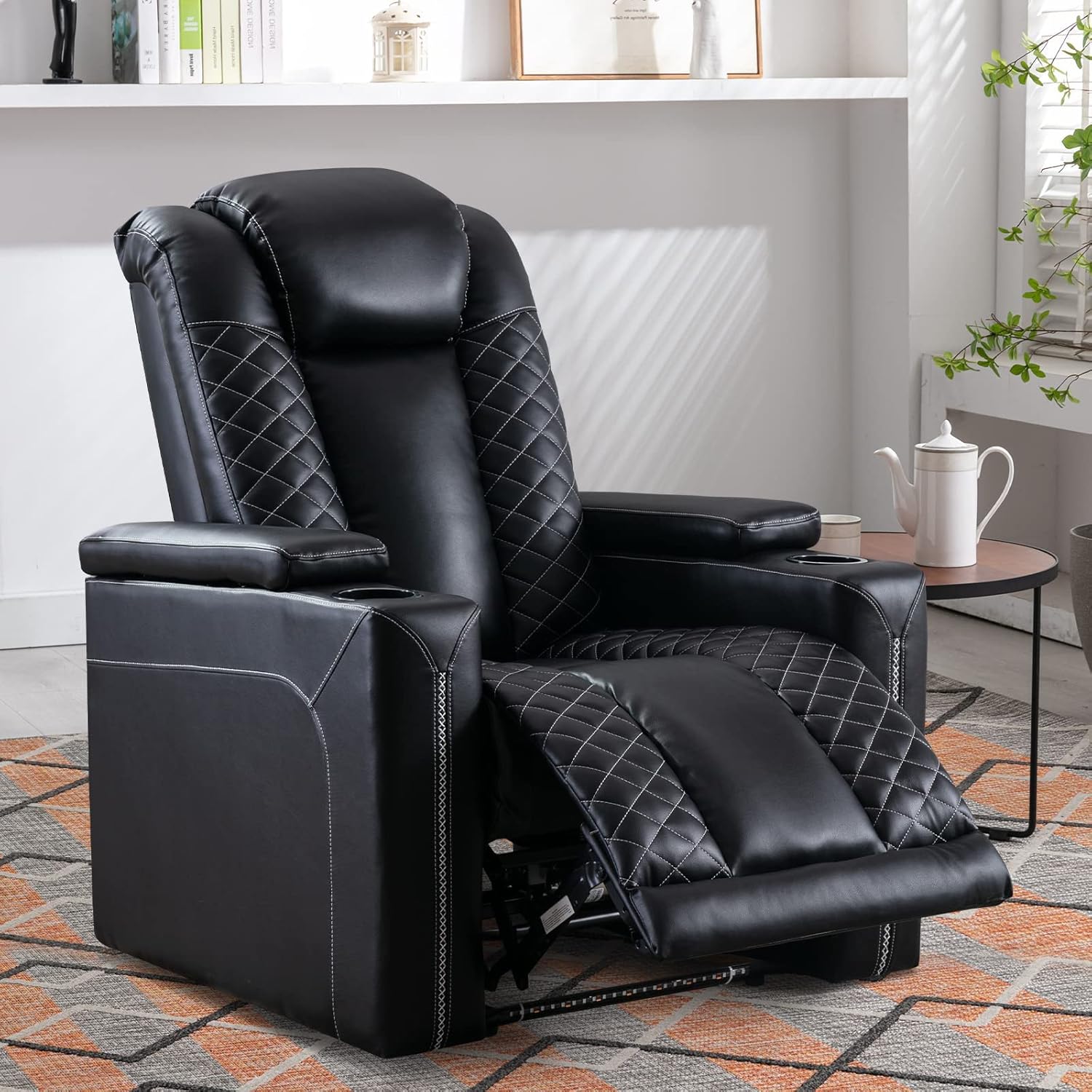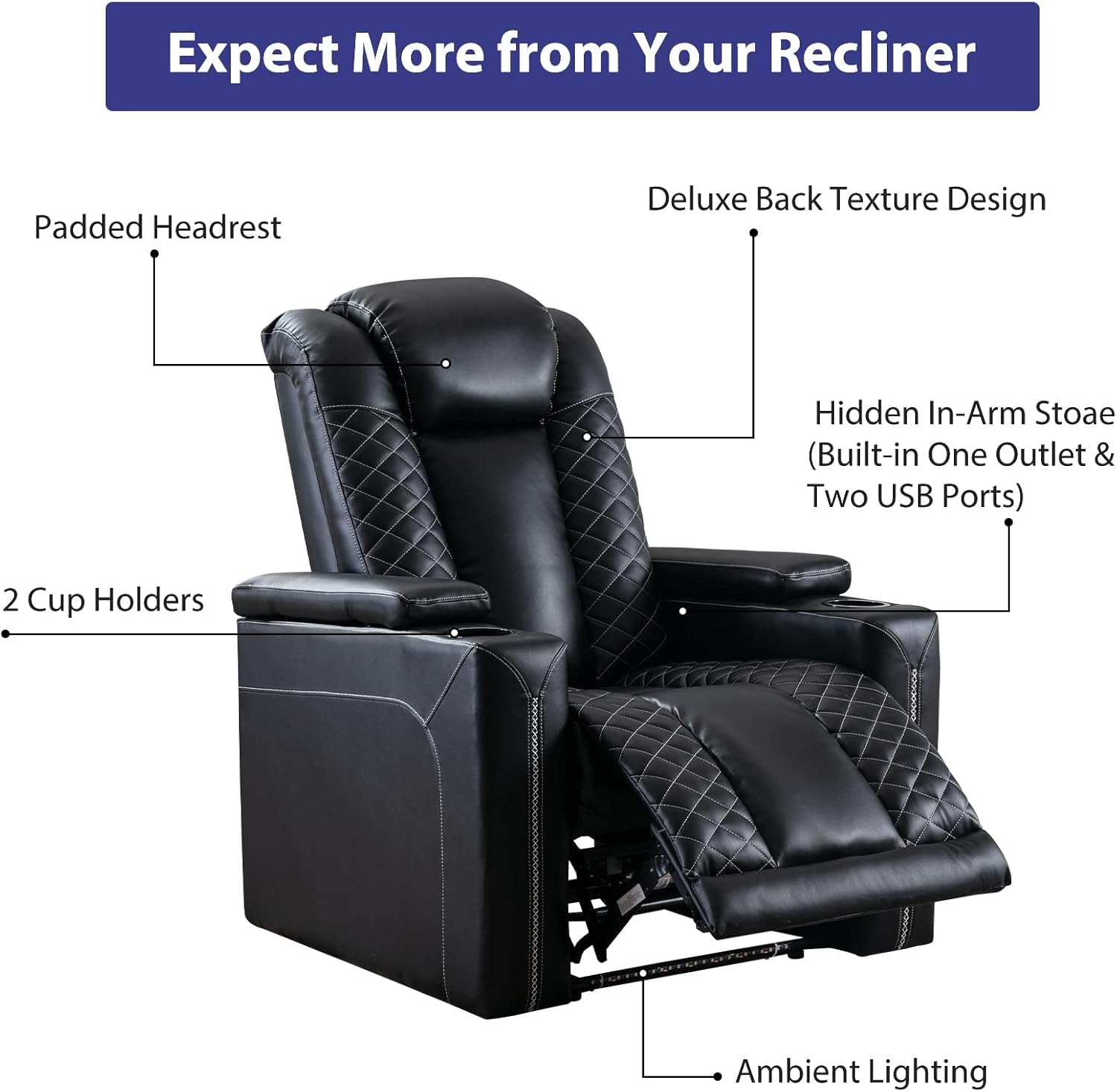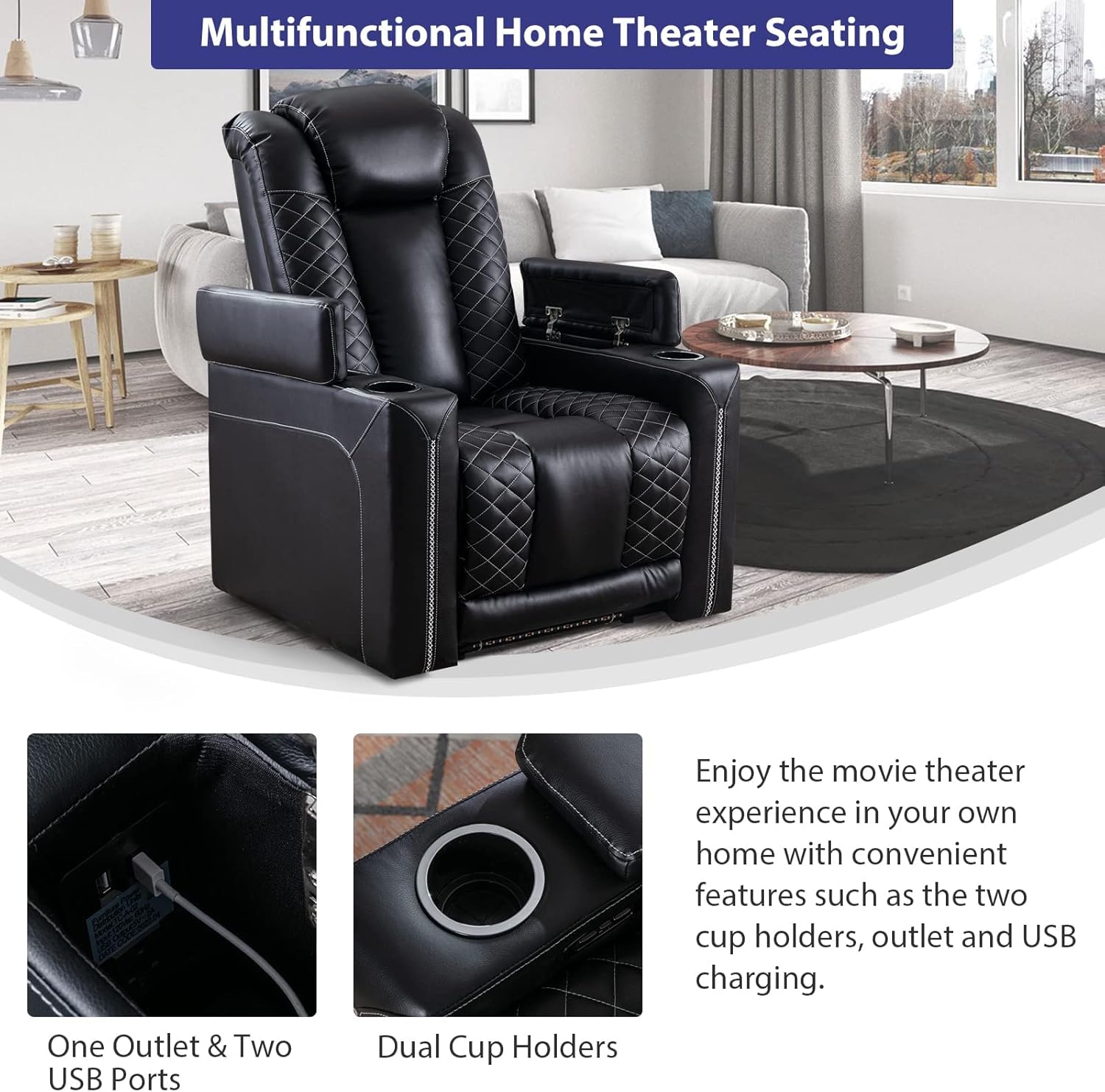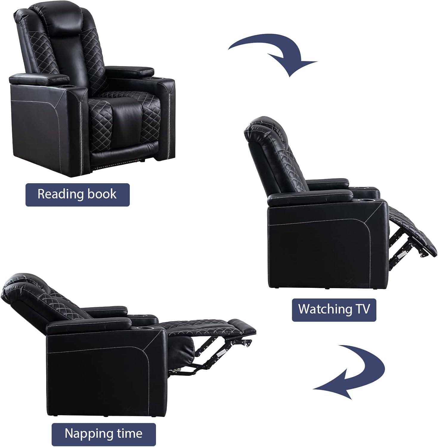 • Electric Power Recliner Chairs with USB Ports and Cup Holders, Breathable Faux Leather Home Theater Seating Recliner with Hidden Arm Storage, Ambient Lighting, Black