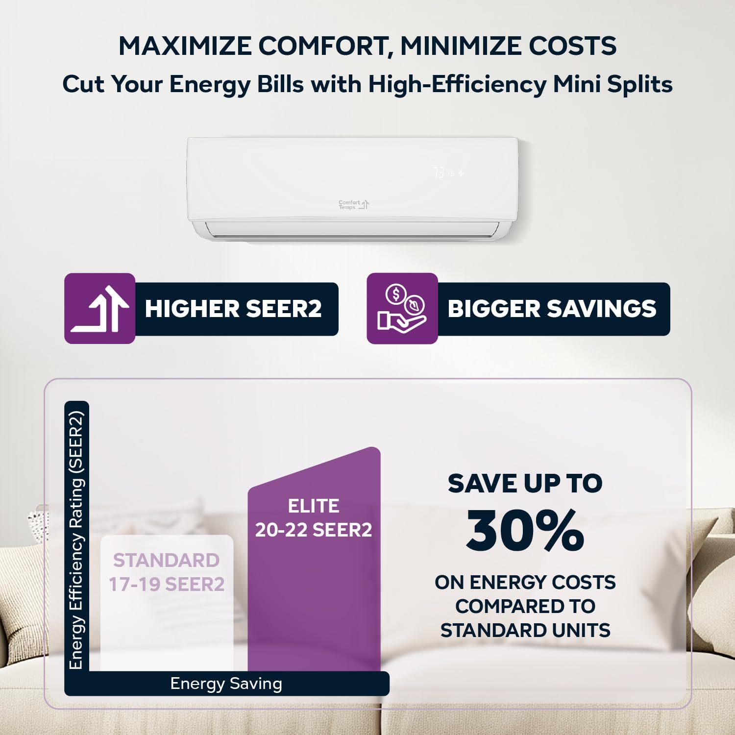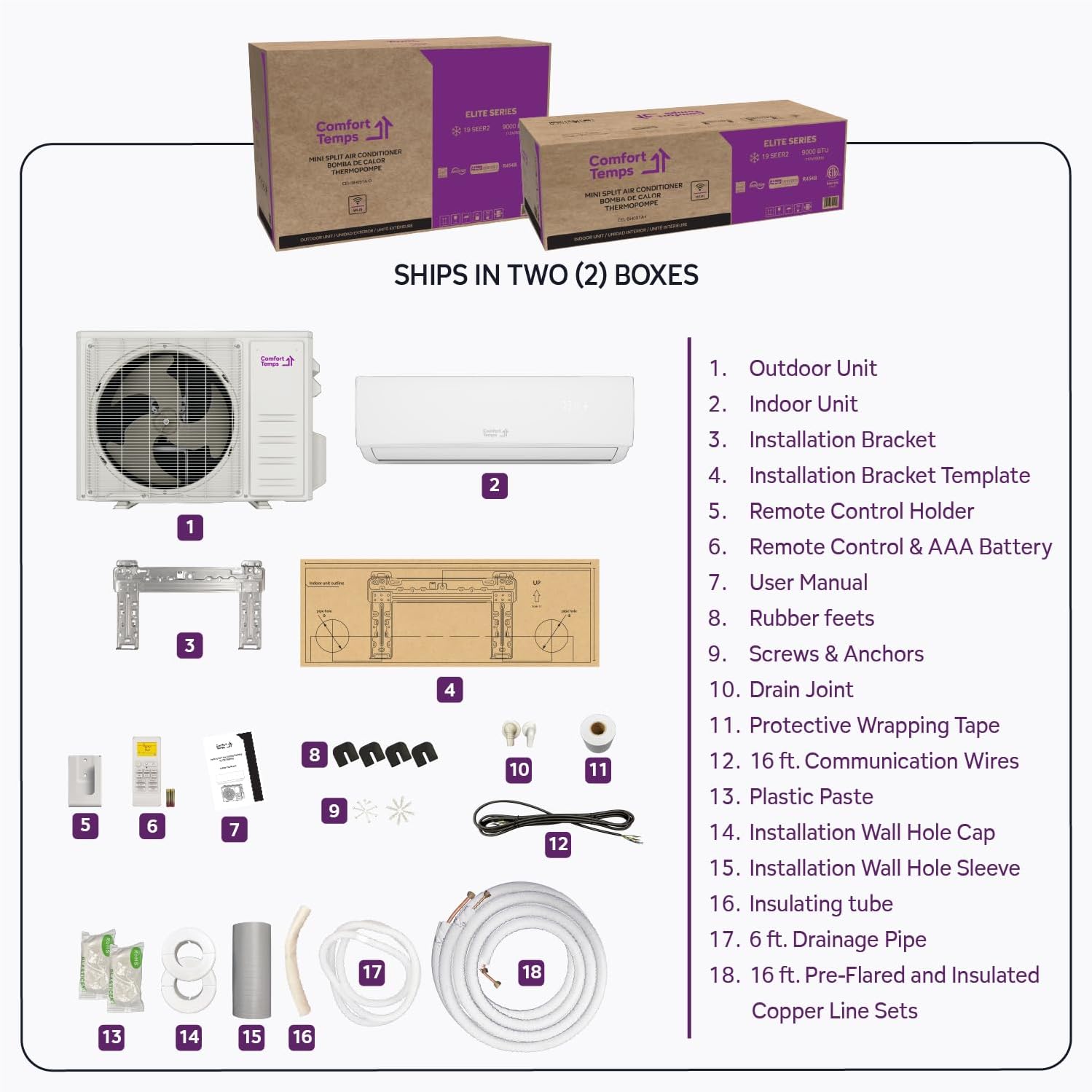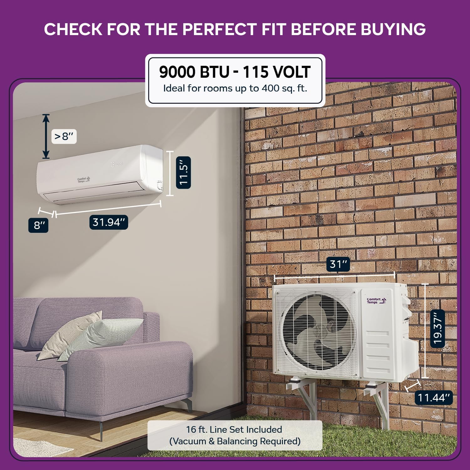 ComfortTemps Elite Series - Energy-Saving 9000 BTU Mini Split 110V 19 SEER, Pre-Charged, Ductless, Quiet & Comfortable Mini Split AC/Heating System with WiFi & Complete Easy Install Kit
