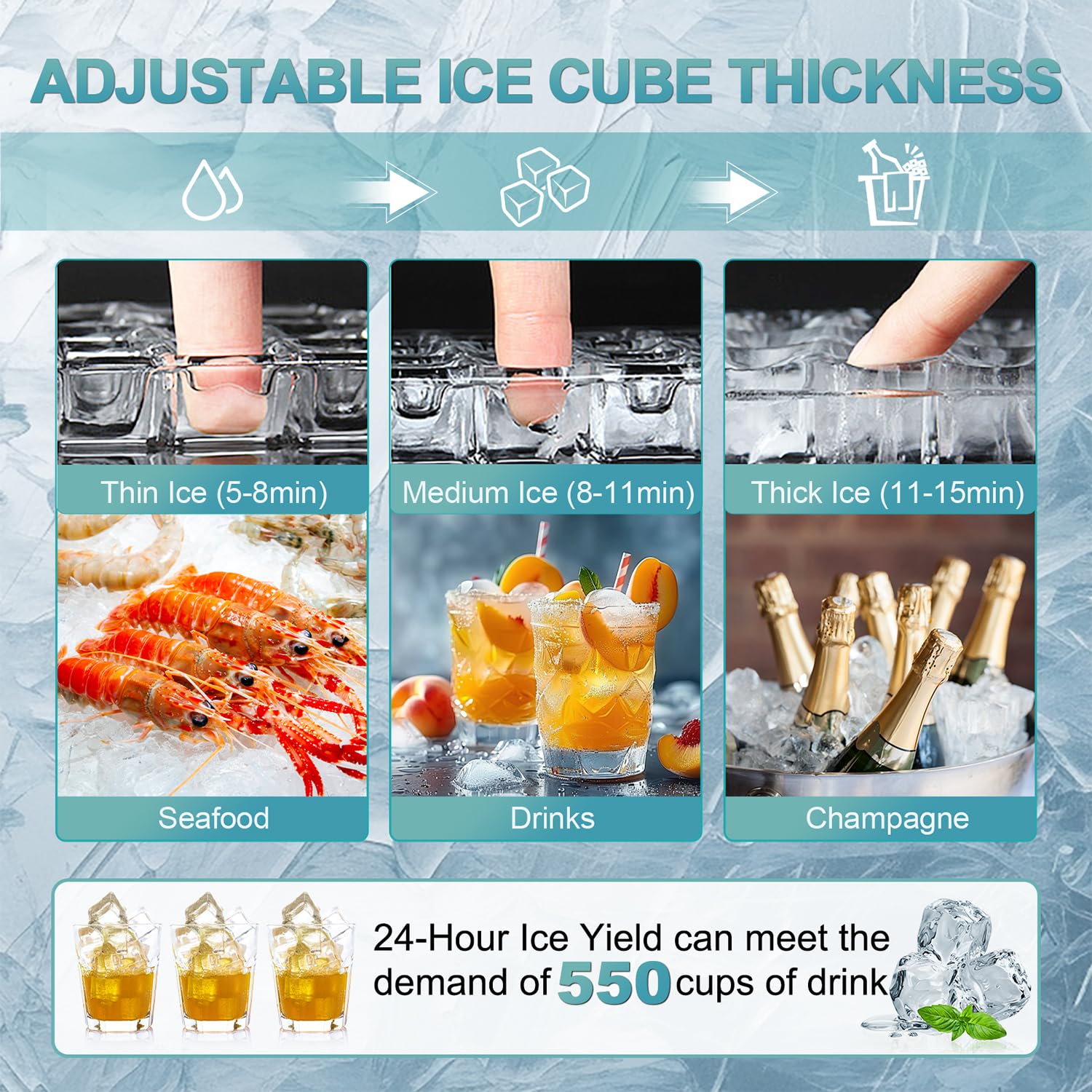 72 ICE CUBES PER CYCLE & ADJUSTABLE ICE THICKNESS: The ice thickness can be adjusted by setting the ice-making time. Every 815 minutes, this machine produces 72 ice cubes, easily meeting the needs of small commercial useenough to make over 800 cups of iced drinks.