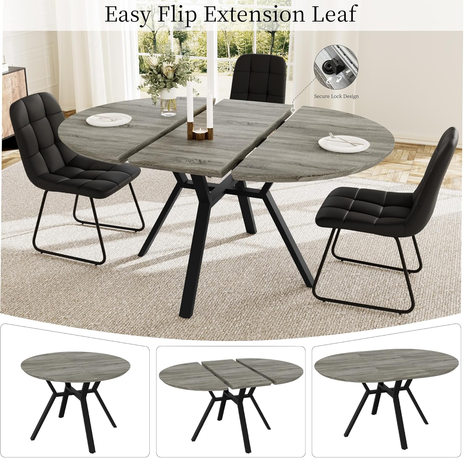 Space-Saving Dining Table Set: This round dining table with chairs easily extends from 43.3" round to 59.1" oval, adapting to different dining needs and room sizes. The hidden center leaf requires no extra storage space, simply pull to extend and lock securely for stable use.