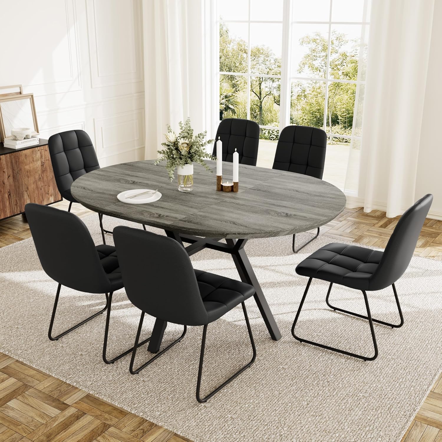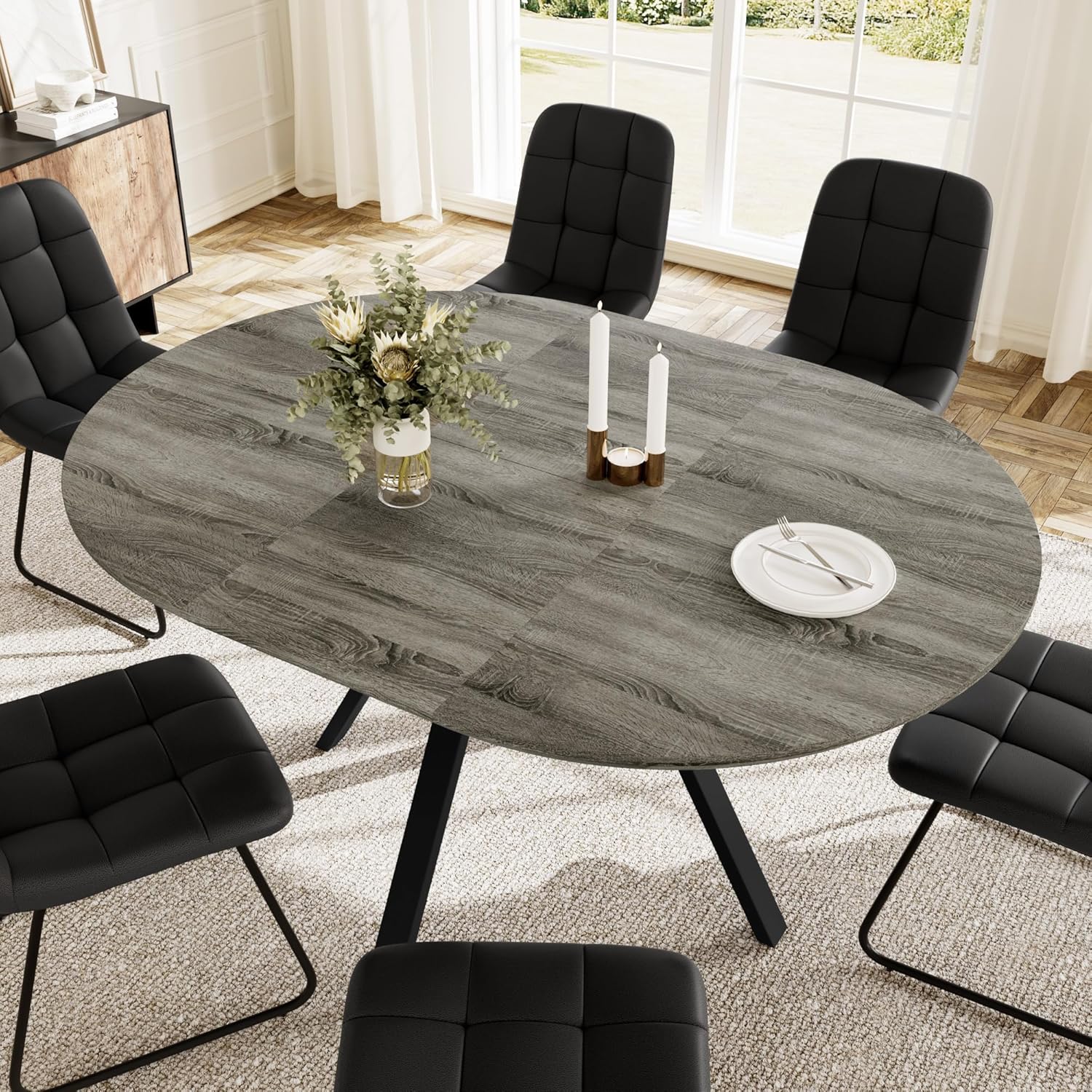 • Extendable Round Dining Table Set for 6 People, 43.3"-59.1" Extendable Kitchen Table with 6 Upholstered Chairs, Space Saving for Kitchen Dining Room (Grey Table+6 U-Shaped Black Chairs)