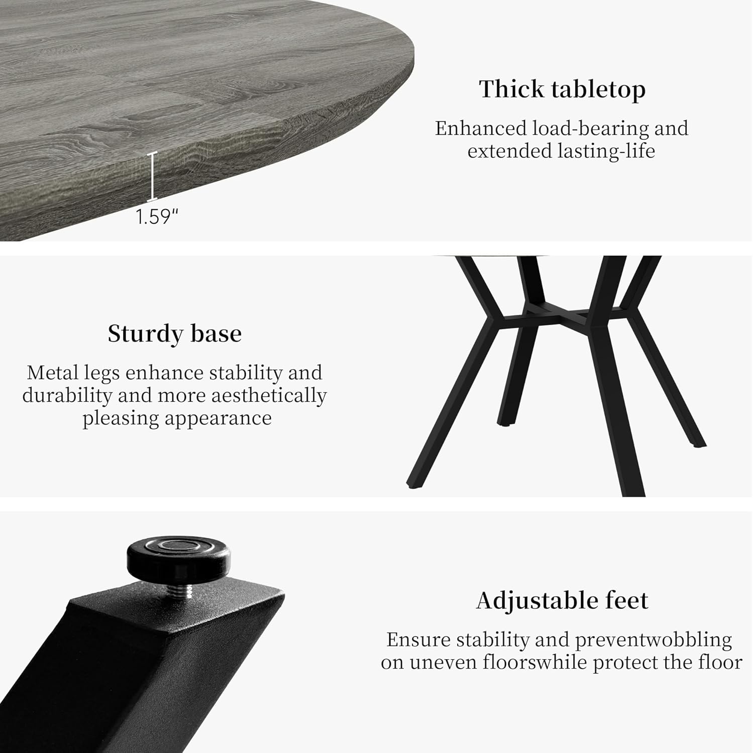 Durable and Sturdy: Crafted from high-quality MDF with a tabletop thickness of 1.57 inches, the round dining room table is water-resistant and waterproof. Supported by strong metal legs, it can hold up to 130 lb. Adjustable leg pads keep the table level on uneven floors, preventing floor scratches.