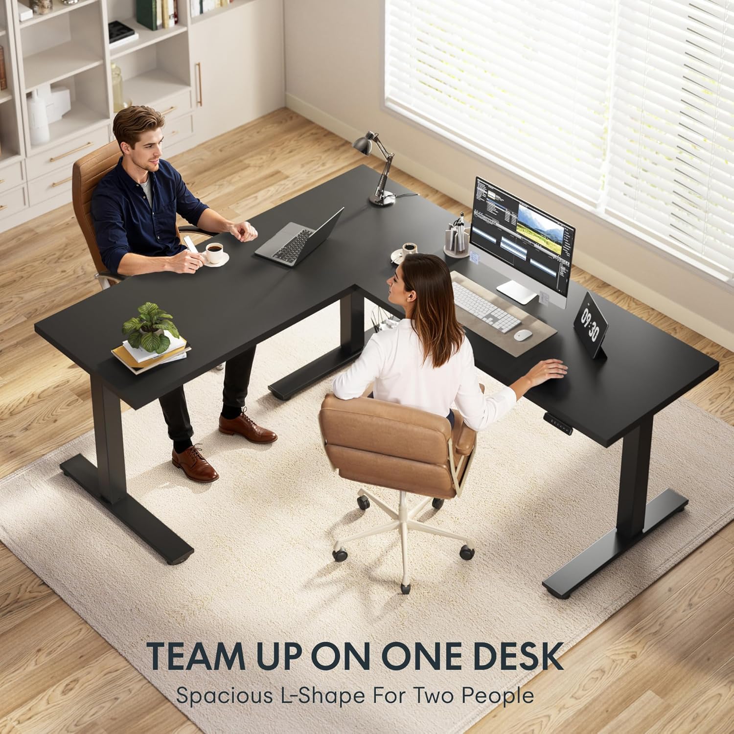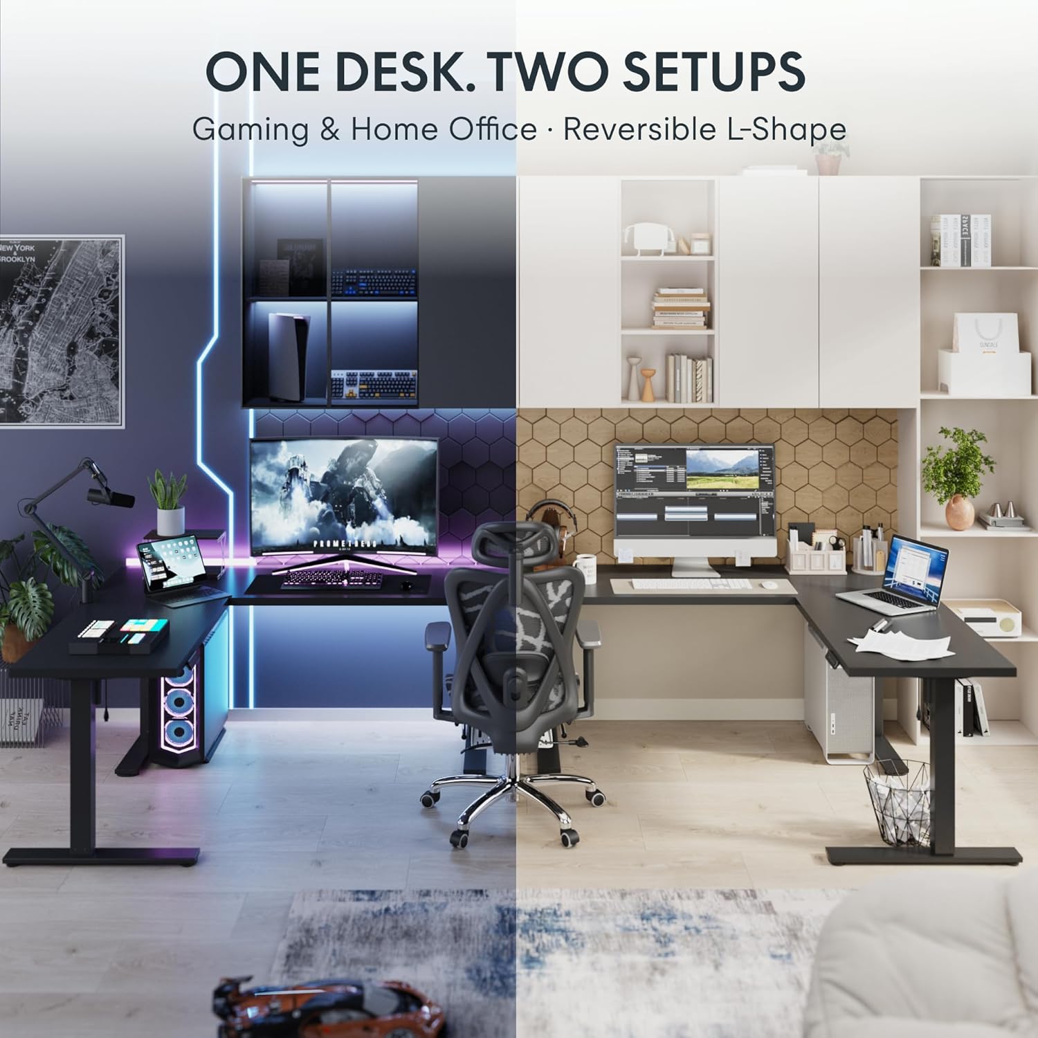 VERSATILE ORIENTATIONThis height-adjustable desk features a wider desktop section that can be positioned on either the left or right side, allowing you to customize the layout to best fit your space.