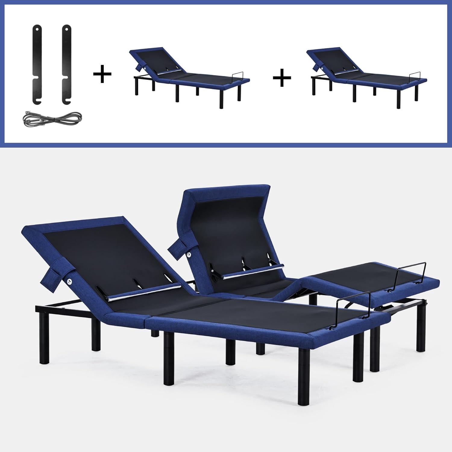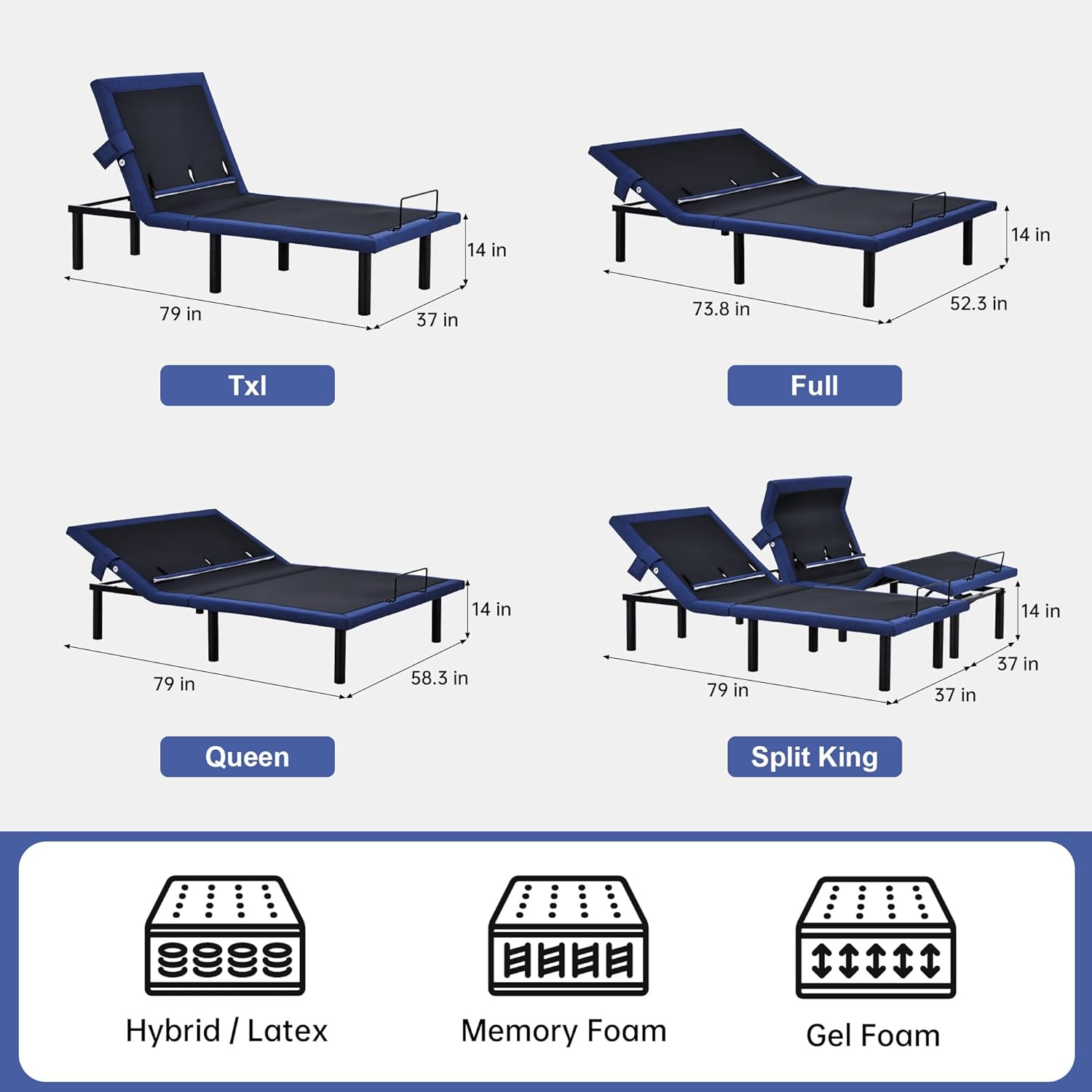 COMPLETE SIZE CONFIGURATIONS: This adjustable bed frame is available in Twin XL(37"79")/Full(52.3"73.8")/Queen(58.3"79"). Two Twin XL bases combine to create 78"79" Split King. Steel frame supports 750lbs weight capacity