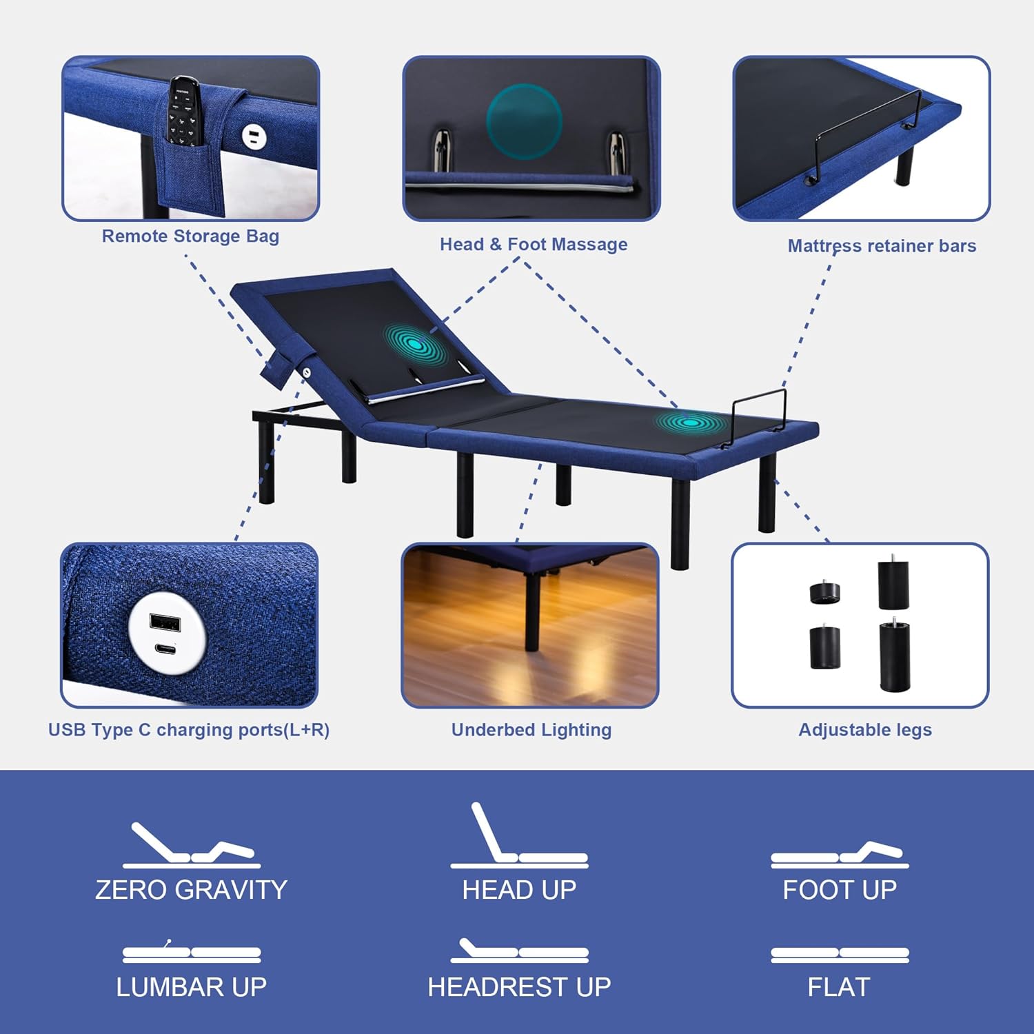 • Adjustable Twin XL Bed Base Frame with Head and Foot Lift, Lumbar Support, Massage, Under-Bed Lights,Left Right USB+C, Memory Positions, Zero Gravity