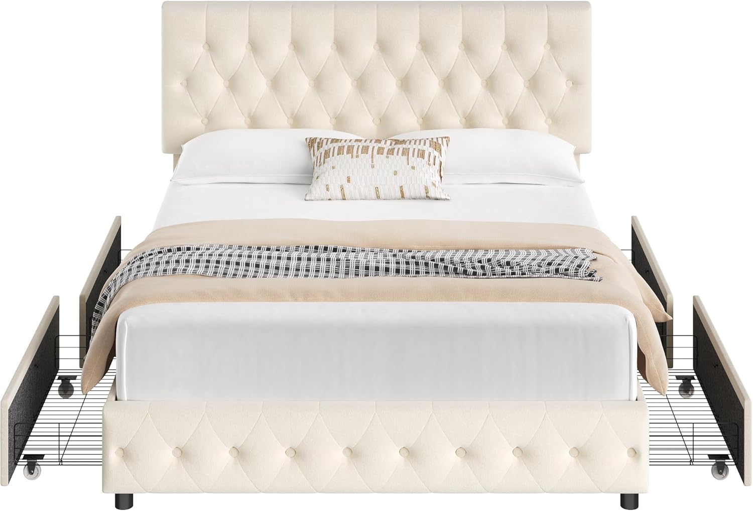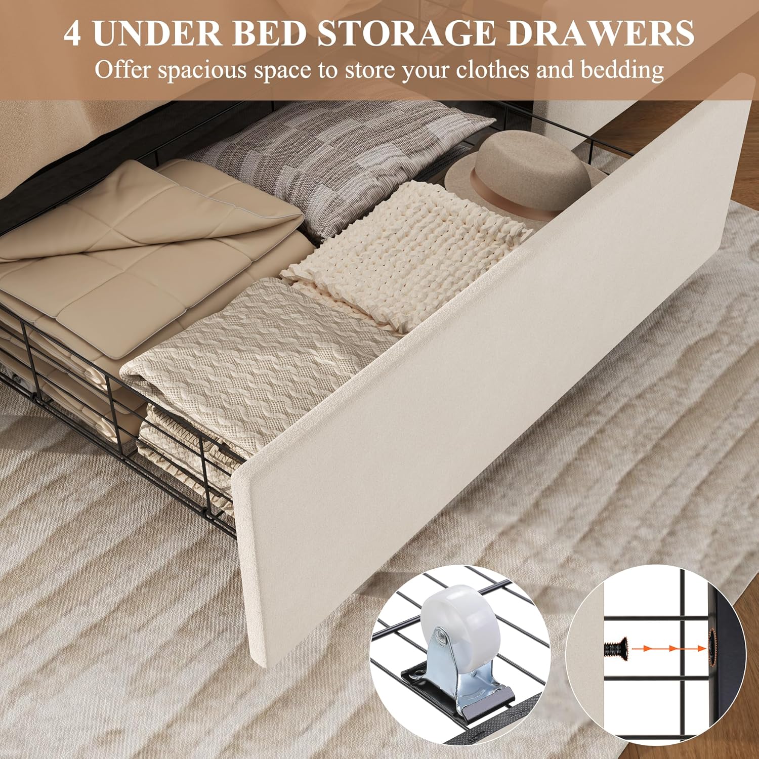 Bed Frame with Sturdy Structure: The drawer bed frame adopts a steel frame structure with a wooden slat system to support the mattress, ensuring the firmness and stability of the bed frame. upholstered platform bed easily supports up to 850 pounds.