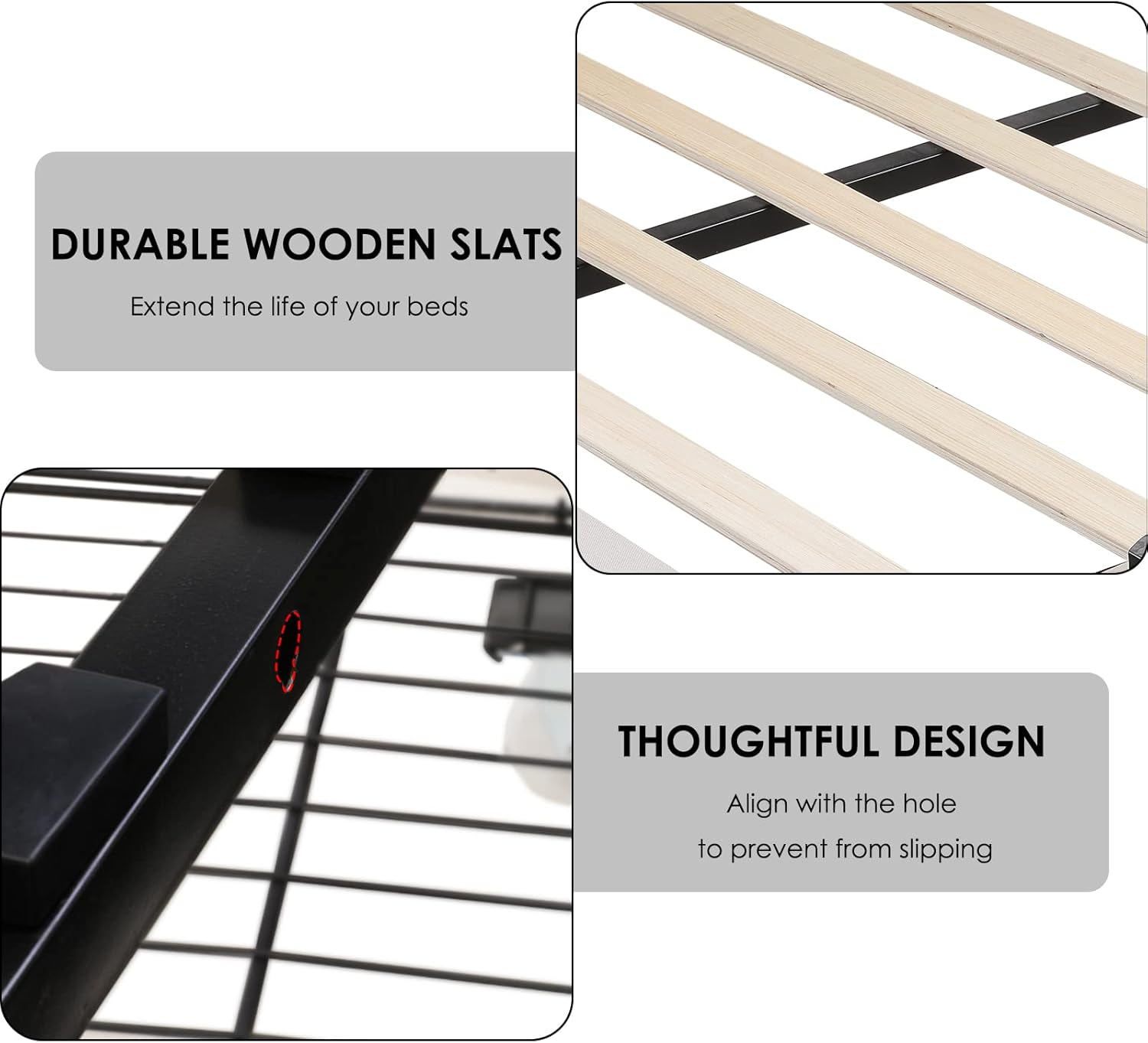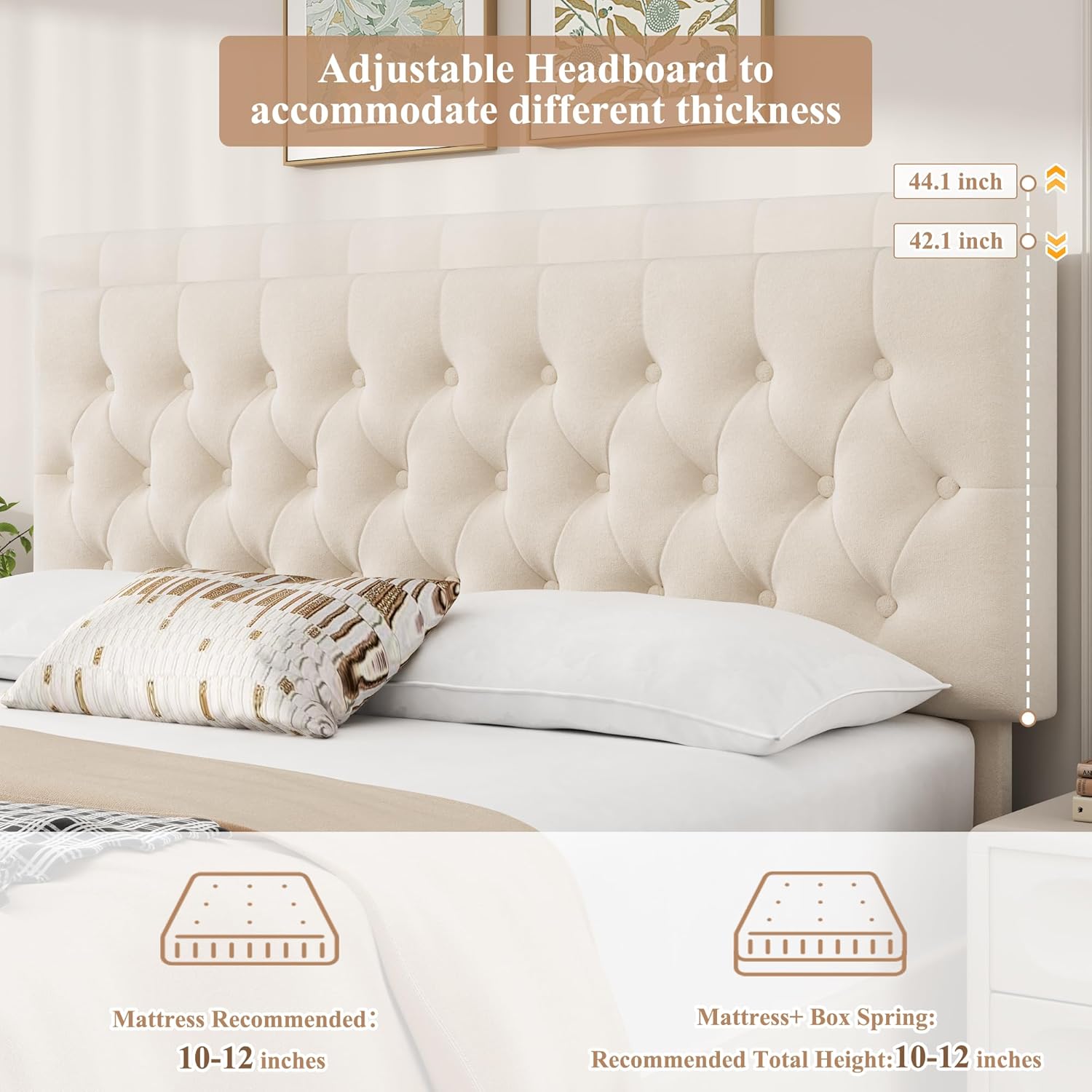 Bed Frame with Tufted Headboard: The tufted headboard really gives the bed frame a classic design and with elegance and sophistication in every detail. adjustable headboard design 44.5-50 inch, allows you to use 8-12 inch mattresses.