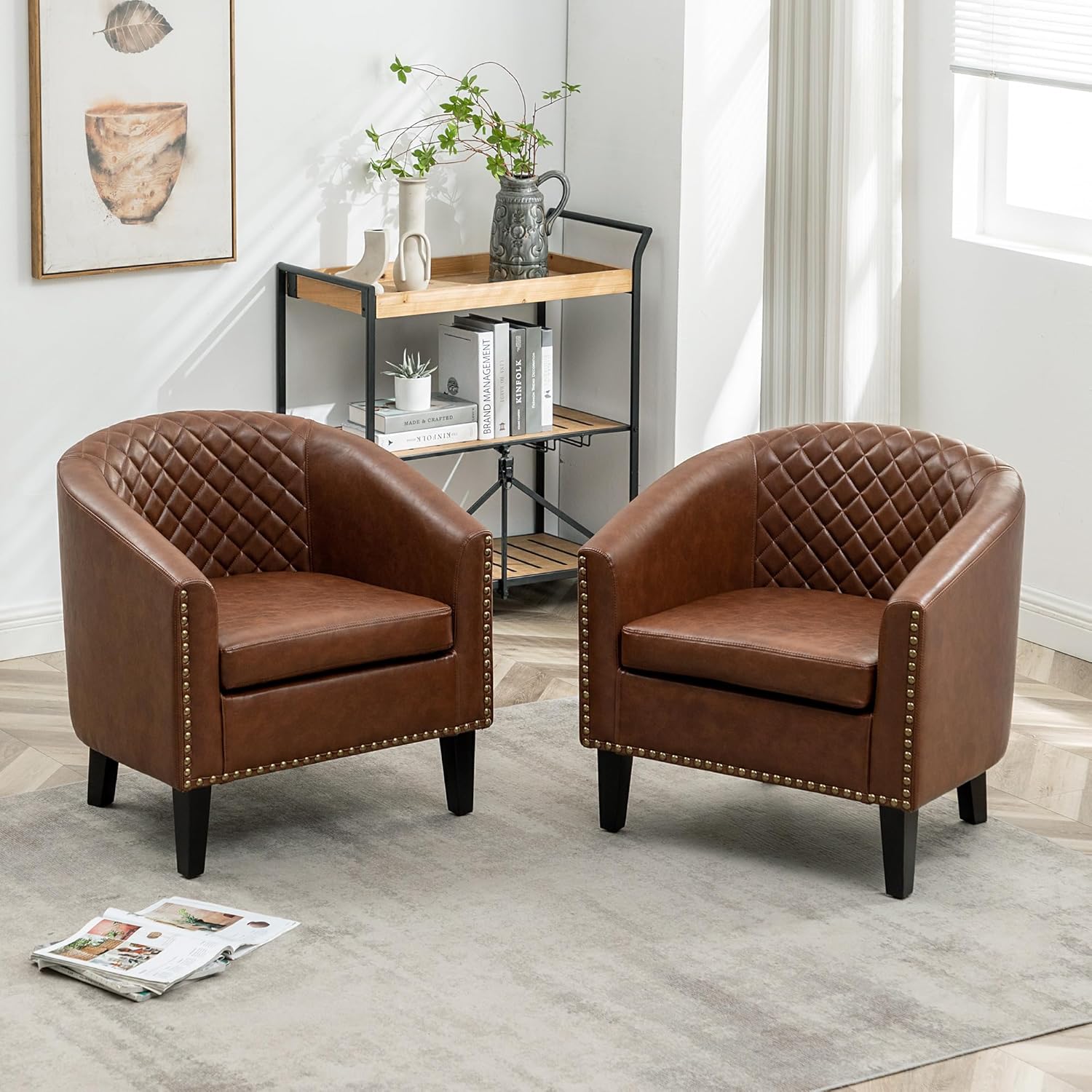 SET OF 2 SOLID ARMCHAIRS - Each 29-inch armchair has a solid and engineered wood frame with slightly tapered legs for a modern look. Four solid rubber wood legs with a classic black finish give the chair a sophisticated and elegant look. This barrel club chair is sturdy and long-lasting, with a weight-bearing capacity of 330 lbs.