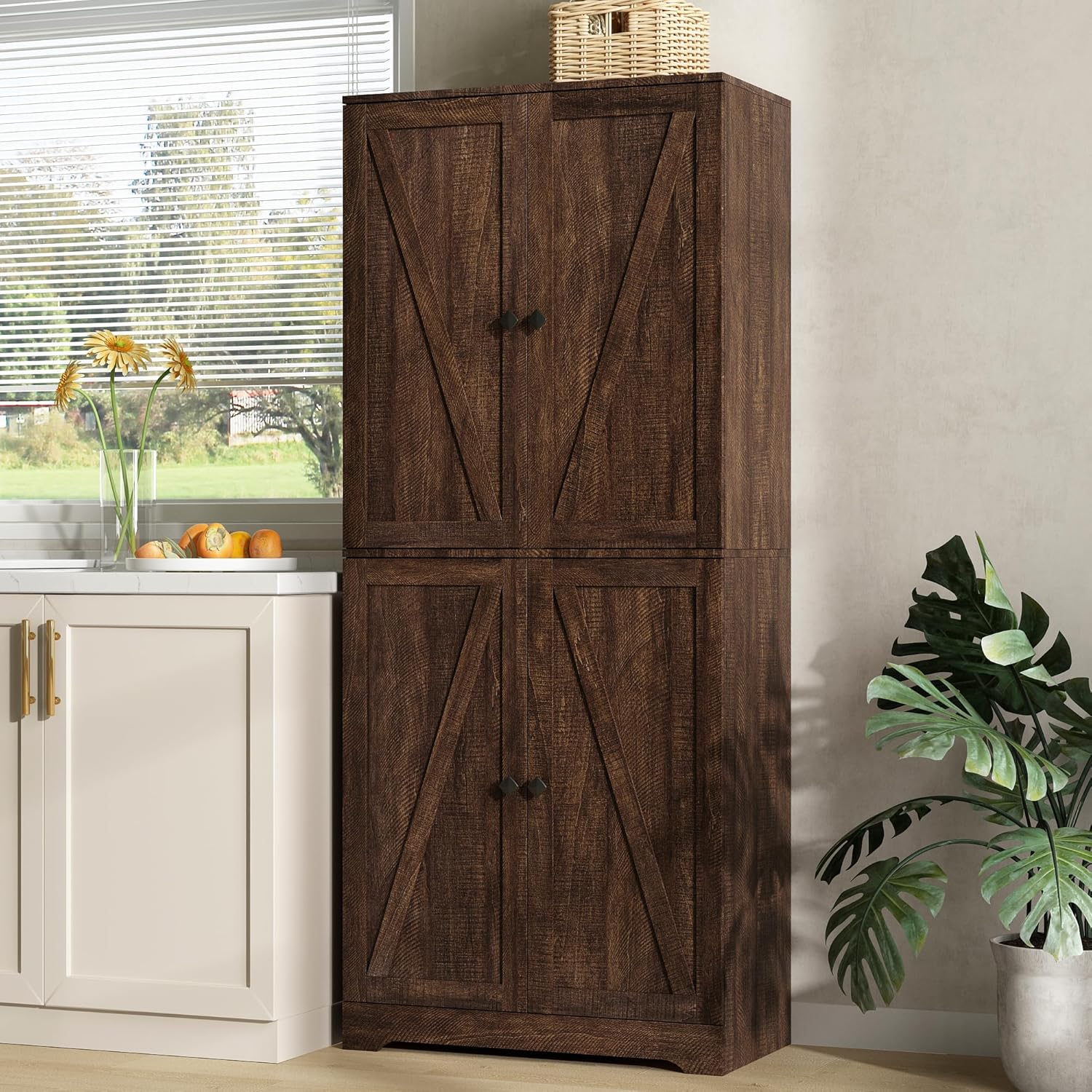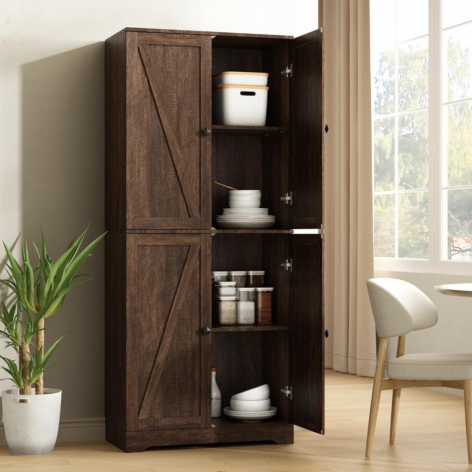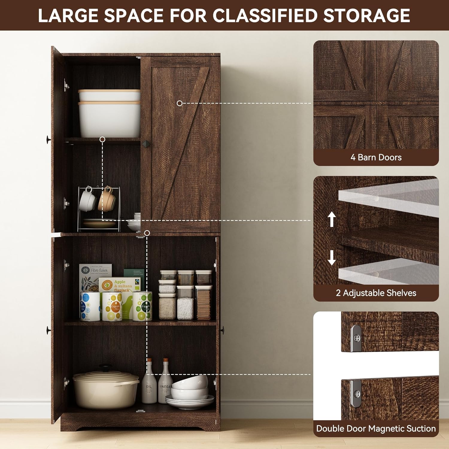 Farmhouse Style Pantry: With its sleek rectangular silhouette and 4 classic barn doors, this farmhouse kitchen pantry storage cabinet showcases a rustic wood texture finish accented by squre metal knobs. Available in three stunning colors: white, black, and ash greythis pantry storage solution seamlessly blends with any decor.