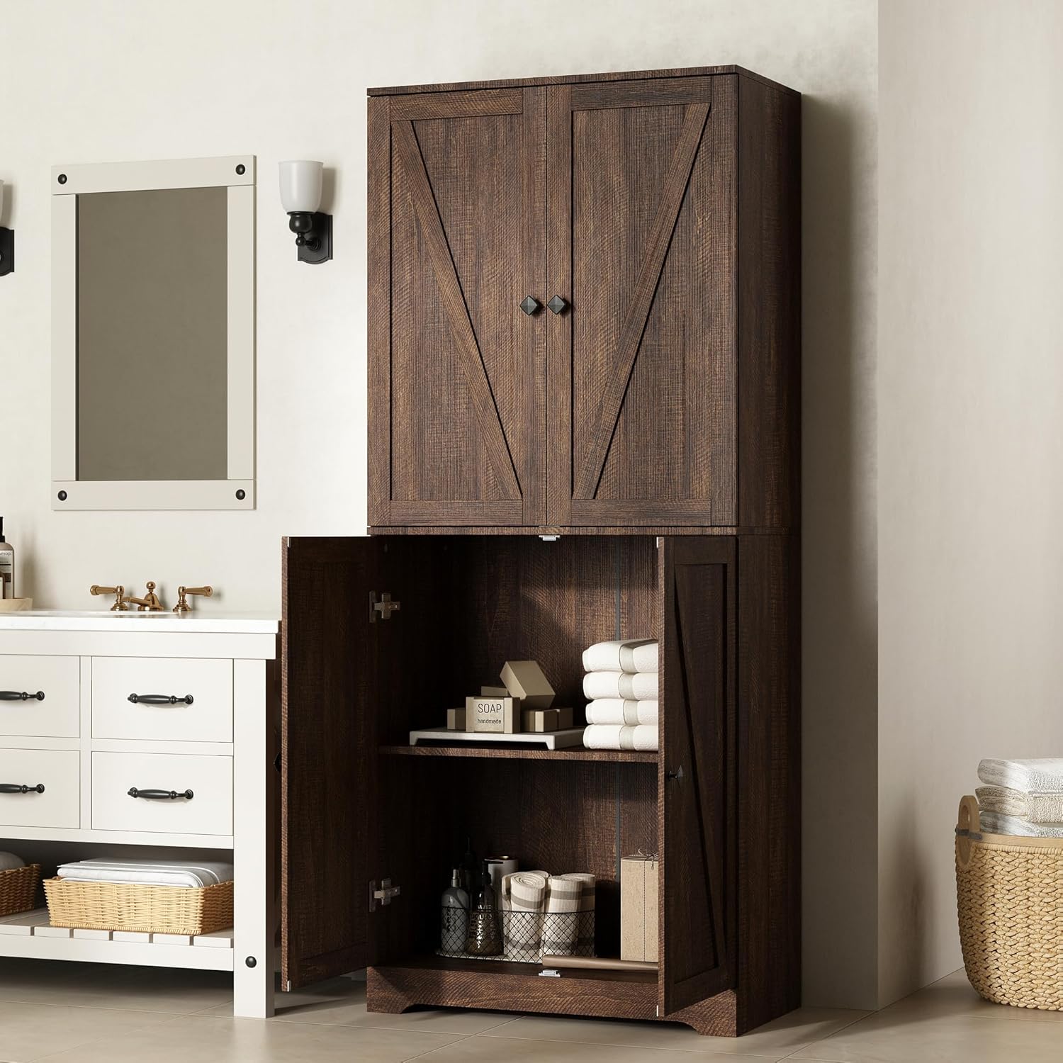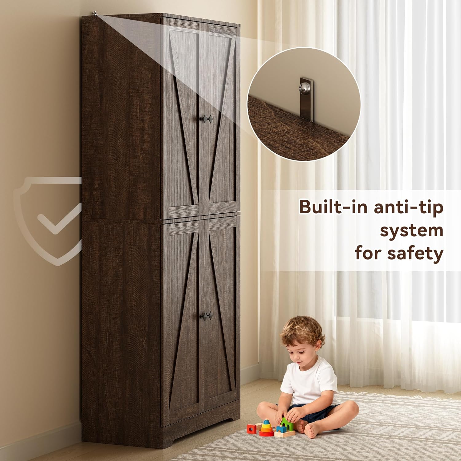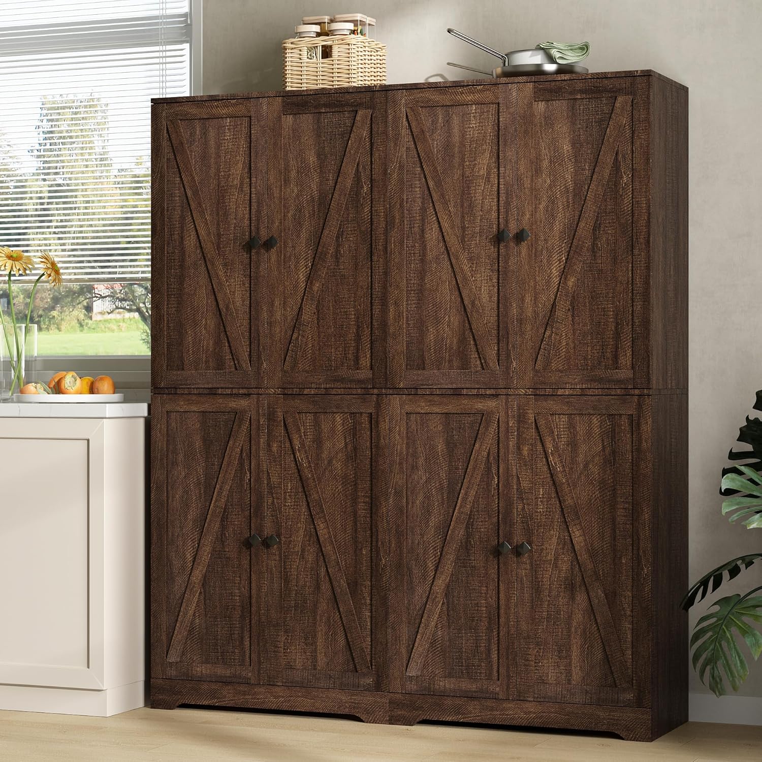 Farmhouse Style Pantry: With its sleek rectangular silhouette and 4 classic barn doors, this farmhouse kitchen pantry storage cabinet showcases a rustic wood texture finish accented by squre metal knobs. Available in three stunning colors: white, black, and ash greythis pantry storage solution seamlessly blends with any decor.