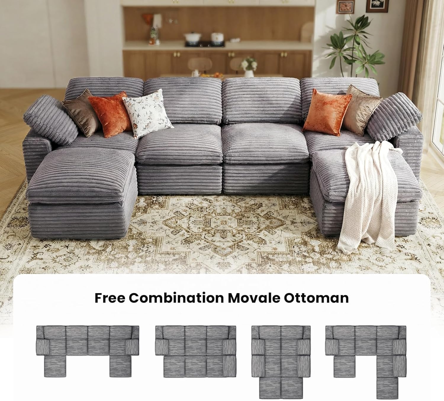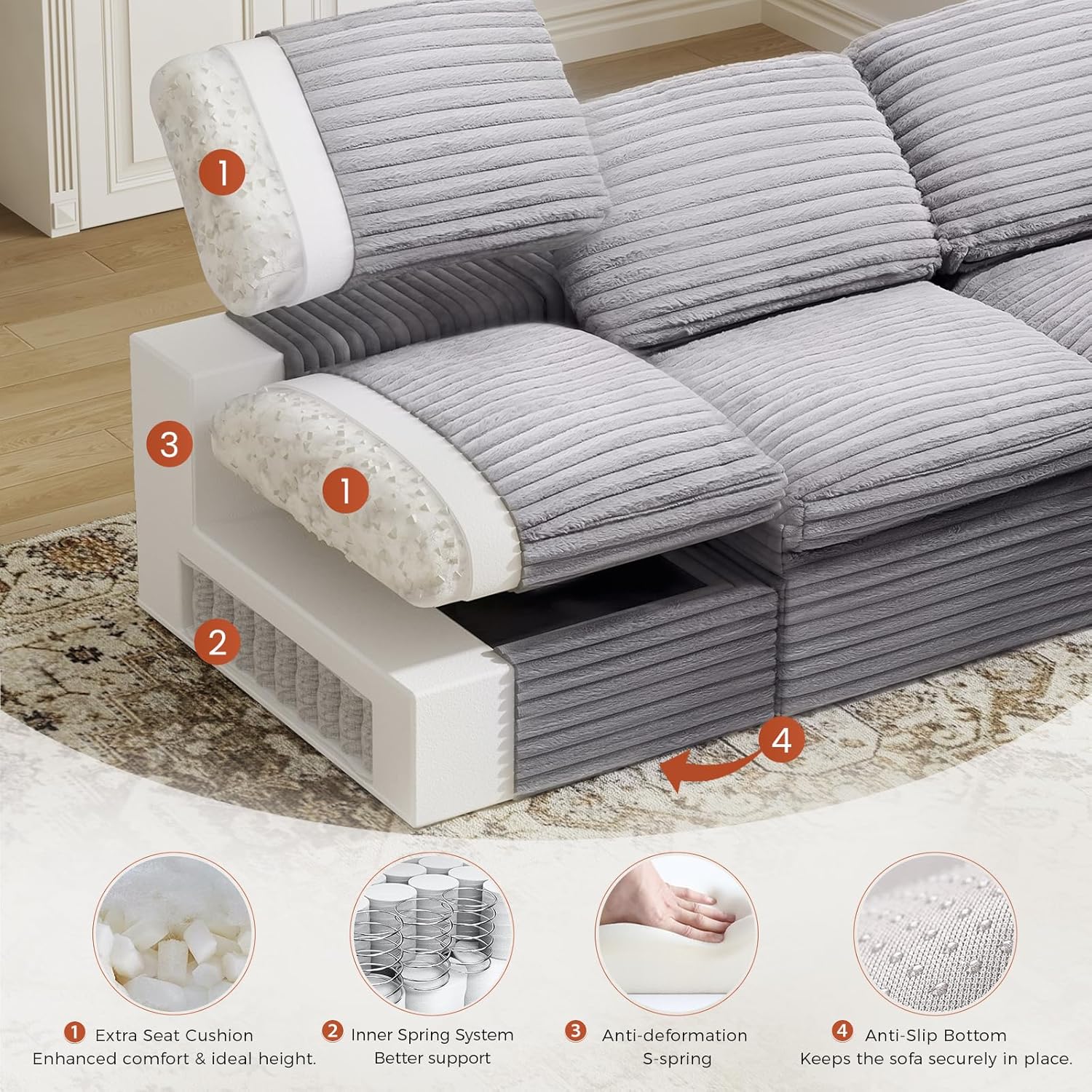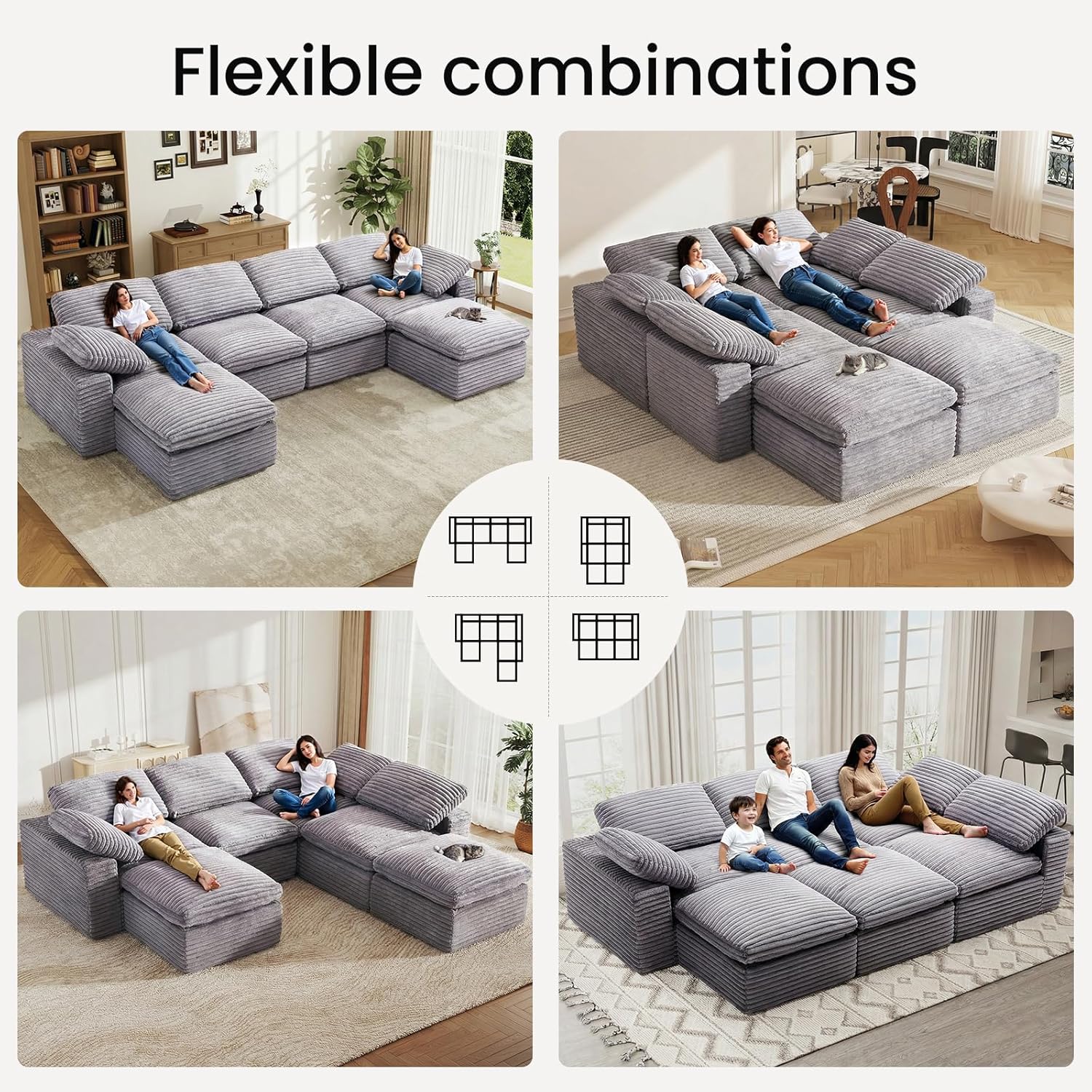 • 150" U Shaped Sectional Modular Boneless Sofa, 6 Seater Cloud Couch with Ottoman, Corduroy Sectional Couches for Living Room Bedroom, Grey