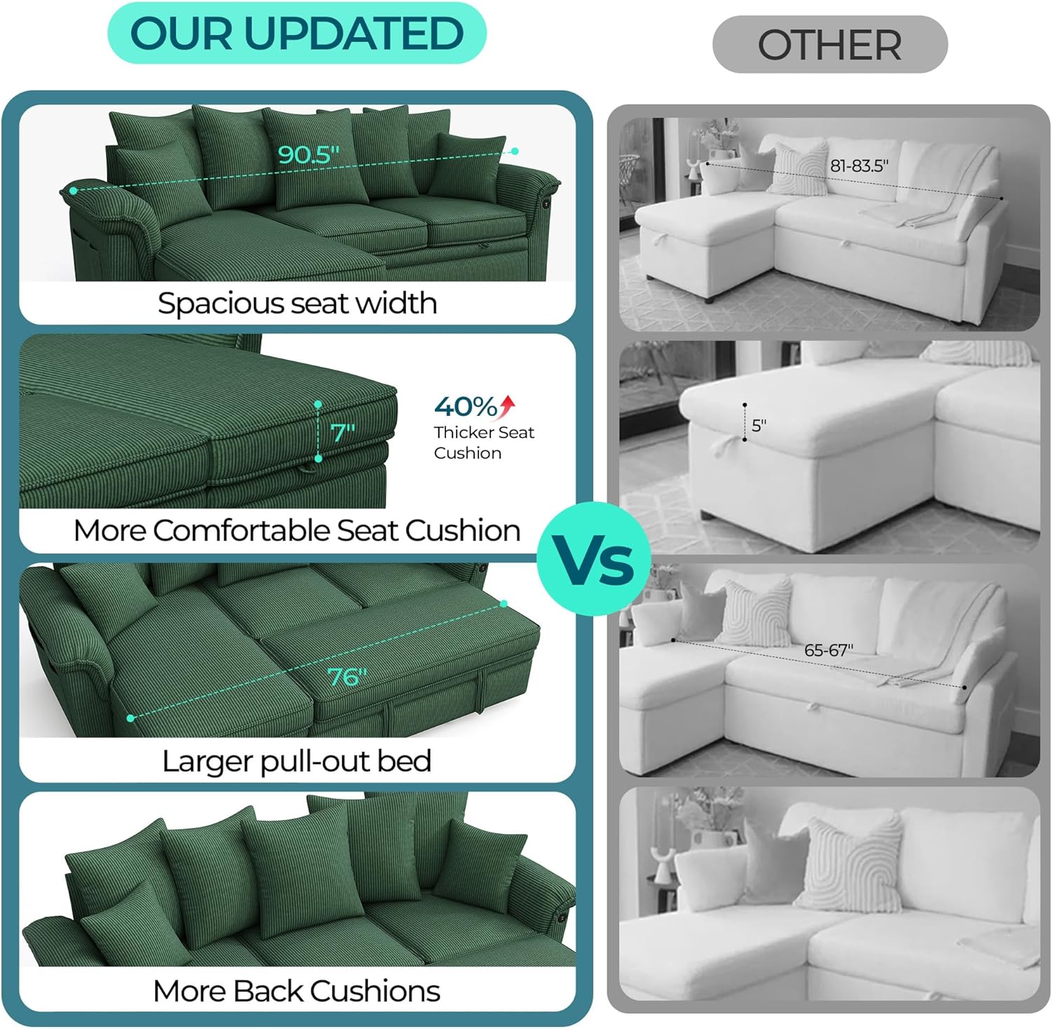 Easy Pull-Out Couch Bed Larger Size: Effortlessly convert this sleeper sofa into a spacious bed by simply pulling it outno tools or complex steps required. Now available in a larger size with extra back cushions for enhanced comfort and support