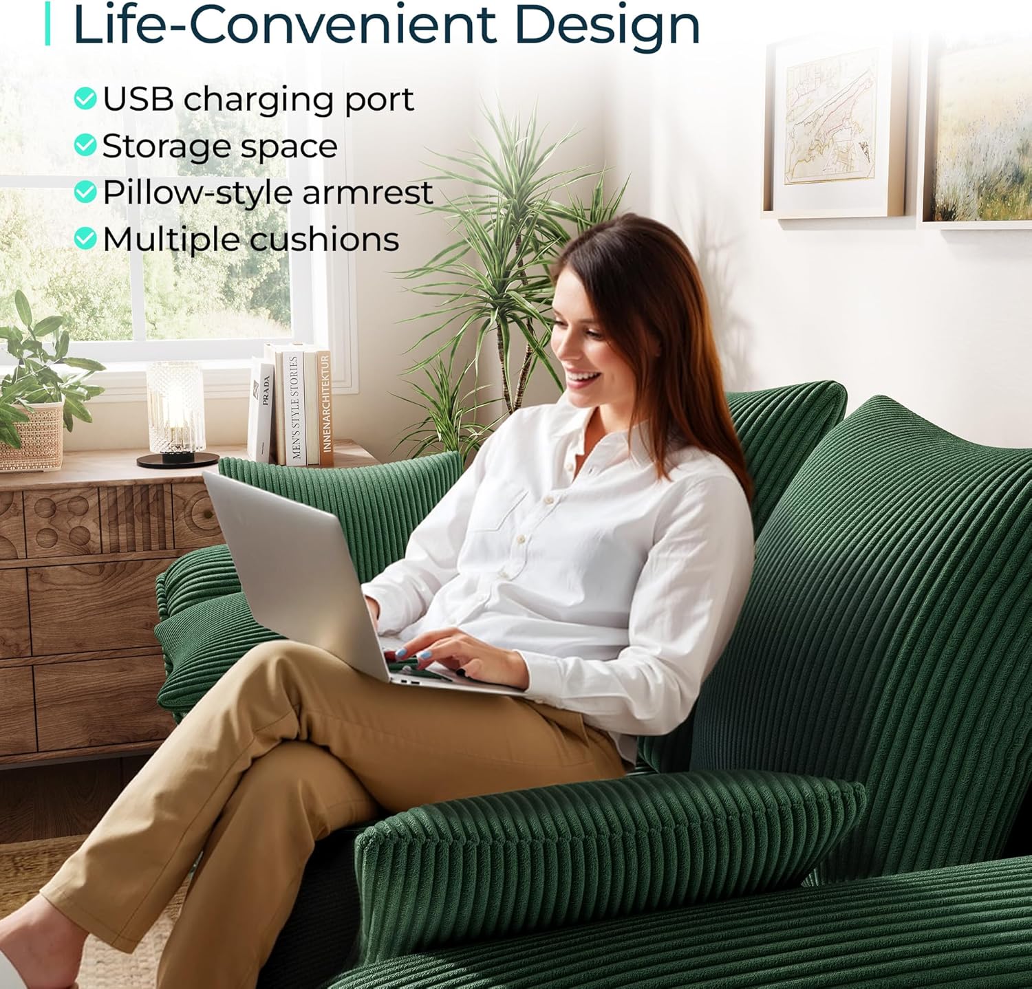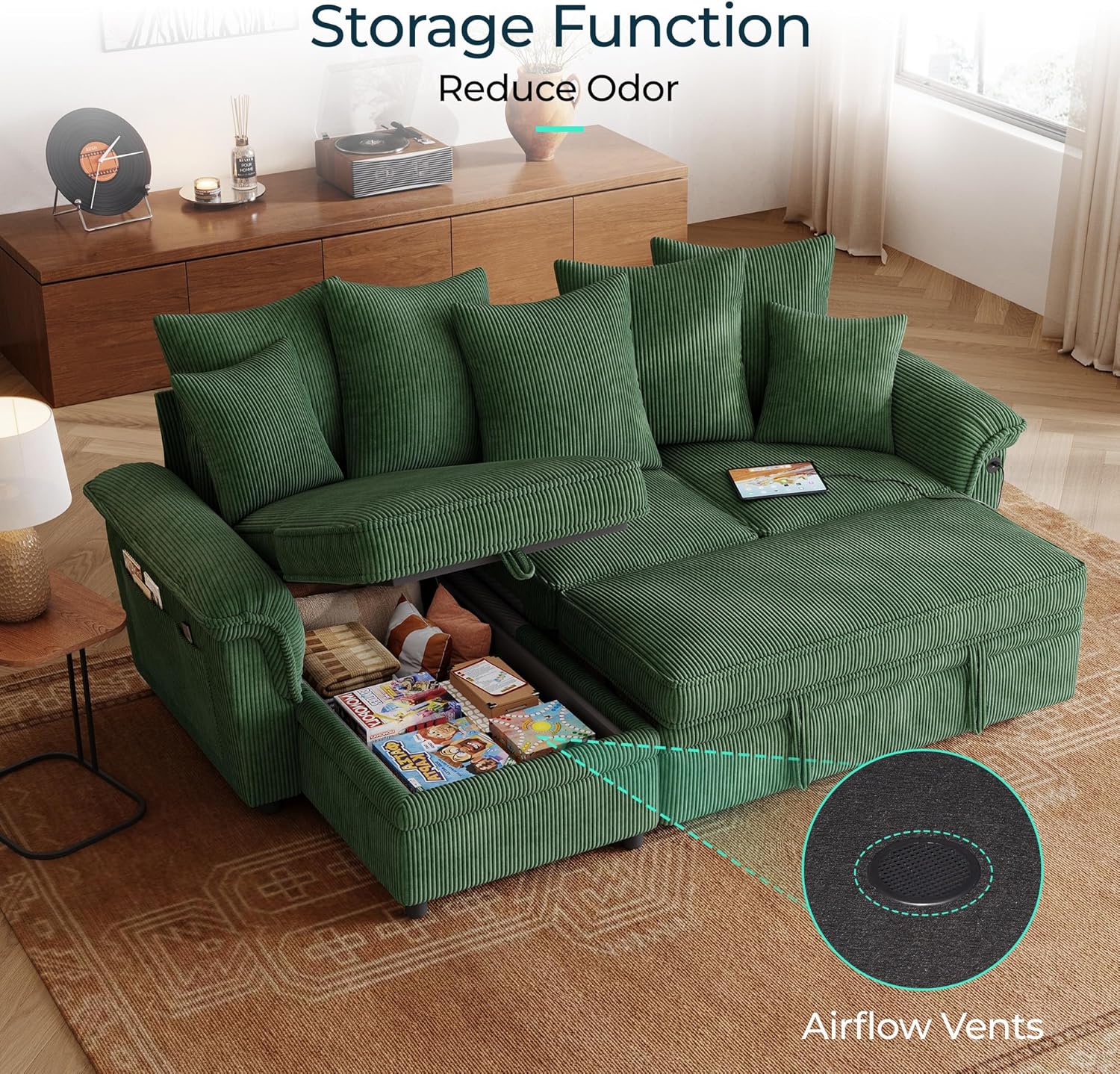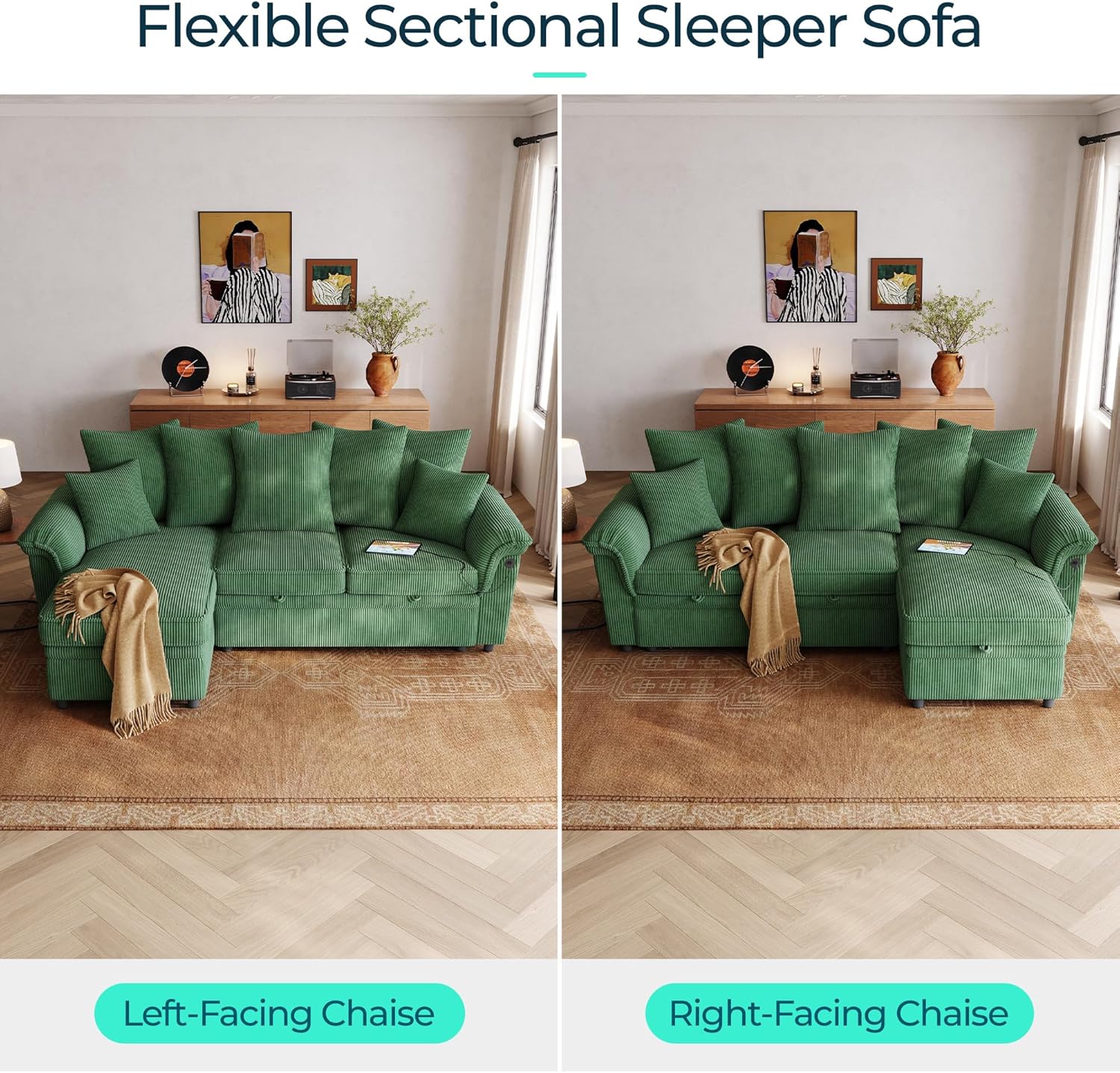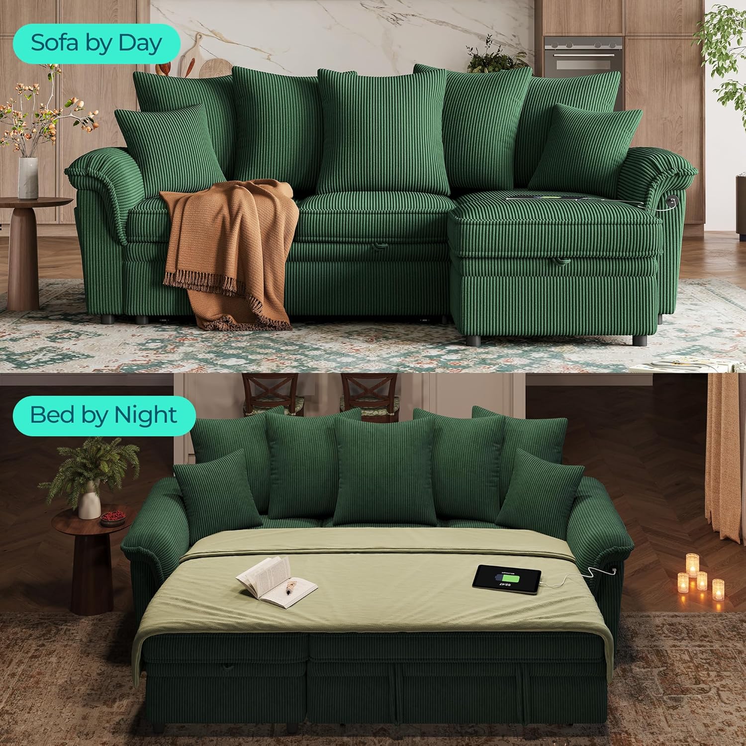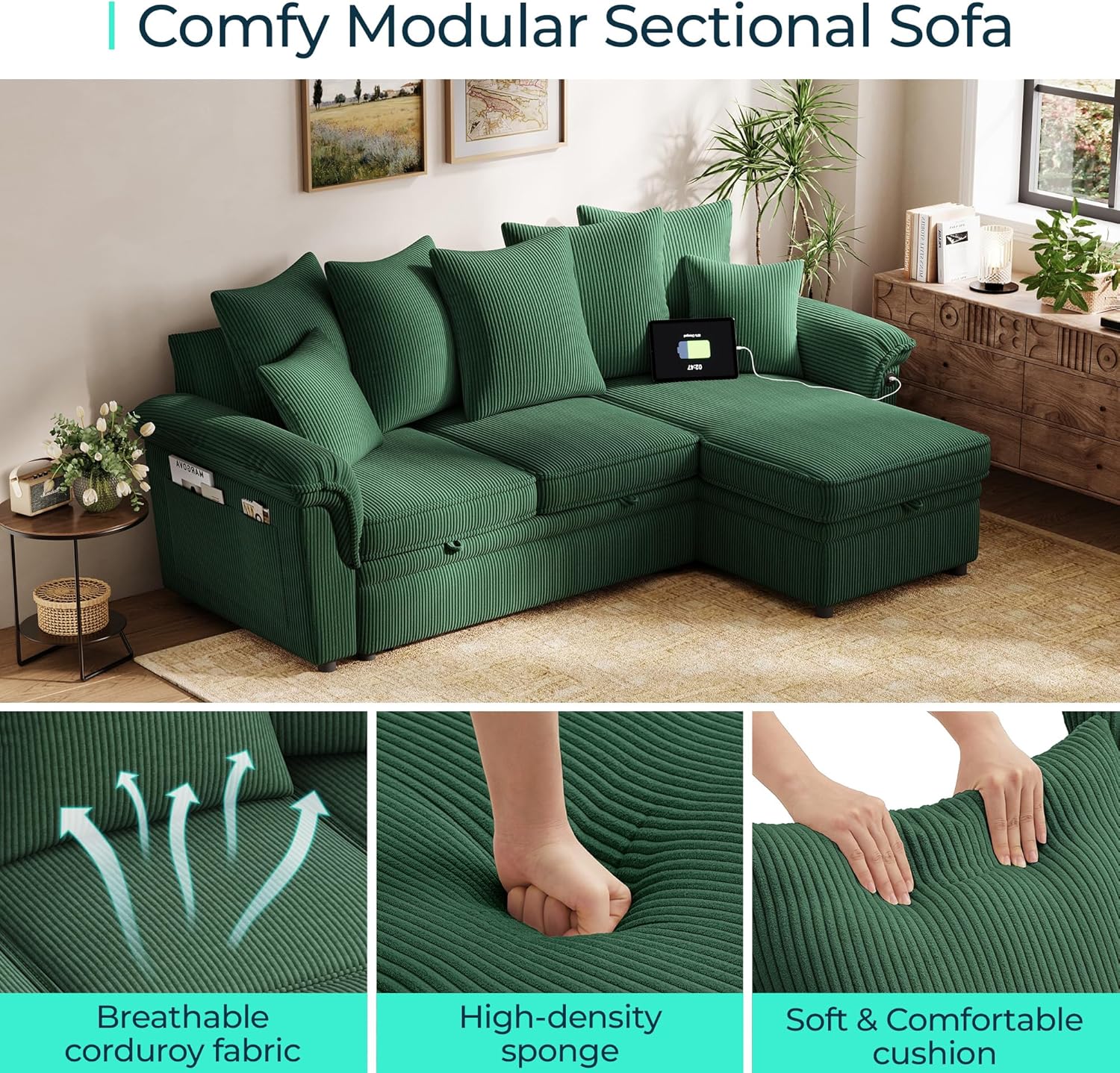 • 90.5'' Sectional Sleeper Sofa with Pull Out Couch Bed Modular (Green, 90.5'') | USB Charging, Pillow-style Armrest, Multiple Cushions, Storage Chaise, Corduroy Fabric